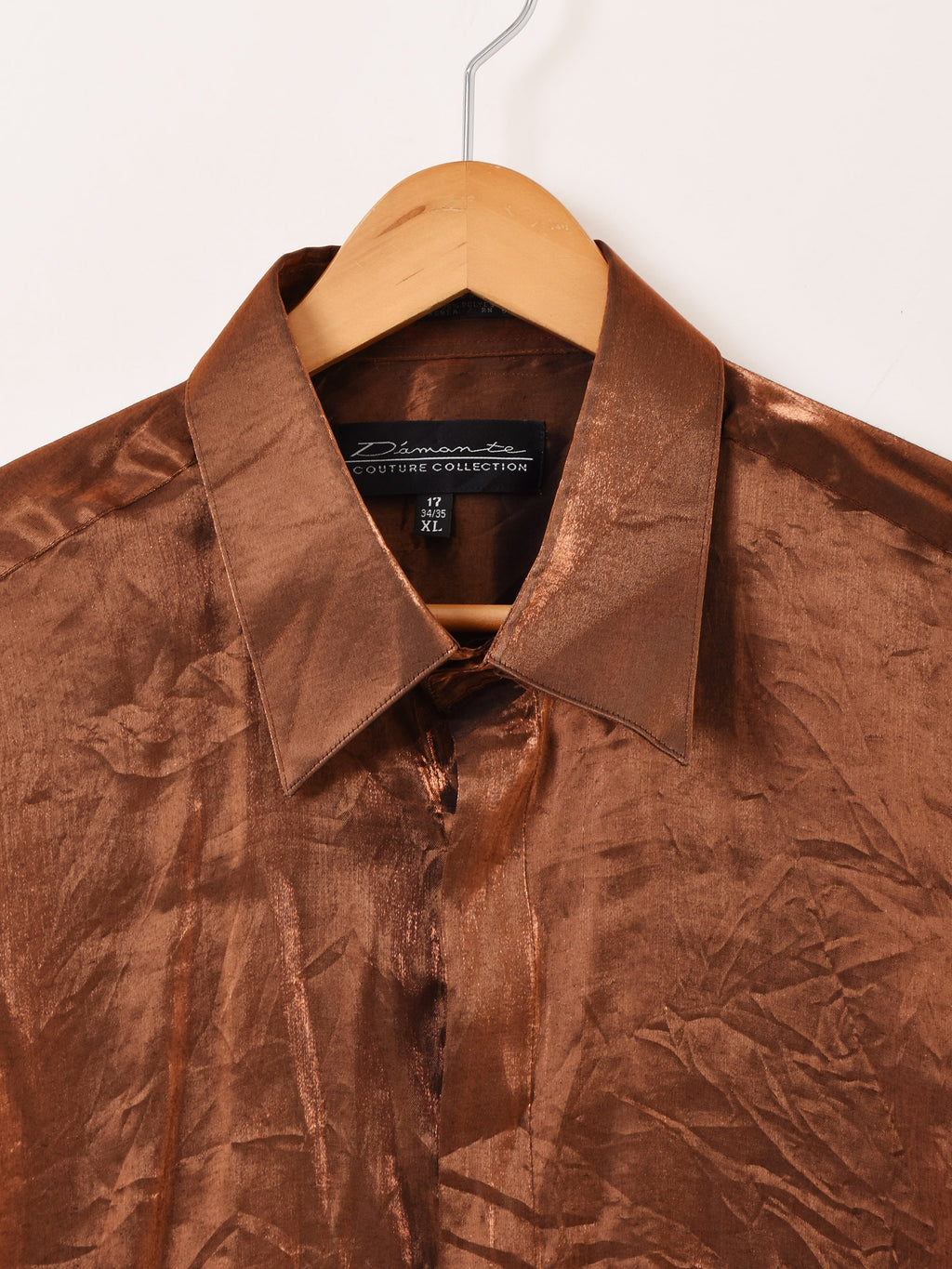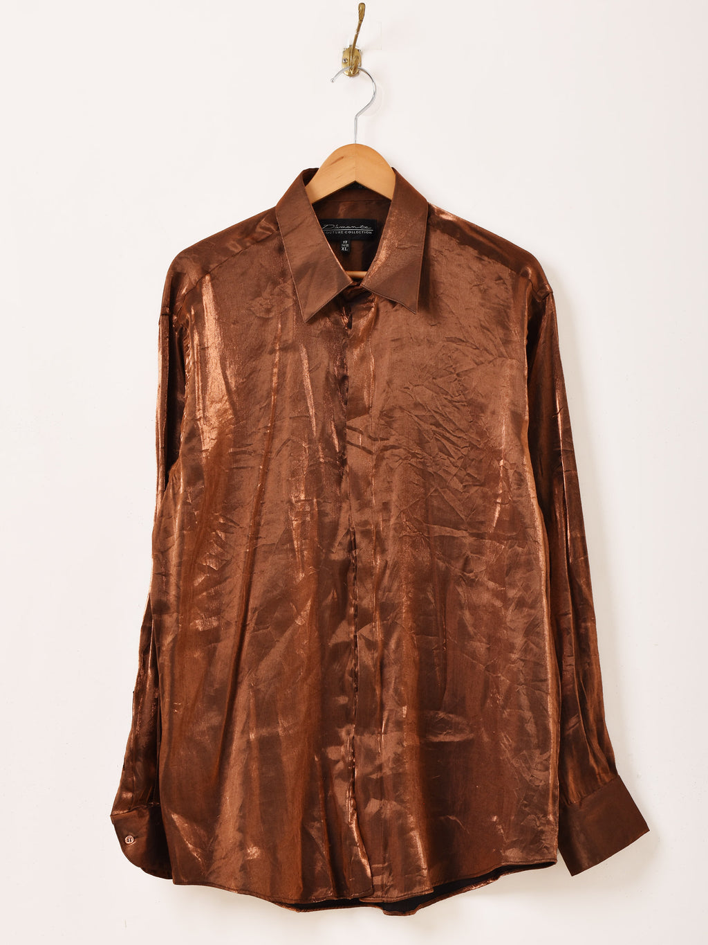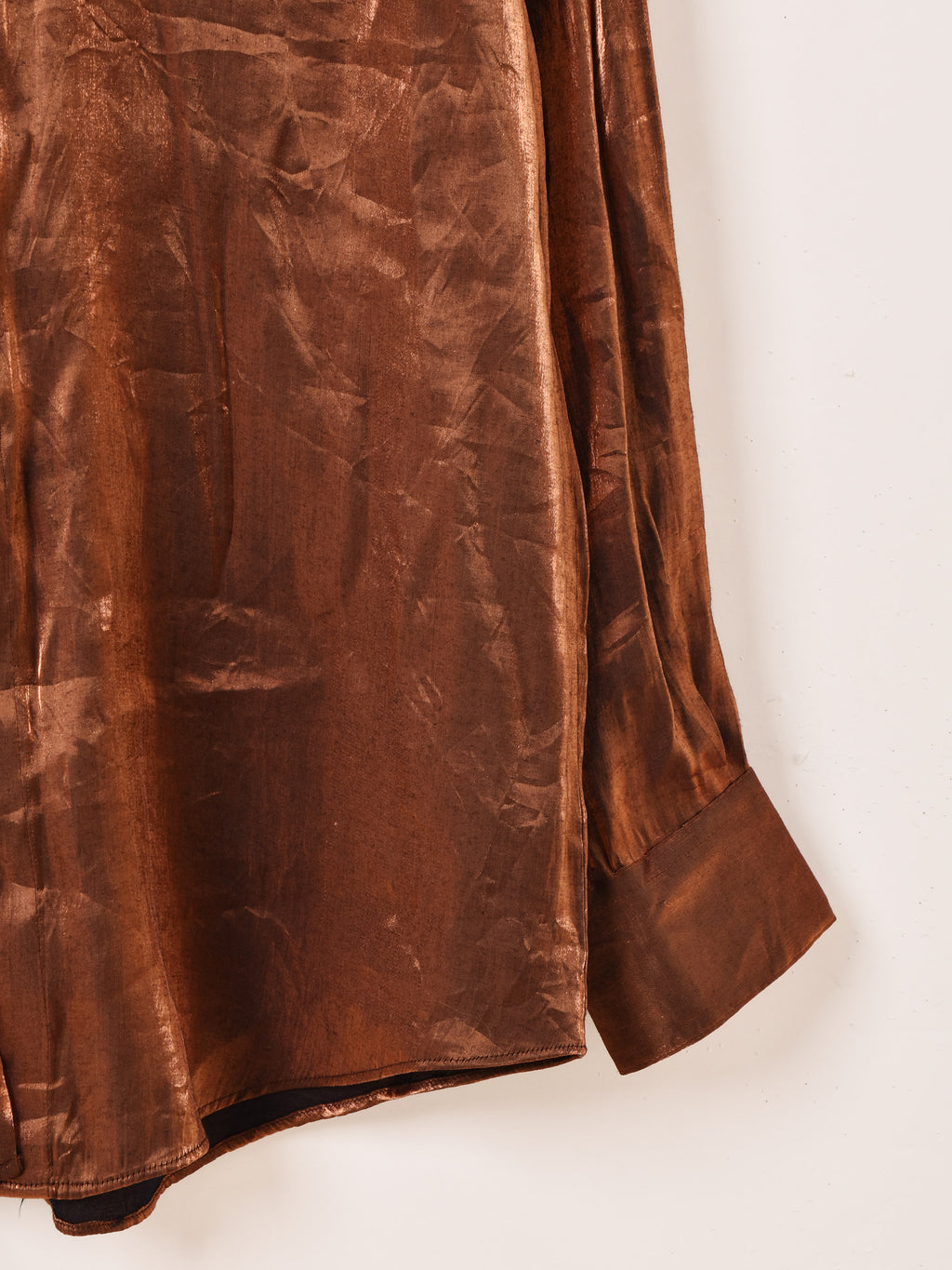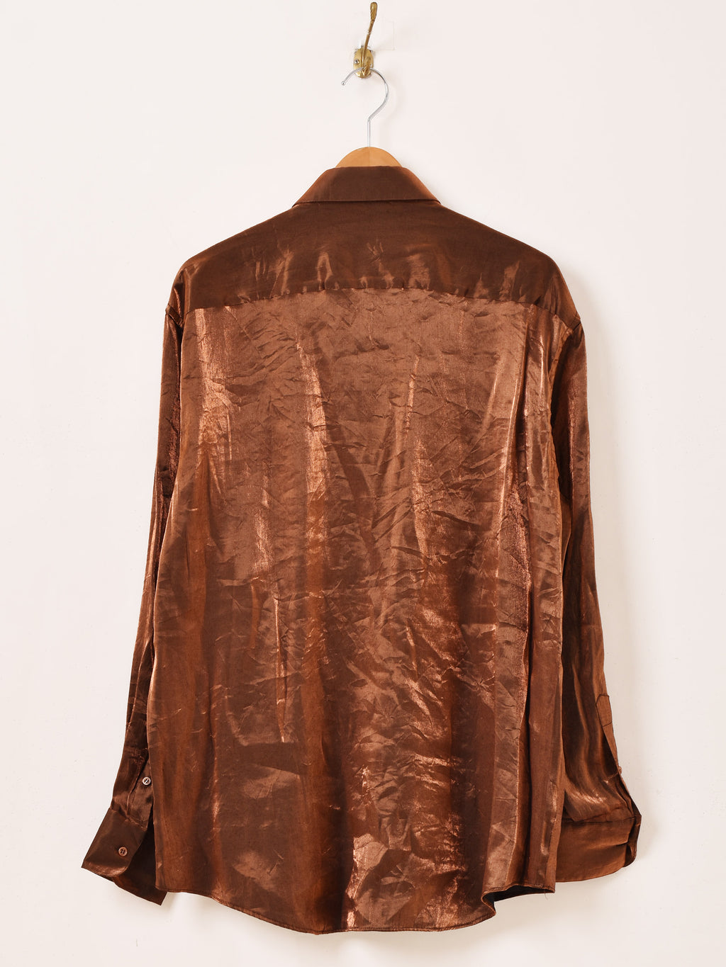 角度によってサテンの輝きを楽しめる長袖シャツ。とろみのある生地感で、ドレッシーな着こなしにおすすめです。