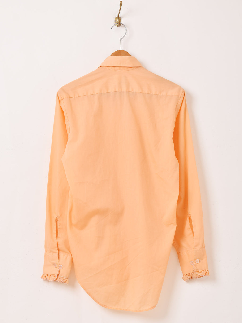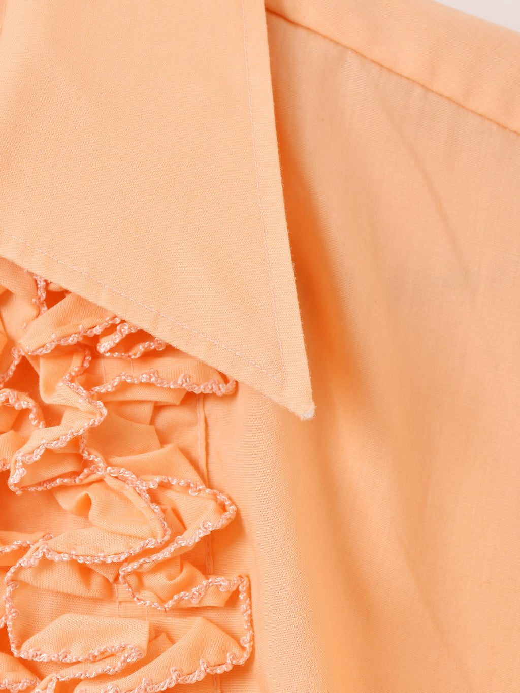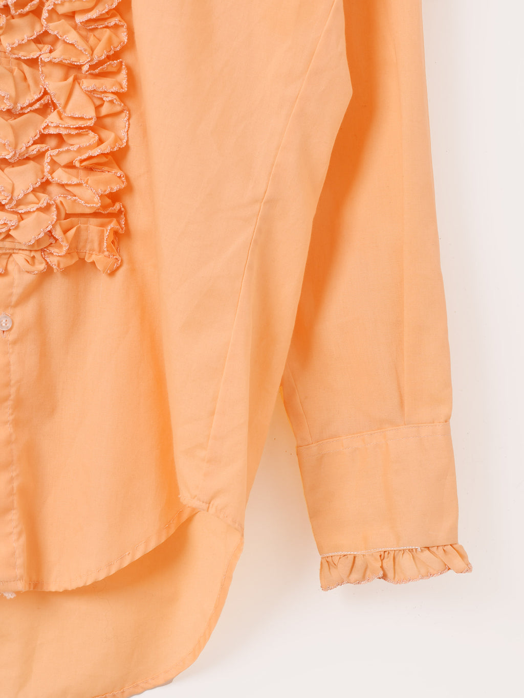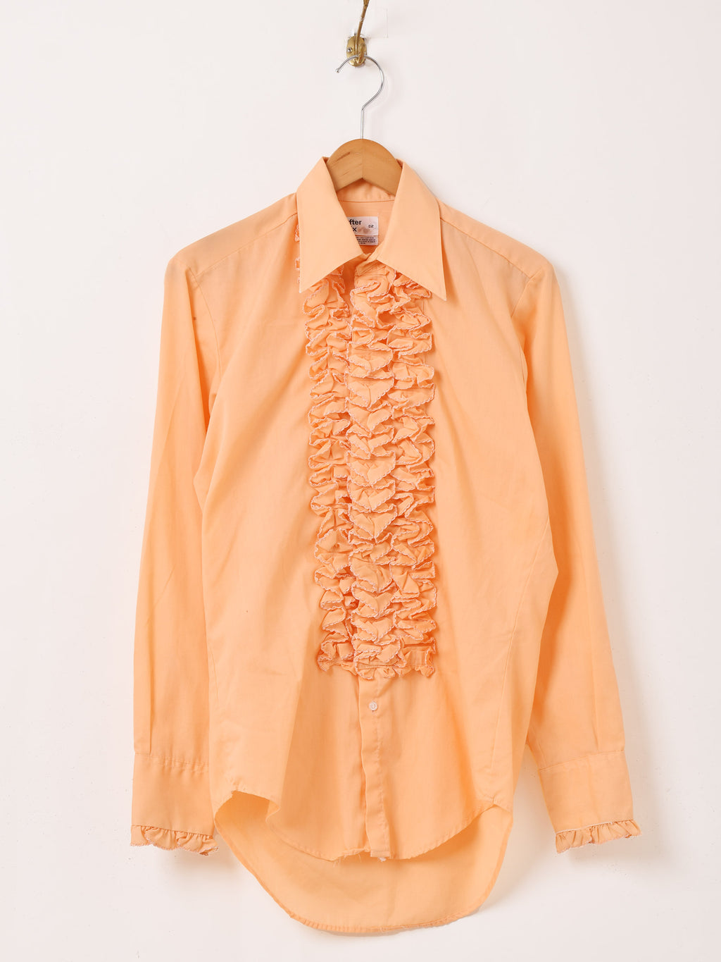 70年代頃のアフターシックスの長袖シャツ。オレンジボディにフリルをたっぷりとあしらい、華やかでヒッピーな雰囲気が◎。袖はカフス仕様、ドレッシーな着こなしにおすすめです。