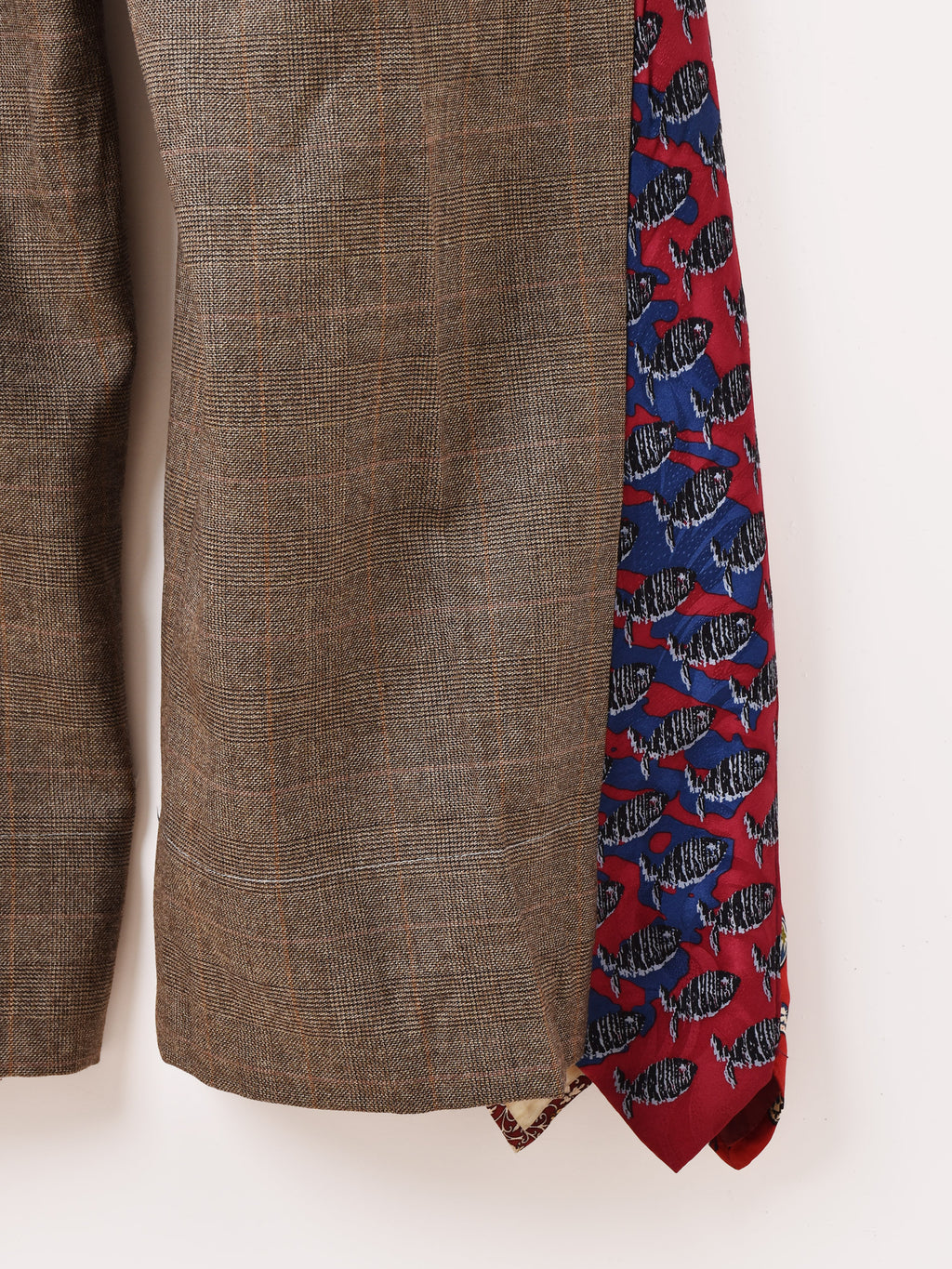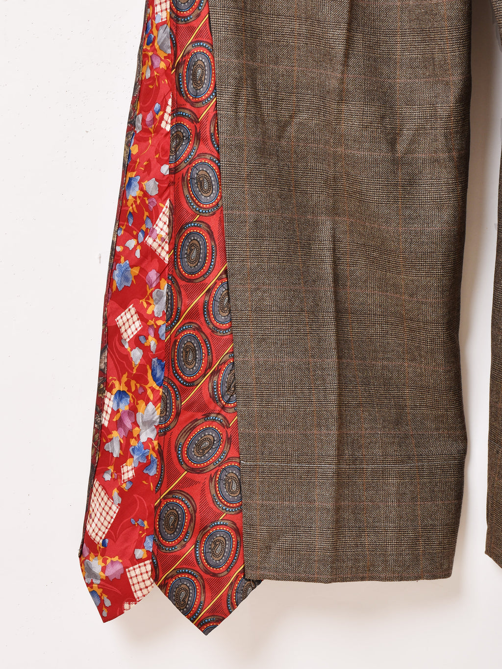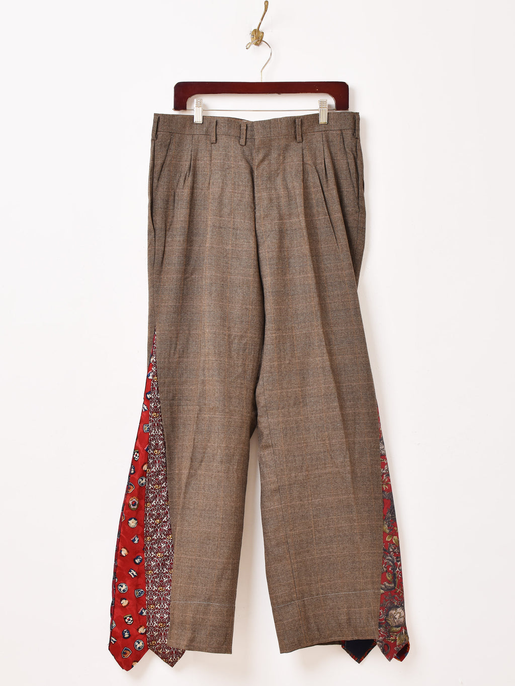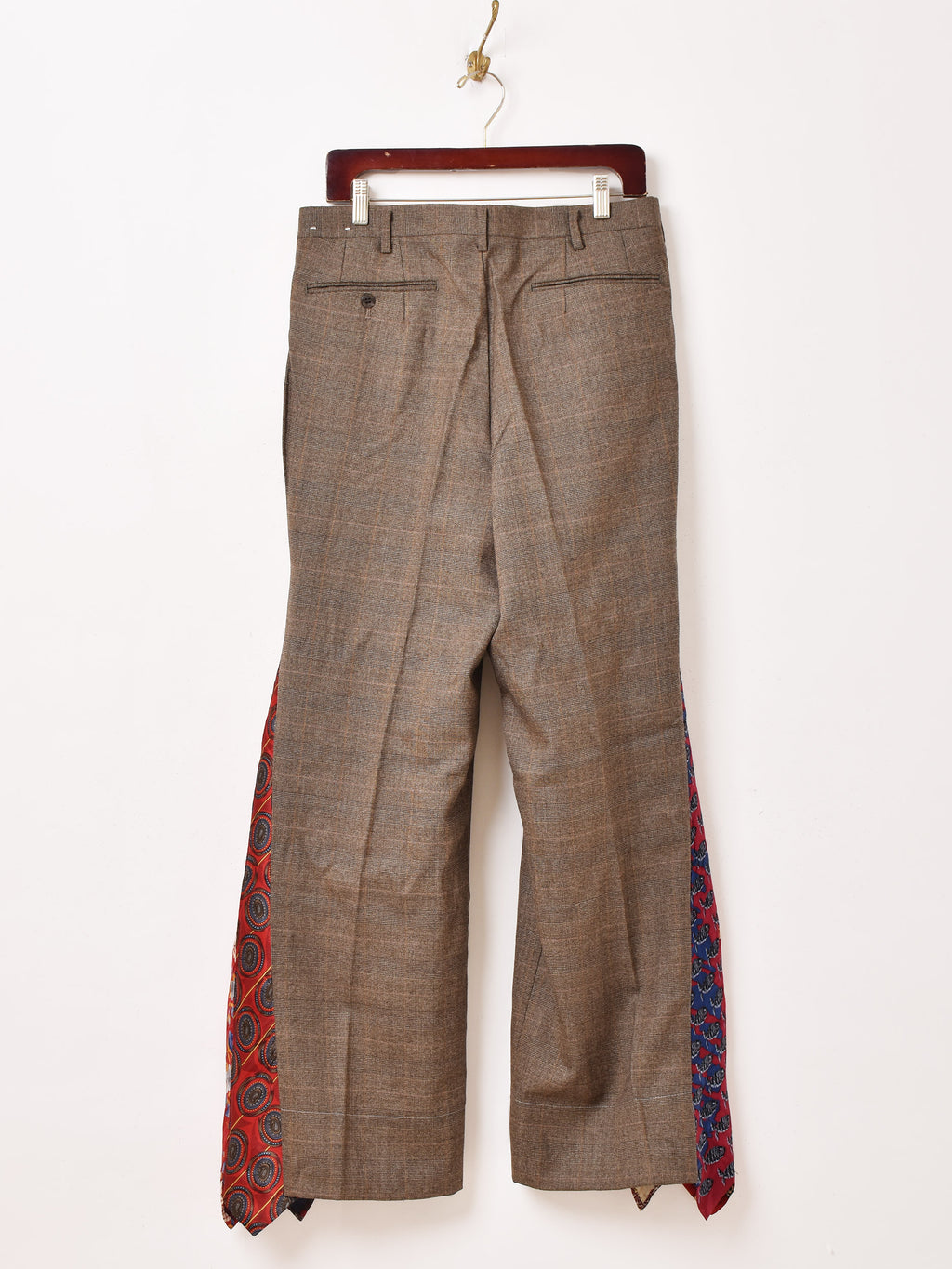 グレンチェック柄のスラックスに、古着のネクタイをドッキングさせたリメイク商品。絶妙なフレアシルエットで脚長効果も期待できそう。コーディネートのアクセントになること間違いなしの一着です。