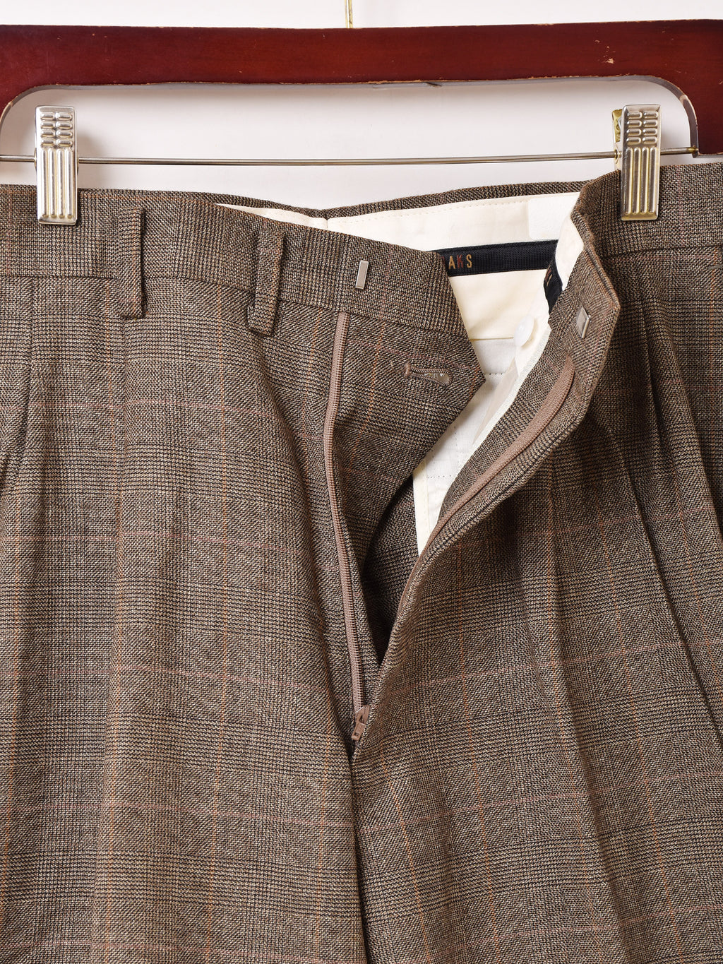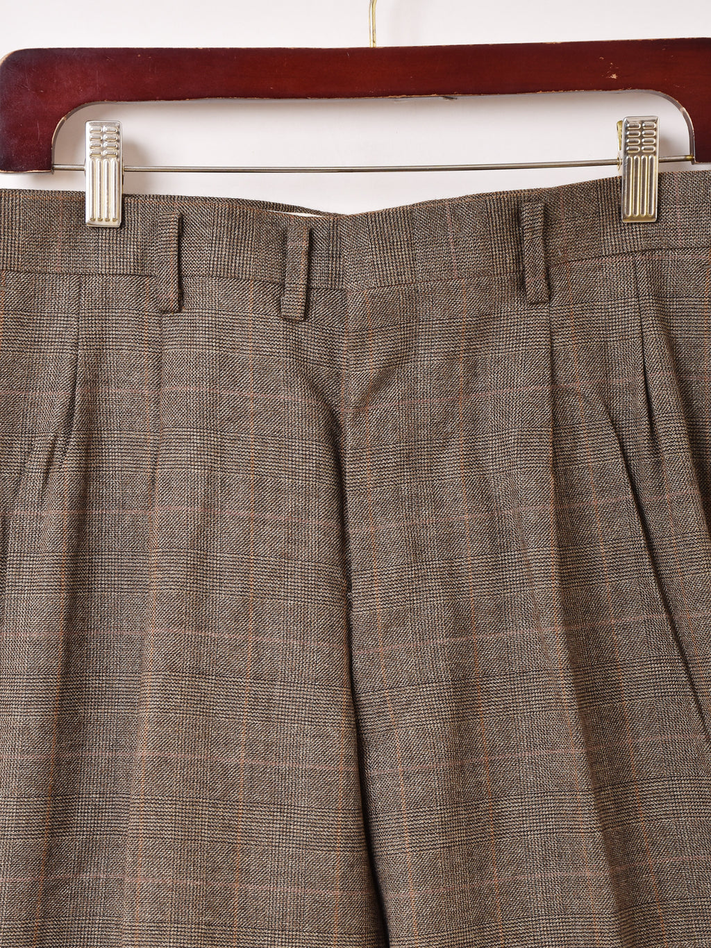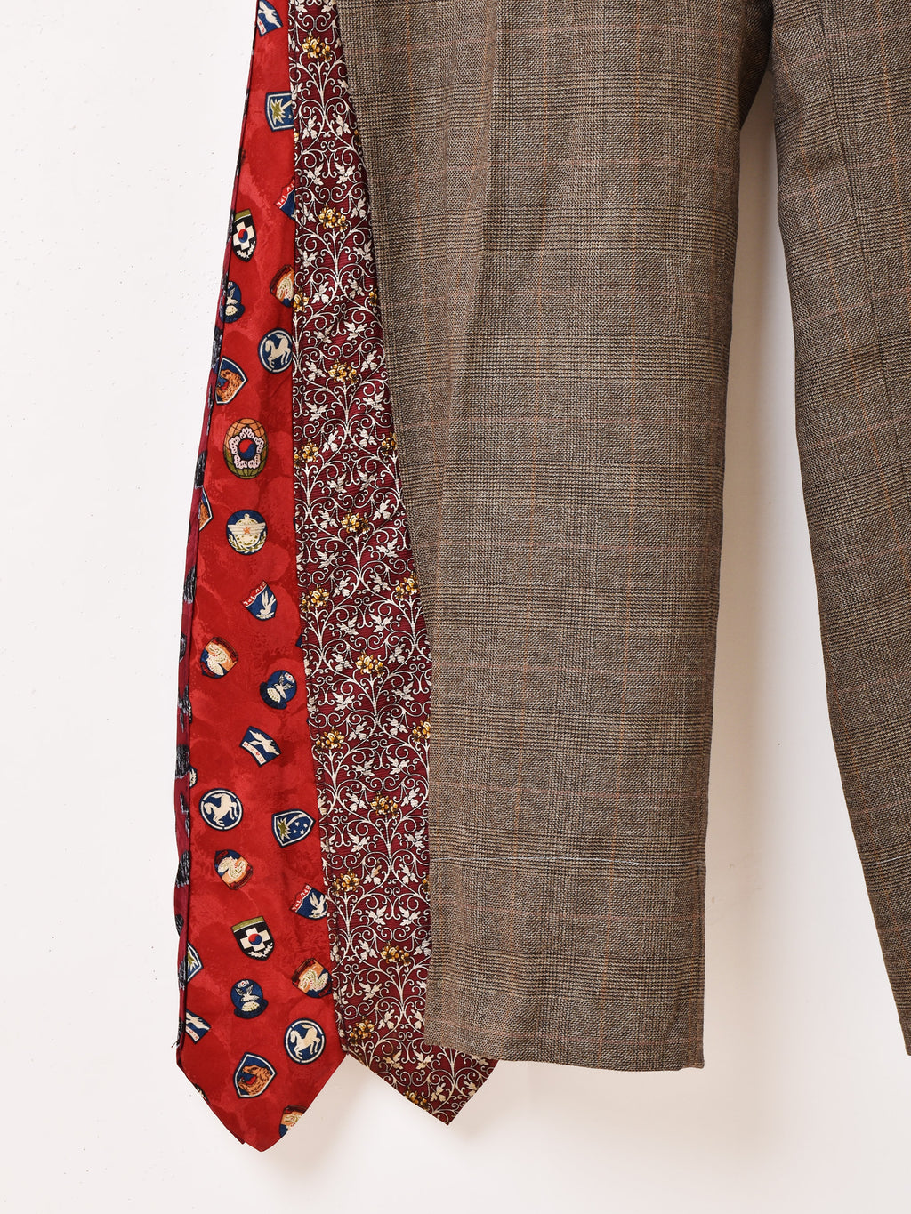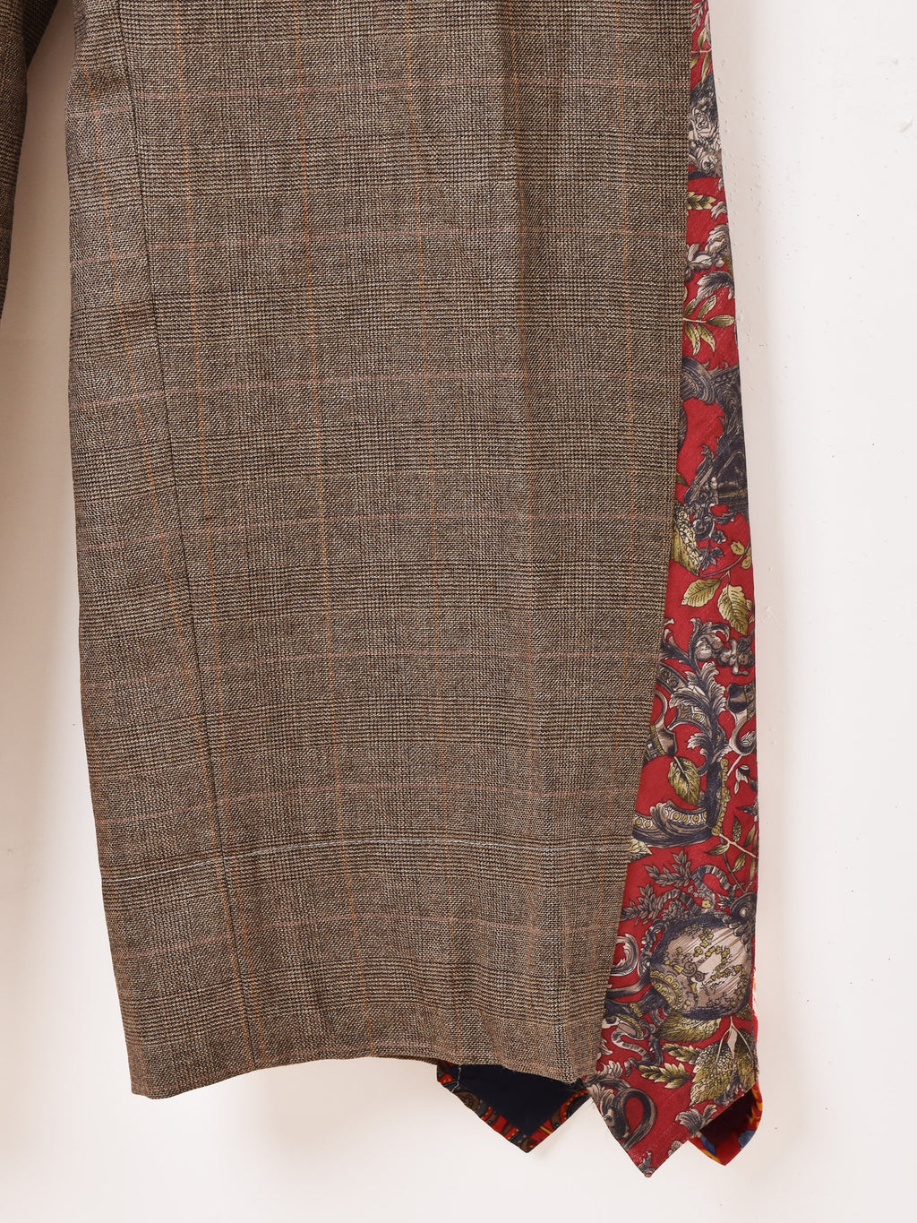 グレンチェック柄のスラックスに、古着のネクタイをドッキングさせたリメイク商品。絶妙なフレアシルエットで脚長効果も期待できそう。コーディネートのアクセントになること間違いなしの一着です。