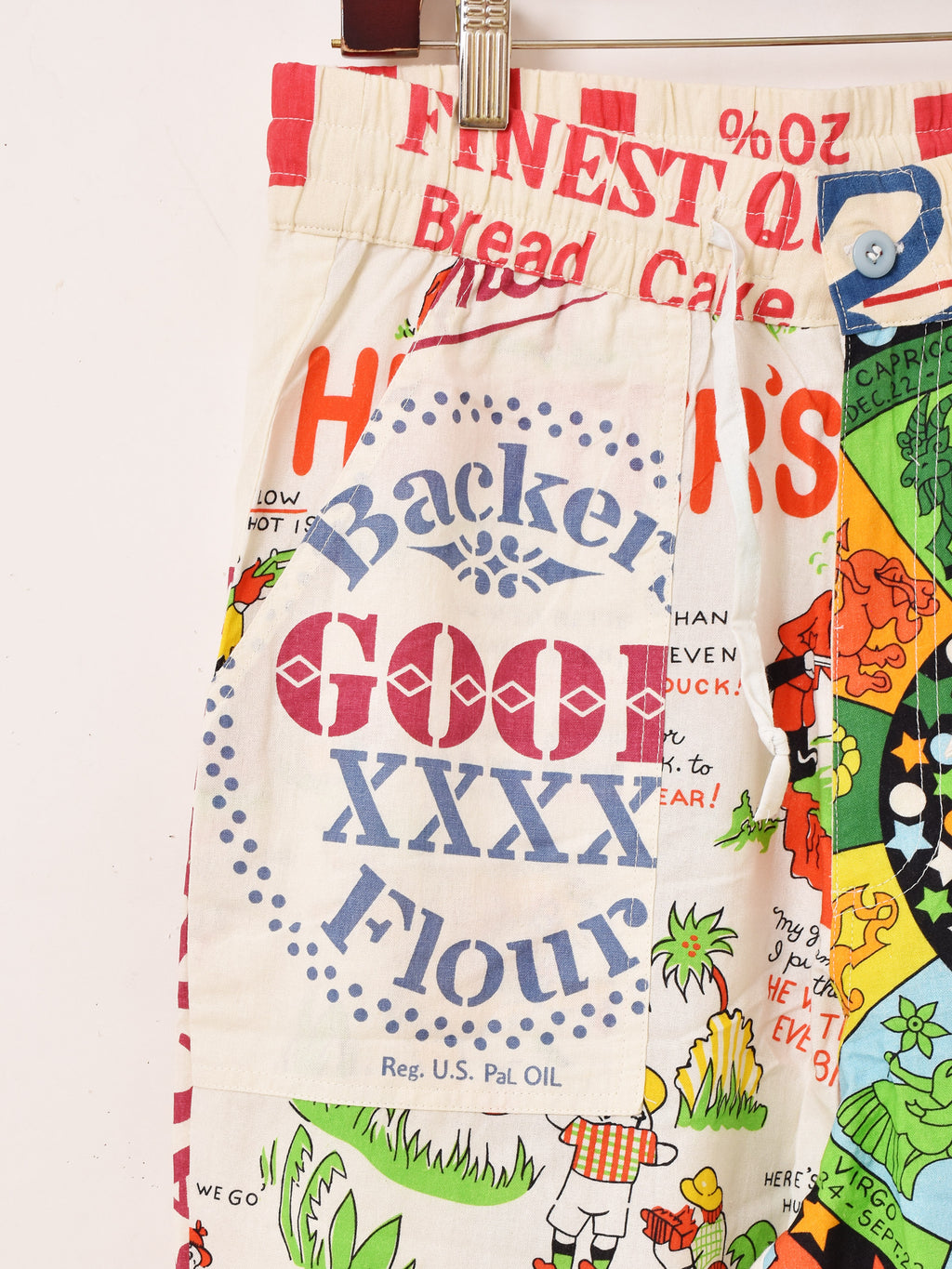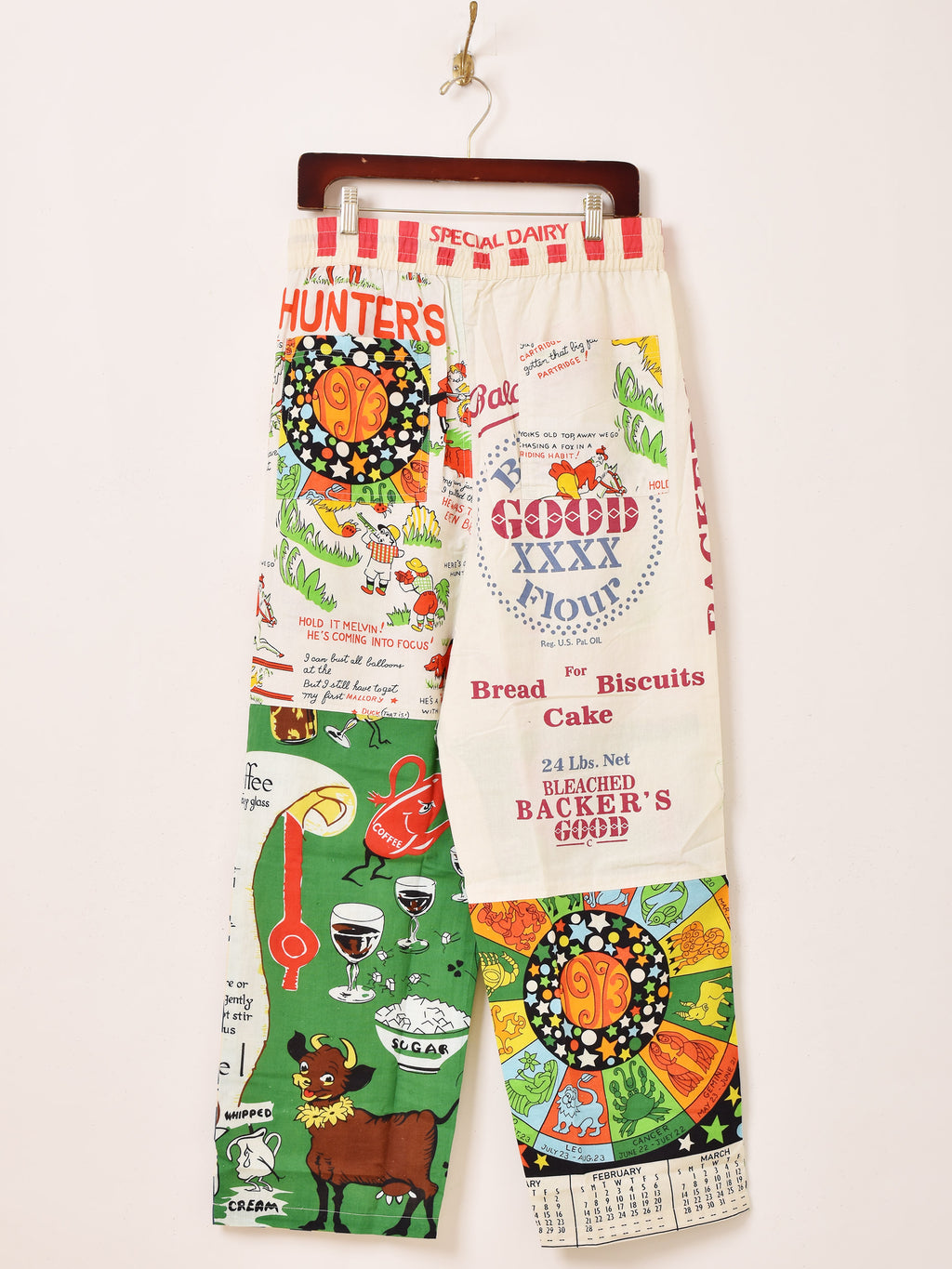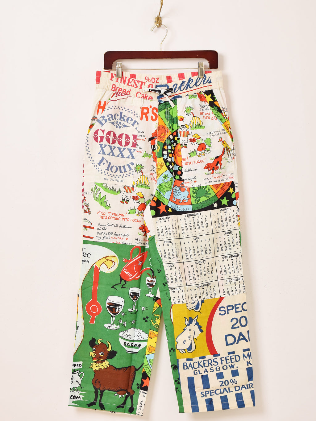 様々なズタ袋のパッケージデザインをパッチワークして仕立てたイージーパンツ。生地にはBackers(バッカーズ)の歴代フィードサックアイテムの柄を使用した贅沢な一着です。古着のような風合いとデザインがコーディネートの主役におすすめです。ウエストはゴム紐仕様、フリーサイズで着用いただけます。