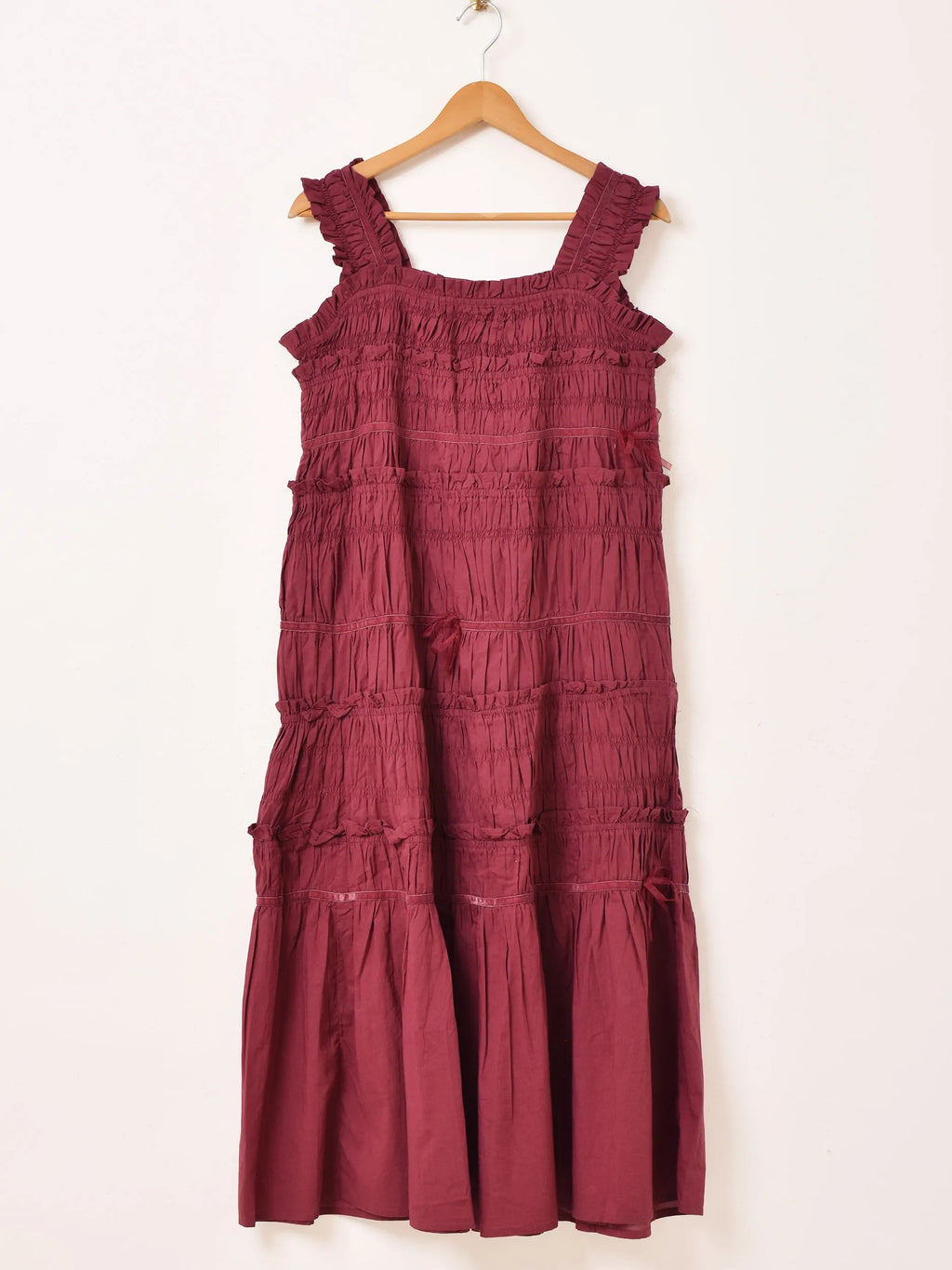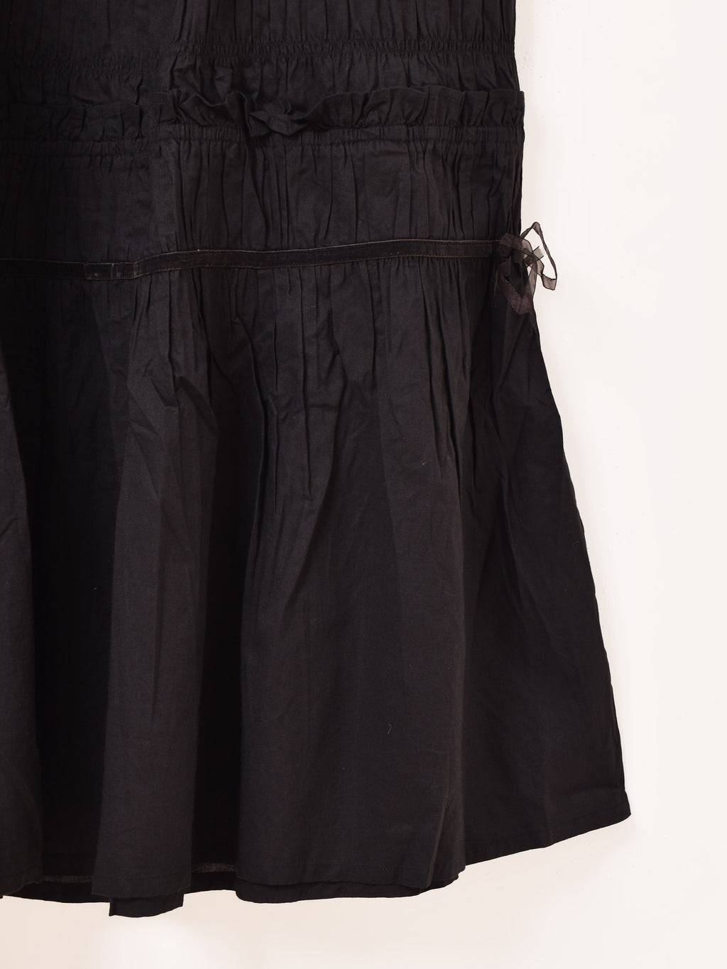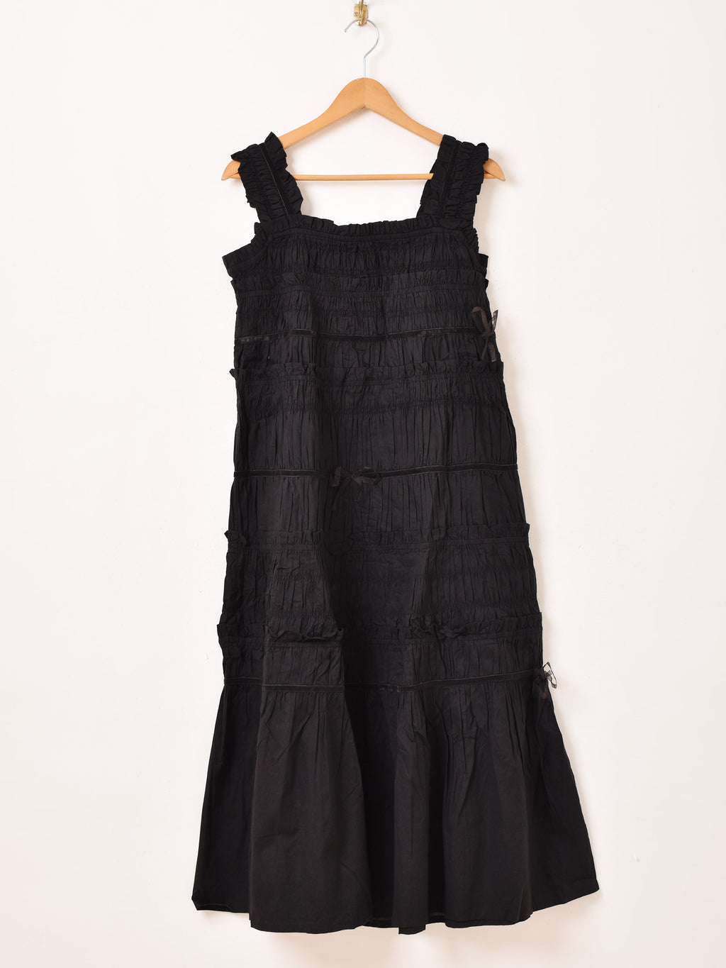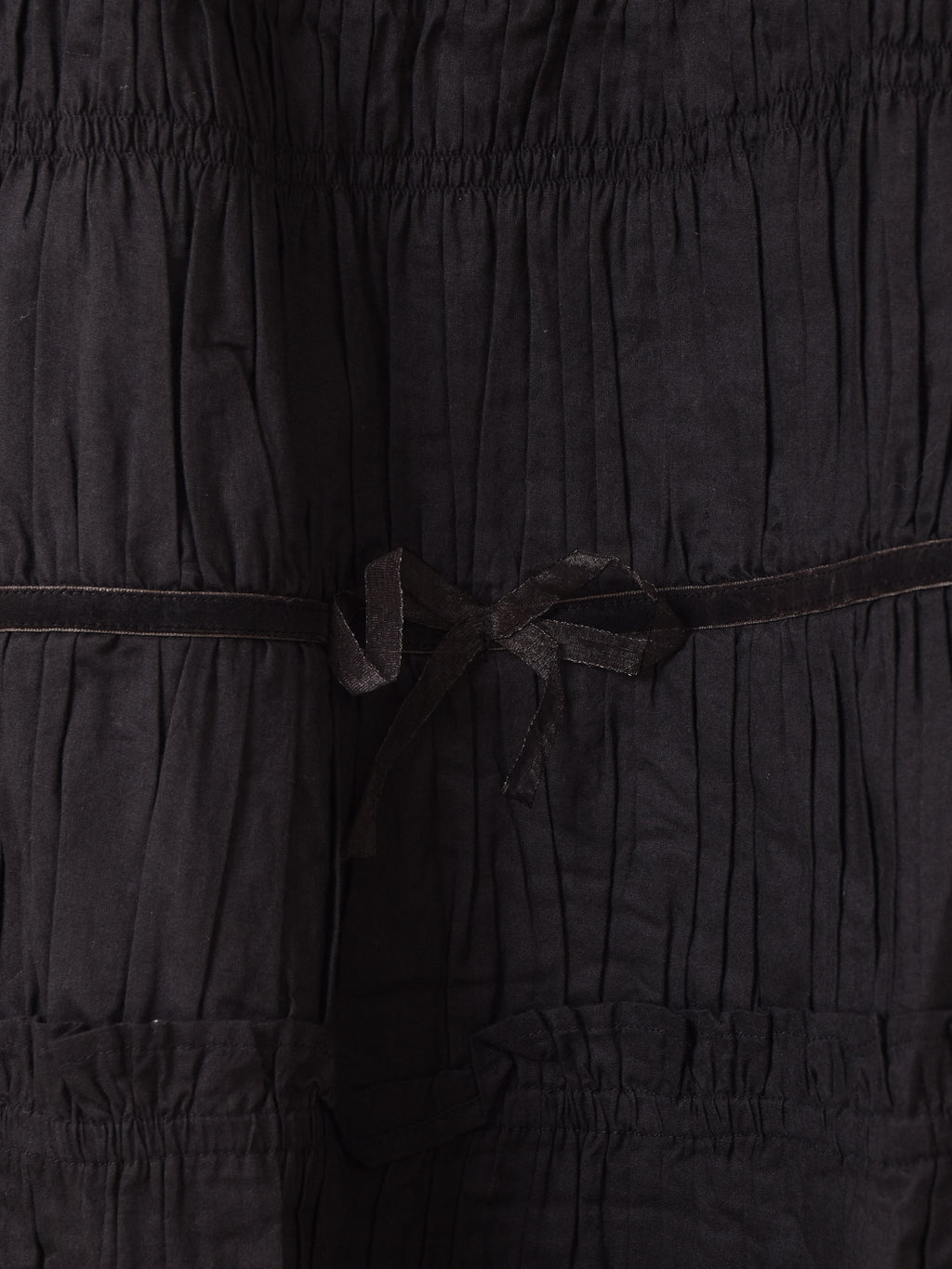 全体にたっぷりのシャーリング加工を施したキャミワンピ。程よいボリューム感とゆったりめのシルエットが可愛い一着です。所々にベロアのテープと、シアーのリボンをあしらったデザインがポイント。レイヤードコーデにもおすすめの一着です。