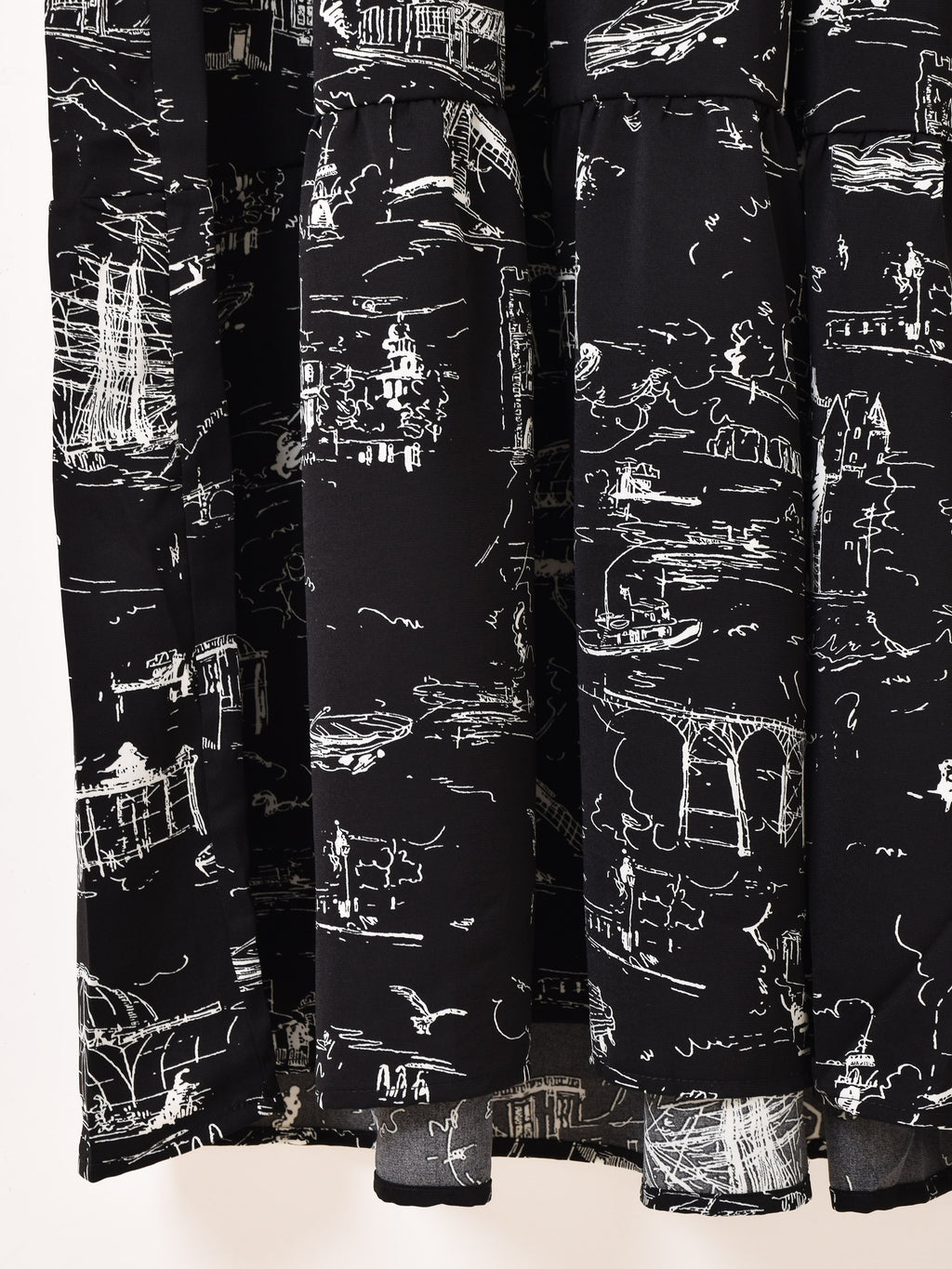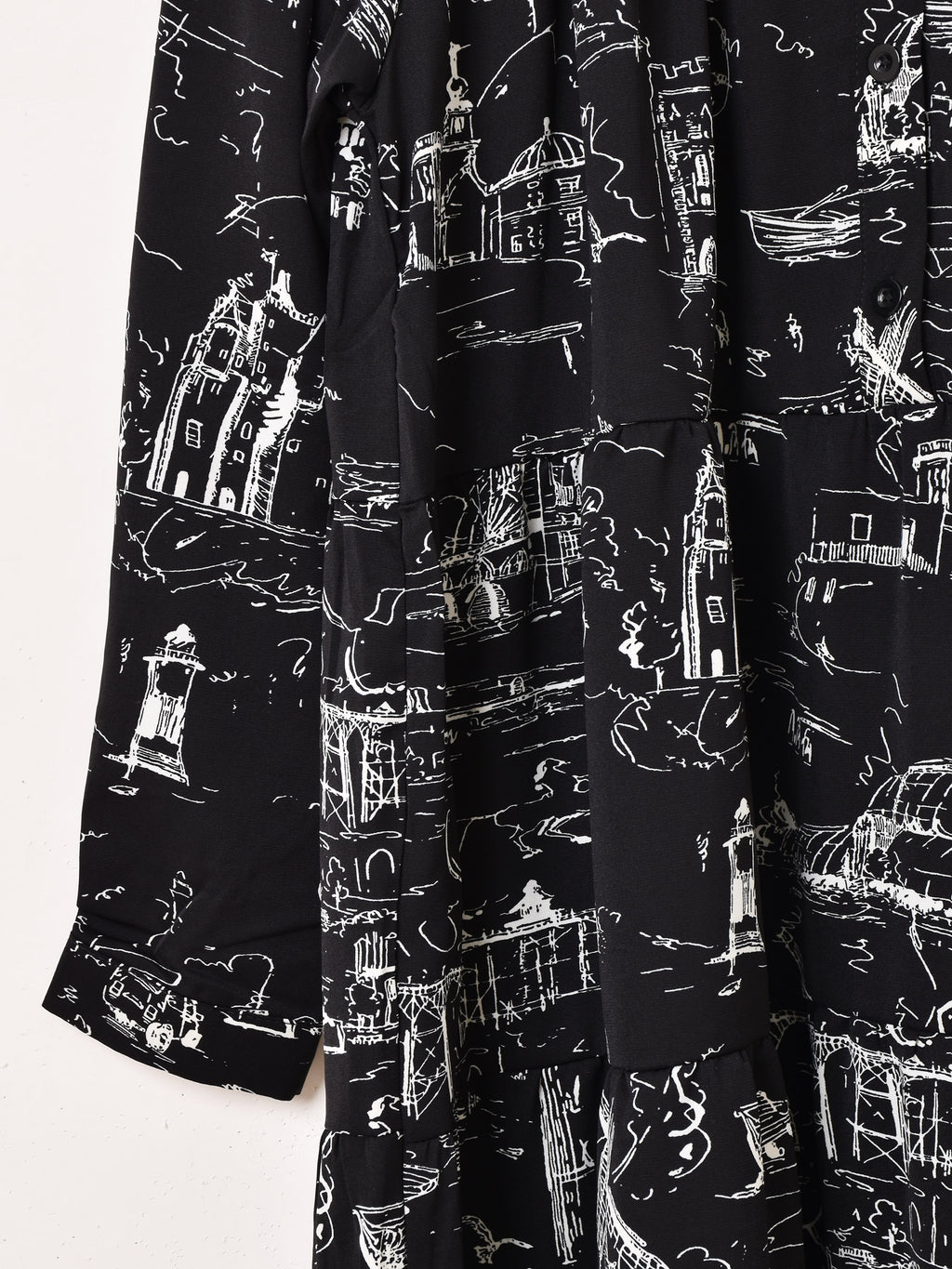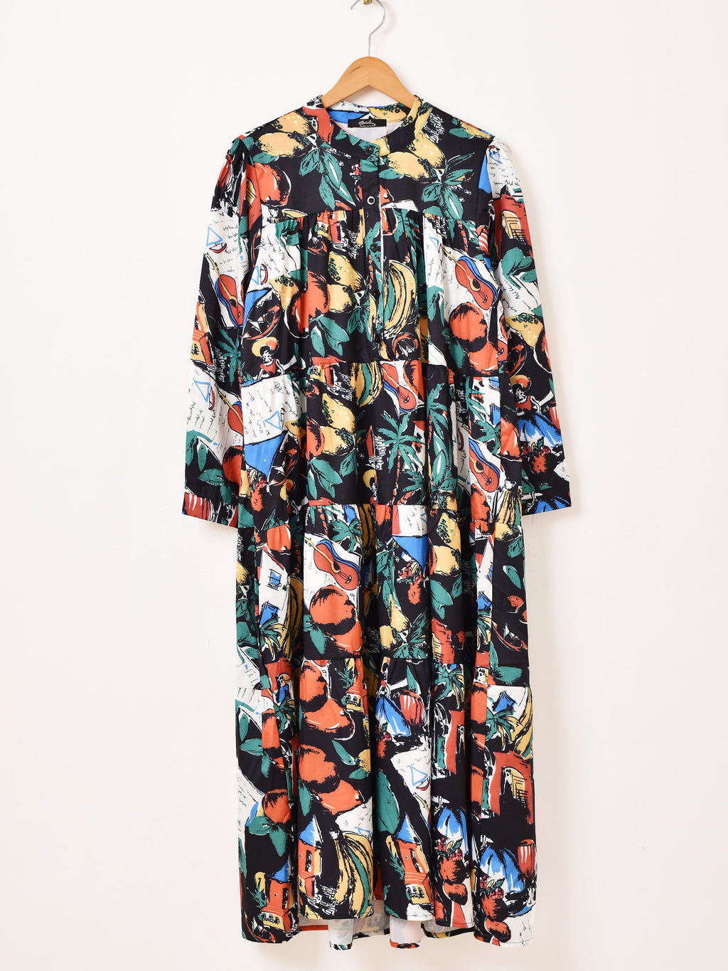 【3色展開】Meridian 総柄 長袖 ティアードワンピース