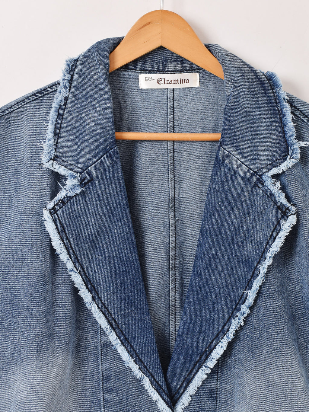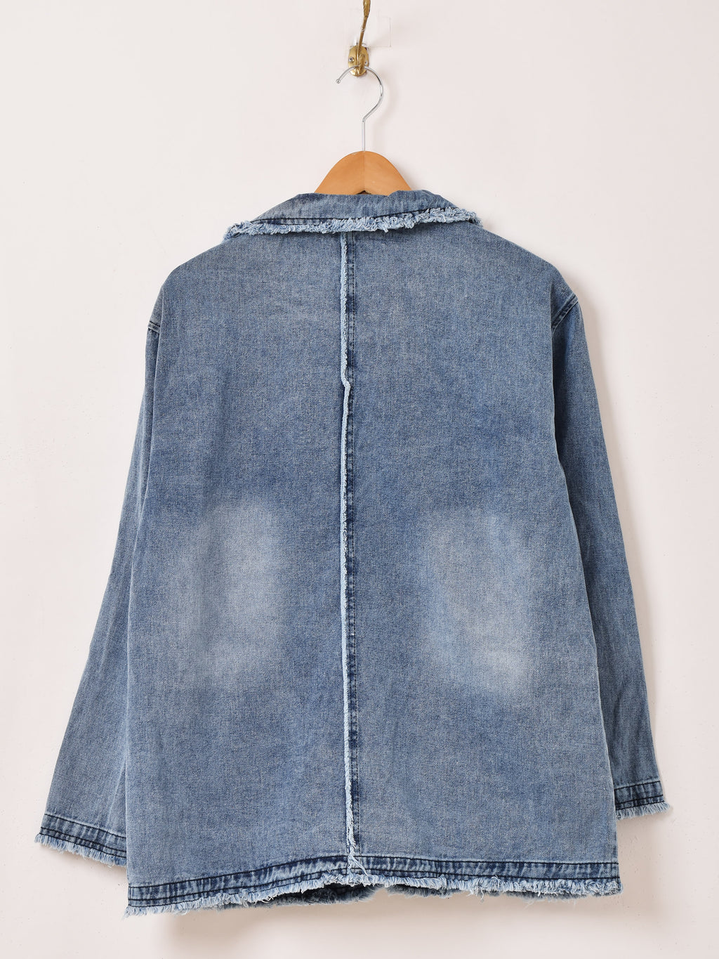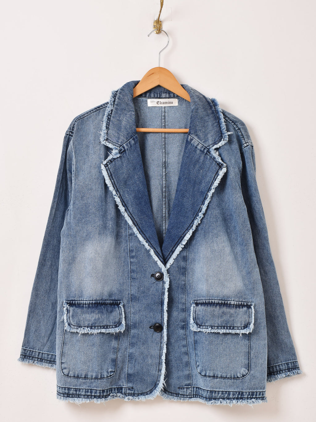 フリンジ加工を施したデニムのテーラードジャケット。シャツ感覚でも羽織れるオーバーサイズシルエットなので、こなれ感のある着こなしにおすすめです。
