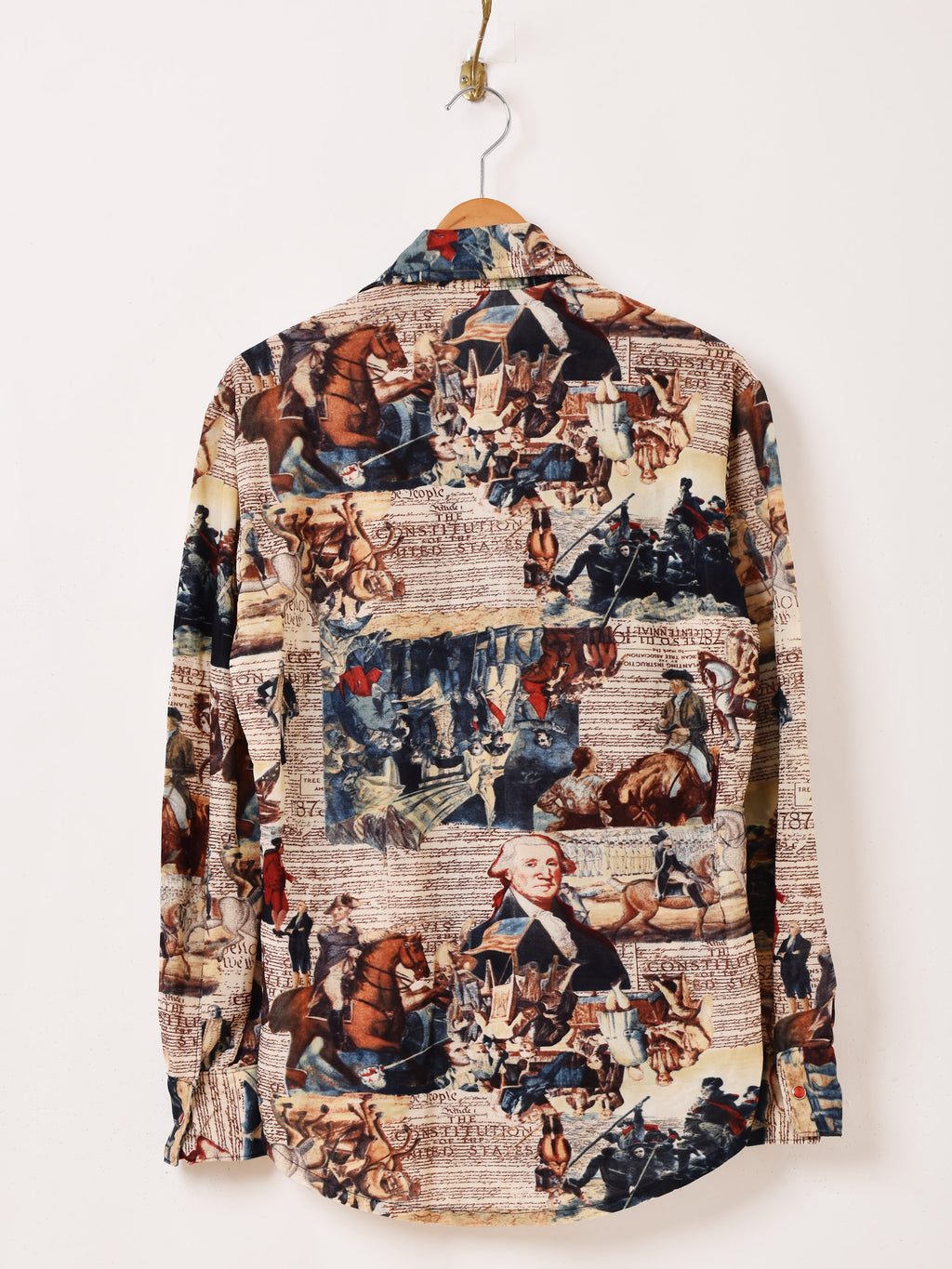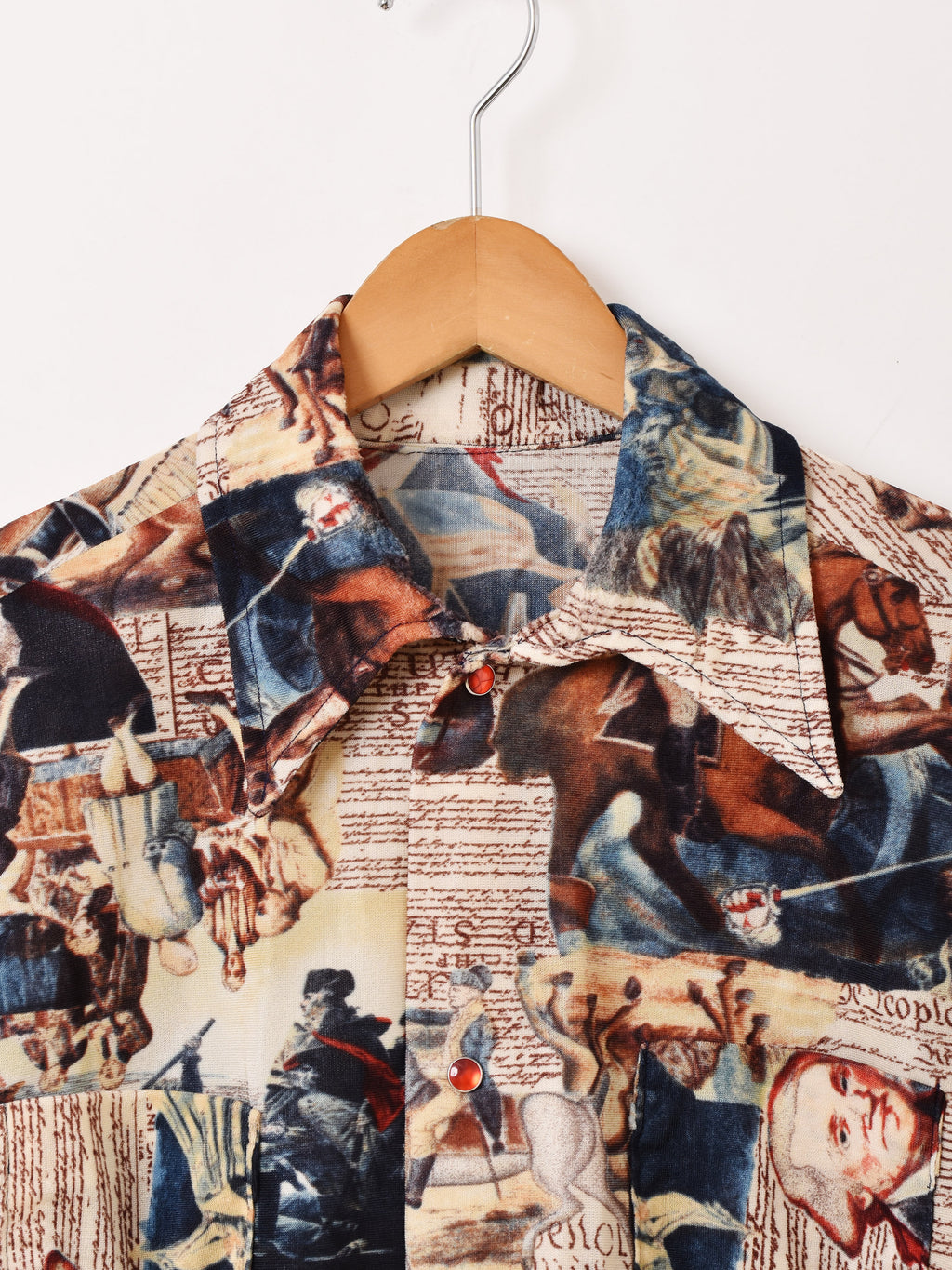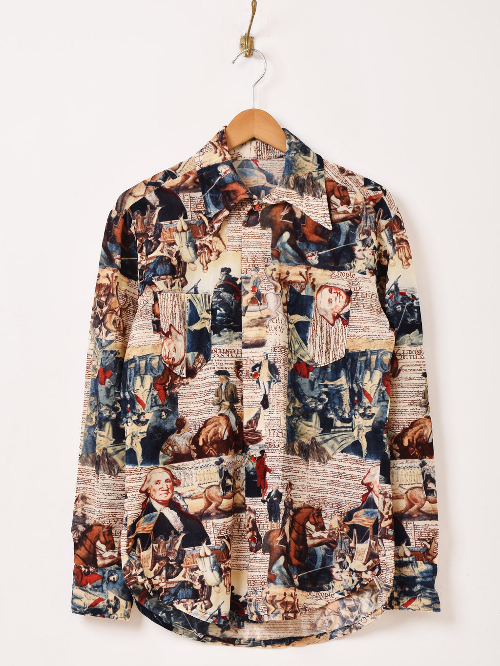 アンティークで個性的なパターンが目を惹く長袖シャツ。おそらくポリエステル生地で仕立てており、襟のディテールから70年代頃のものと思われます。70’sらしさのあるデザインが魅力的な一着です。
