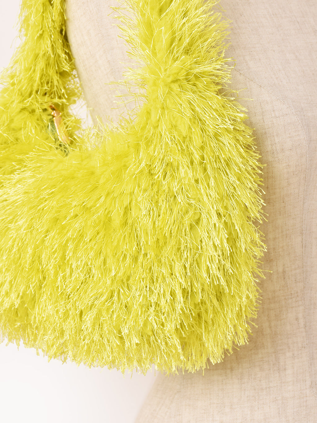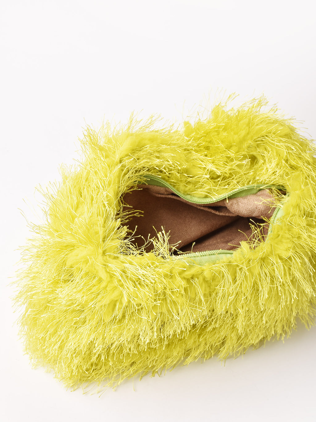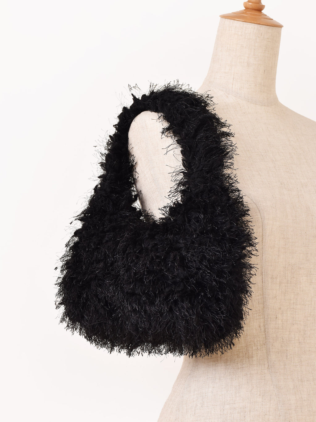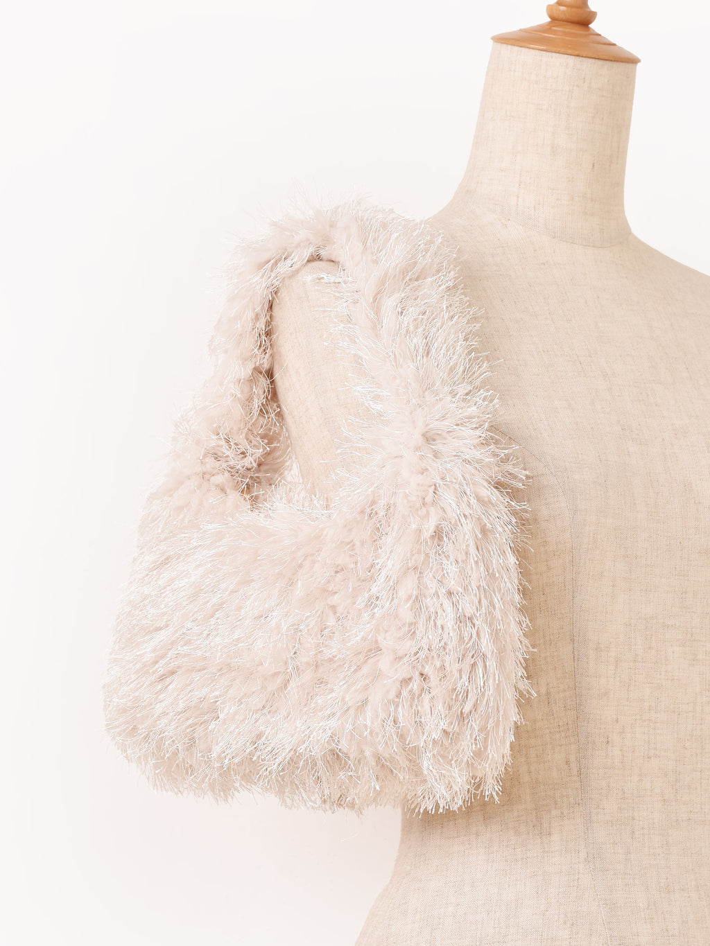 季節感のあるフリンジファーがオシャレなハンドバッグ。小ぶりながらもボリューム感のあるシルエットが、コーディネートのアクセントになる一点です。スマホや財布が入るサイズ感です。