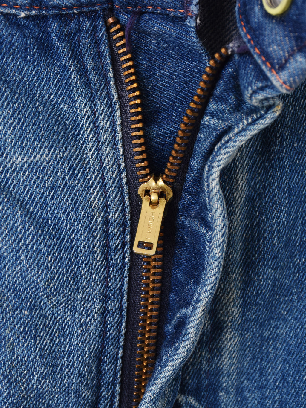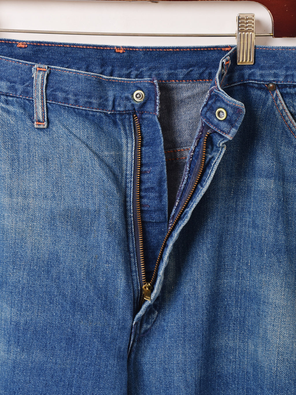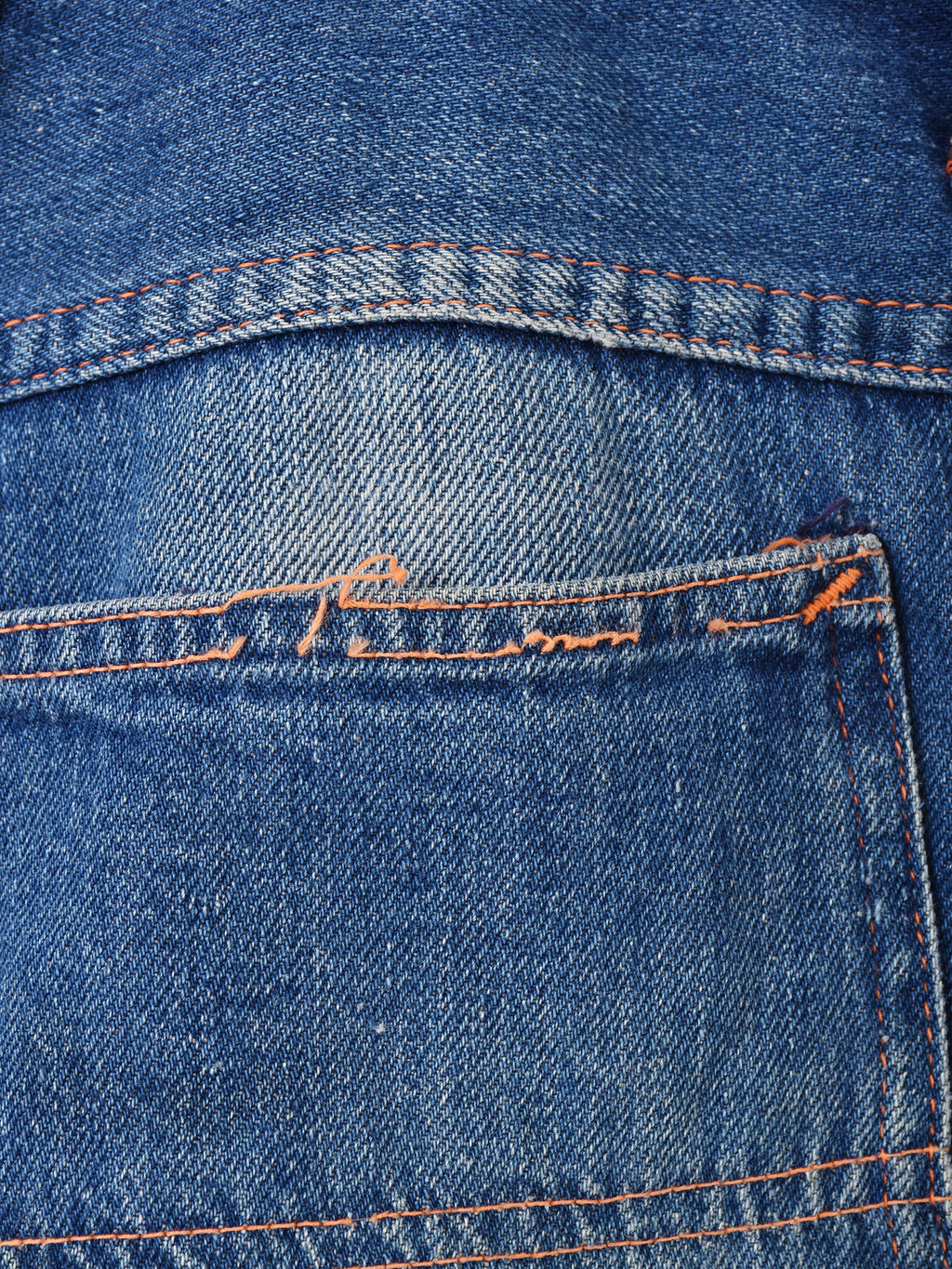 ヴィンテージデニムらしい色落ちのブルーに、オレンジのトリプルステッチが映えており、色の落ち方とスレに愛用されていたことが窺える一点。