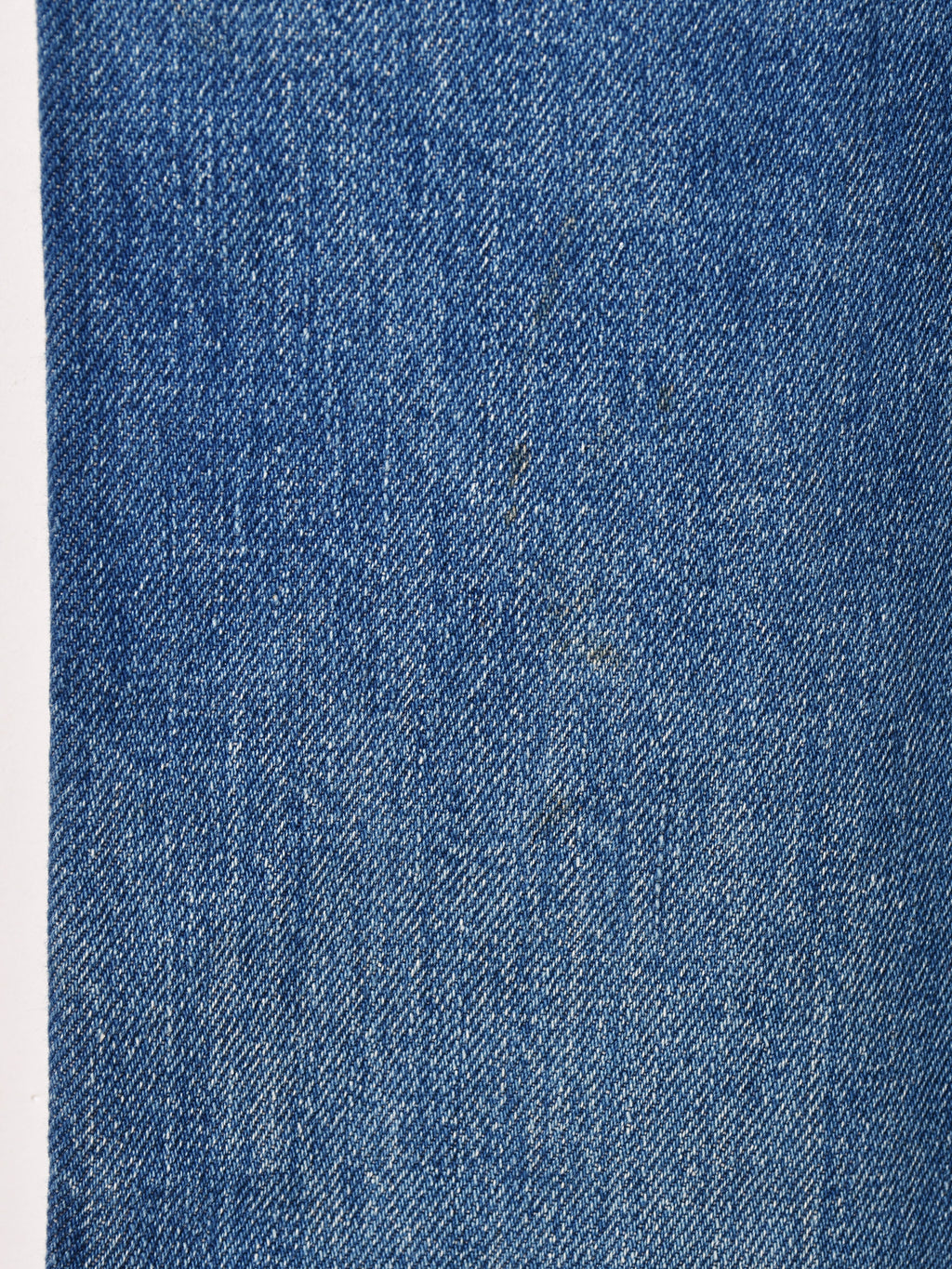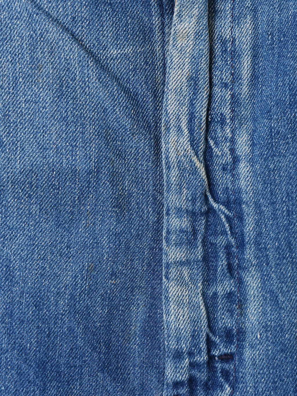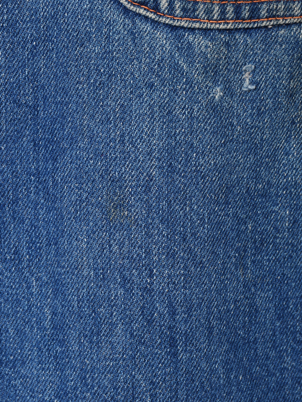ヴィンテージデニムらしい色落ちのブルーに、オレンジのトリプルステッチが映えており、色の落ち方とスレに愛用されていたことが窺える一点。