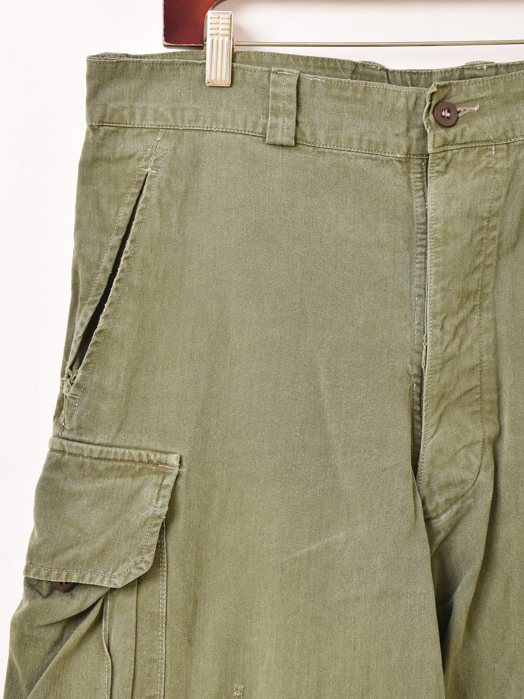 フロントは、この時代のミリタリーならではのボタンフライ仕様でトップボタンは一つ。サイドには大型のカーゴポケット付き、裾はボタン留めのサイズアジャスターが付属。