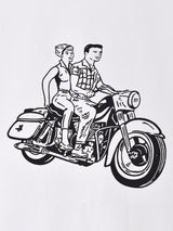 レトロな雰囲気のバイクに乗った男女のプリントが古着と相性のよさそうなTシャツ。しっかりとしたヘビーなコットン生地です。バックプリント有り。