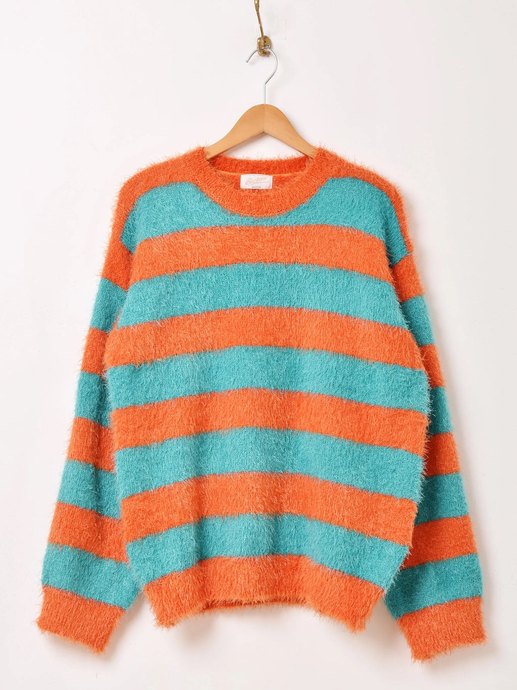 2トーンカラーのボーダー柄が目を惹くセーター。毛足長めのシャギーニット生地で、伸縮性があります。明るめのカラーでコーディネートを華やかにしてくれる一着です。