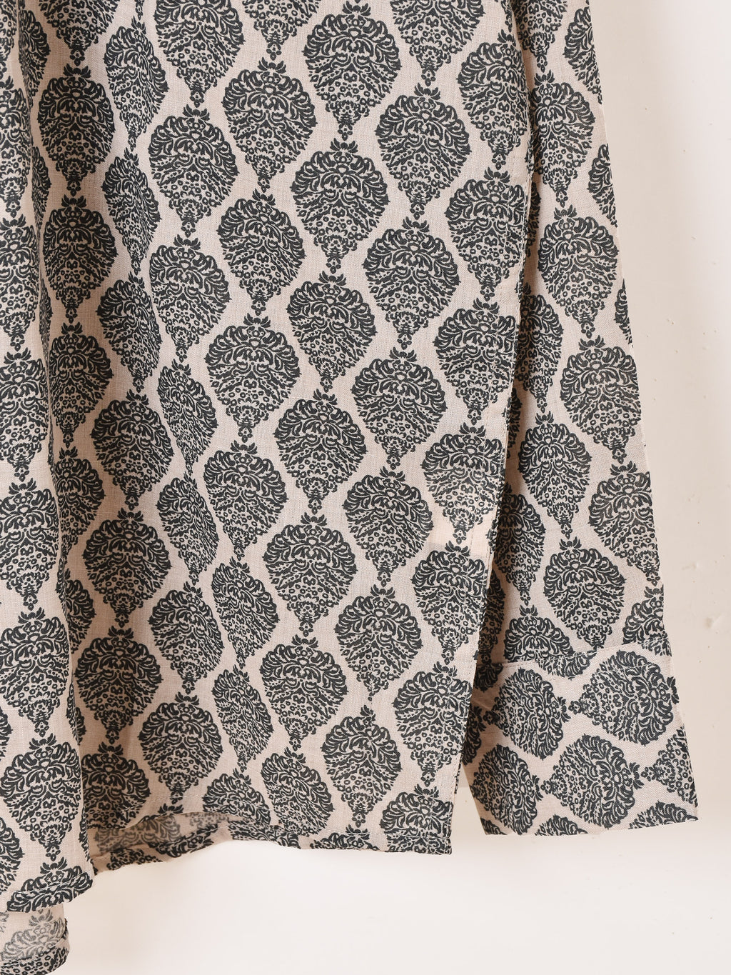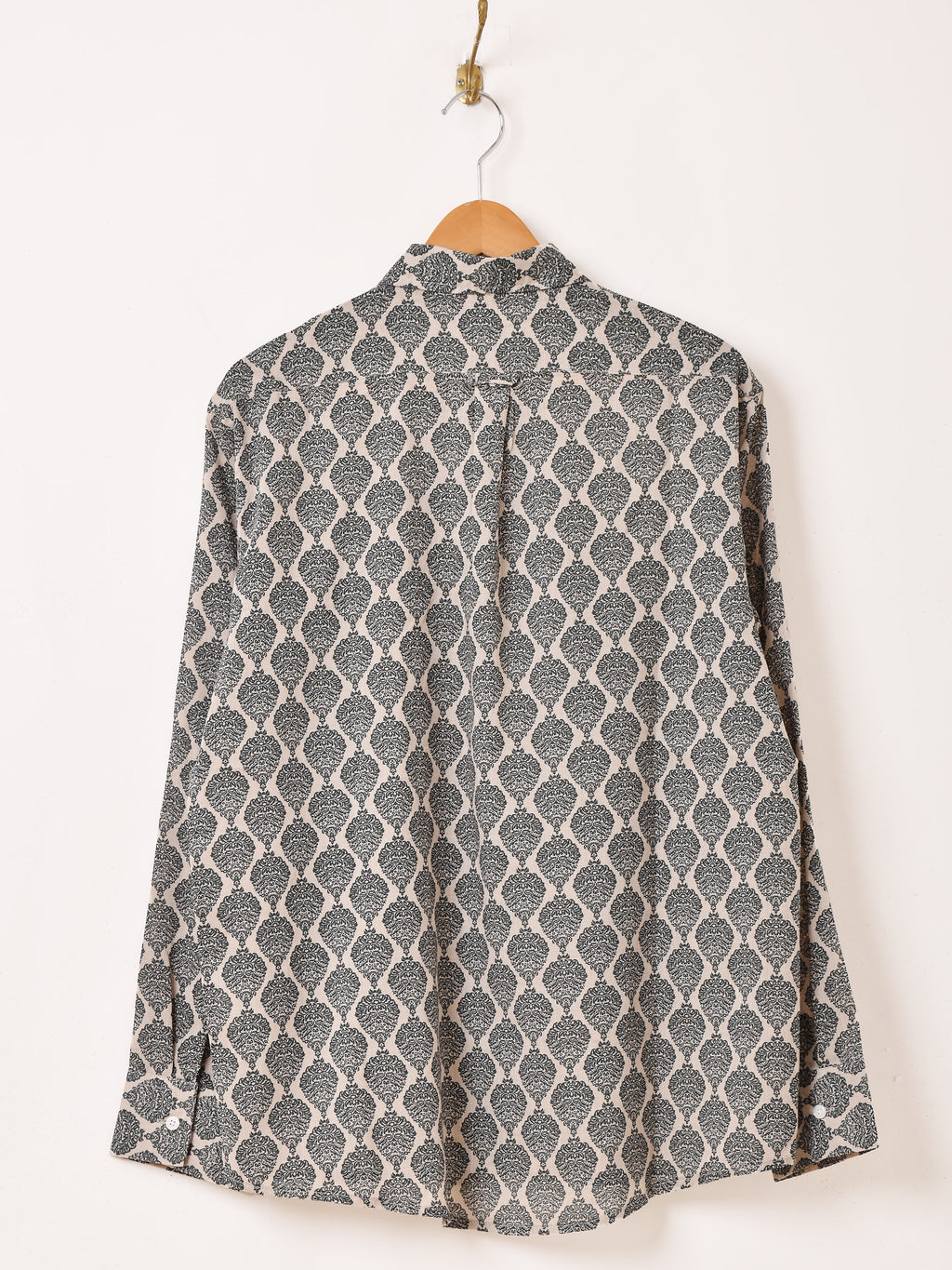 雰囲気の良いダマスクパターンの長袖シャツ。やや透け感のある、薄手のサラッとしたコットンポリ生地で、オールシーズンを通して着回せます。