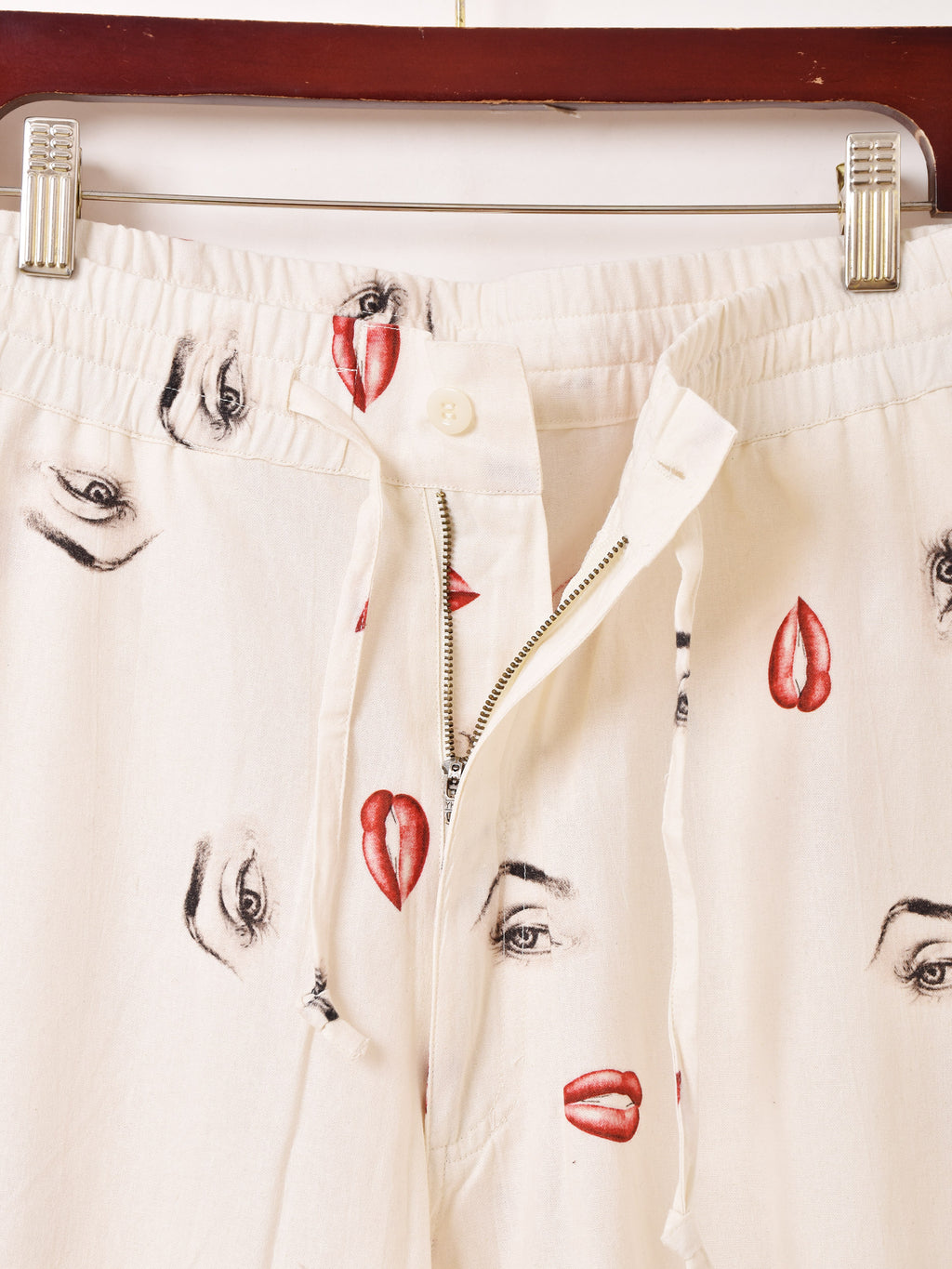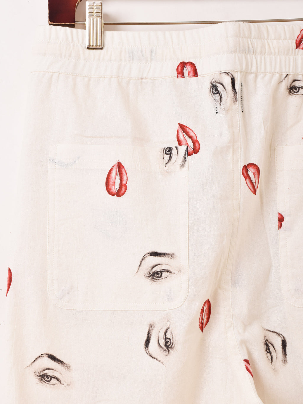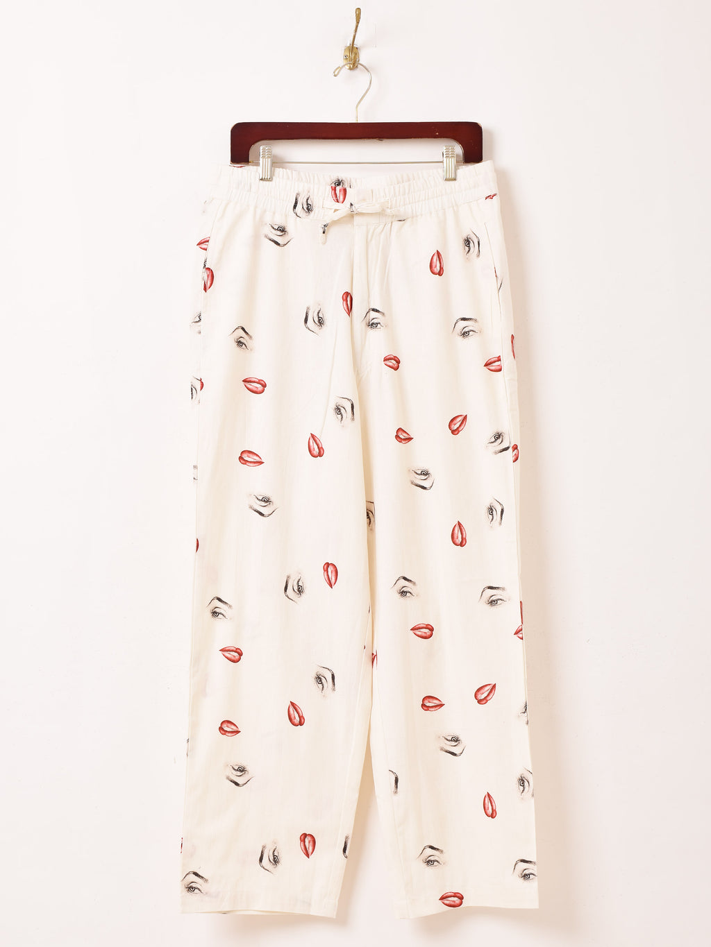 マリリン・モンローの目と口がデザインされたイージーパンツ。ロカビリーテイストが溢れた一着です。ウエストはゴム紐仕様、フリーサイズで着用いただけます。