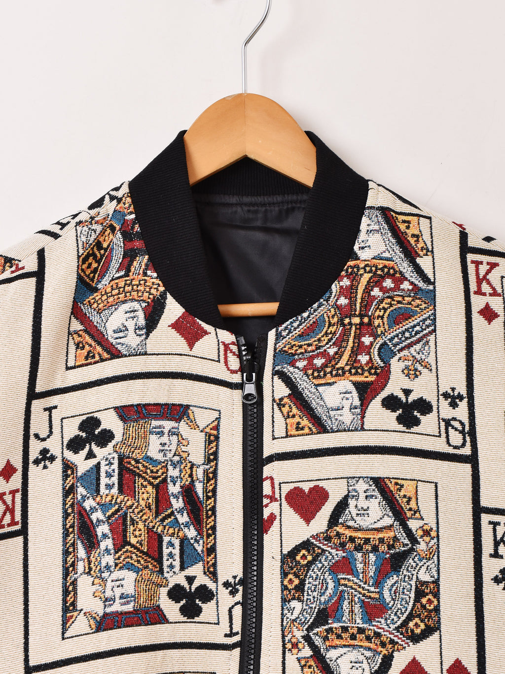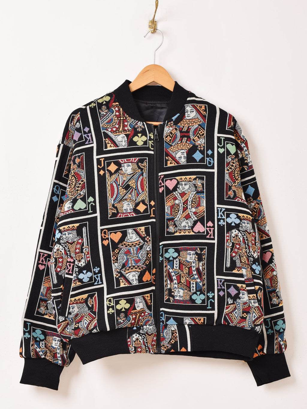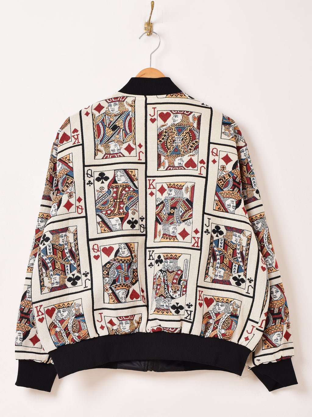 個性的なトランプデザインのタペストリージャケット。リバーシブル仕様なので主役にしても良し、裏返してアウターとして機能的に着用しても良し、それぞれ違ったスタイルにしてくれます。フリーサイズで着用していただけます。