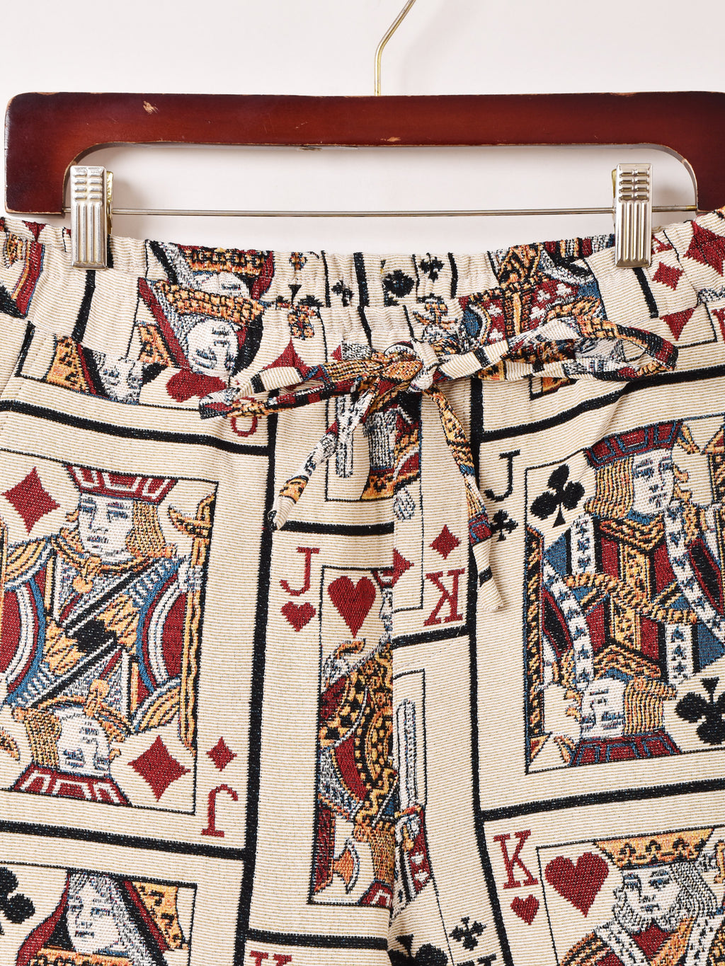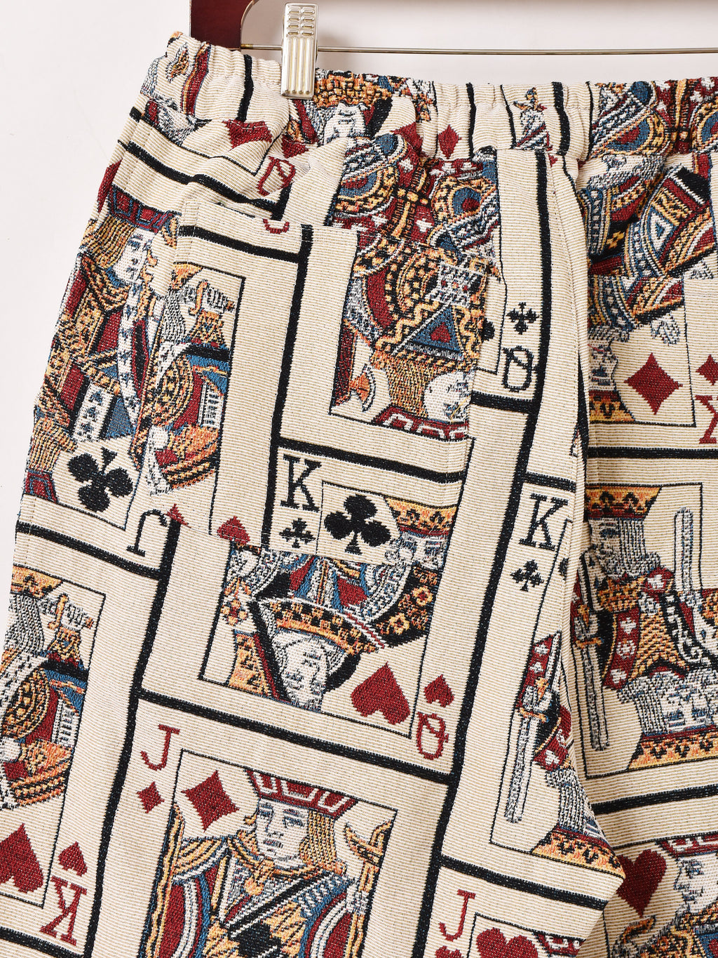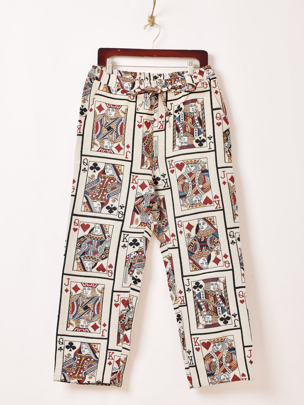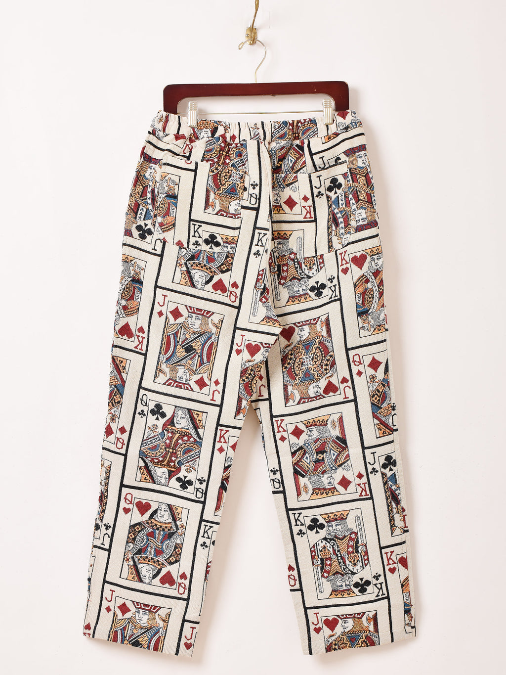 個性的なトランプデザインのタペストリーのロングパンツ。ヴィンテージライクな雰囲気がコーディネートの主役になる一着。フリーサイズで着用いただけます。