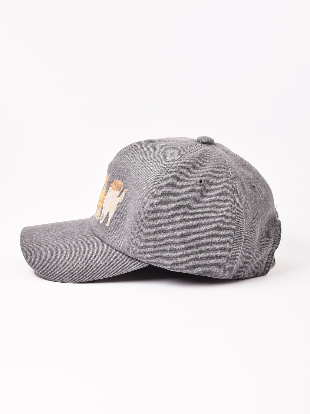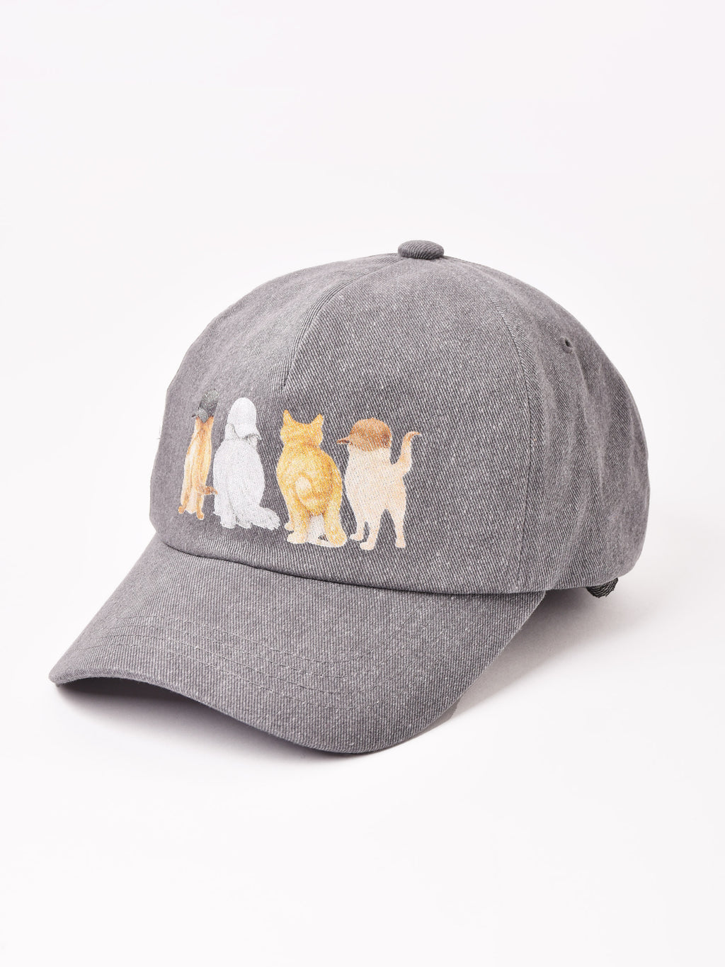 猫ちゃんの可愛らしい後ろ姿がプリントされたコットンキャップ。オールシーズン被れる一点です。