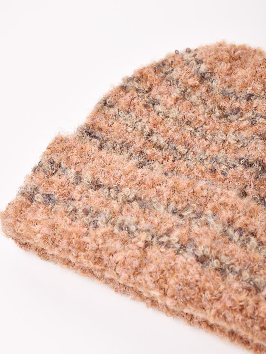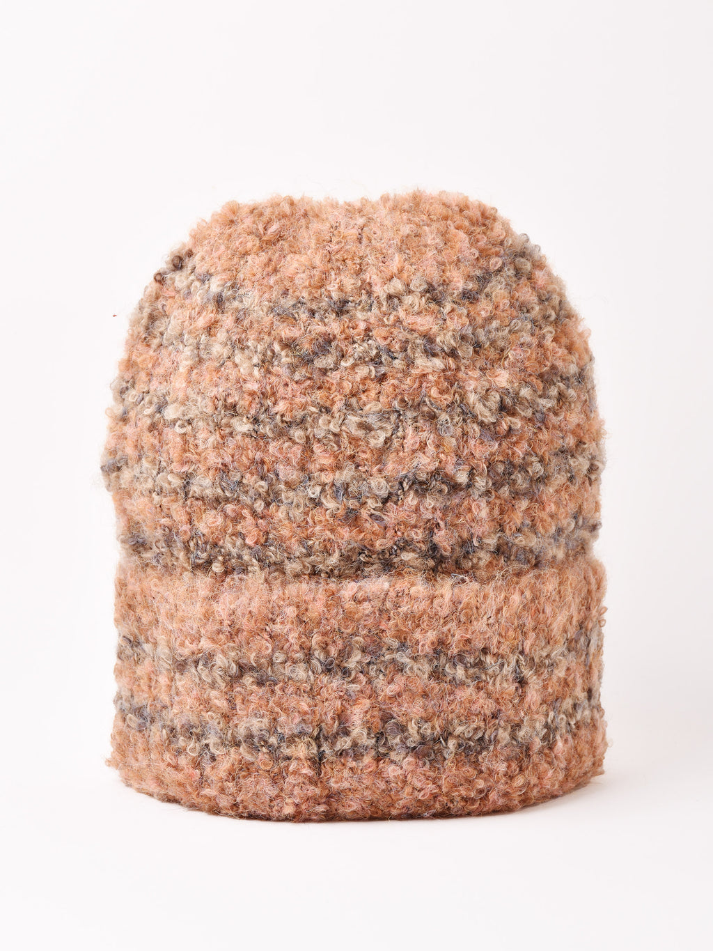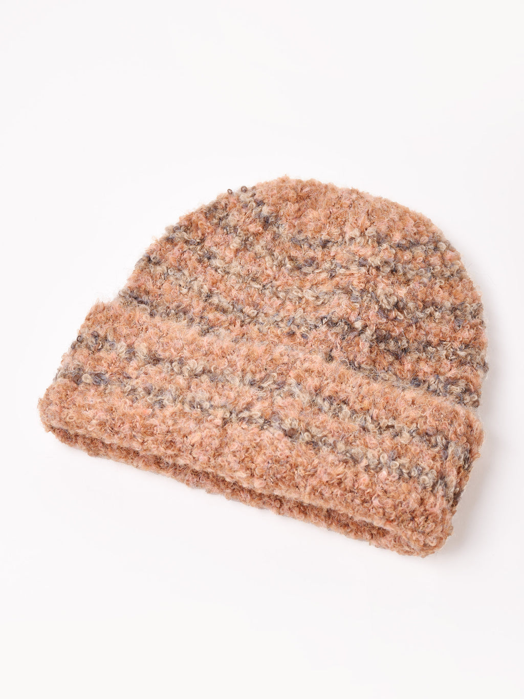 くるくるとしたフェイクファーで、秋冬らしいテキスタイルのニットキャップ。マルチボーダーデザインがコーデに華を添えてくれます。厚みのある生地感です。