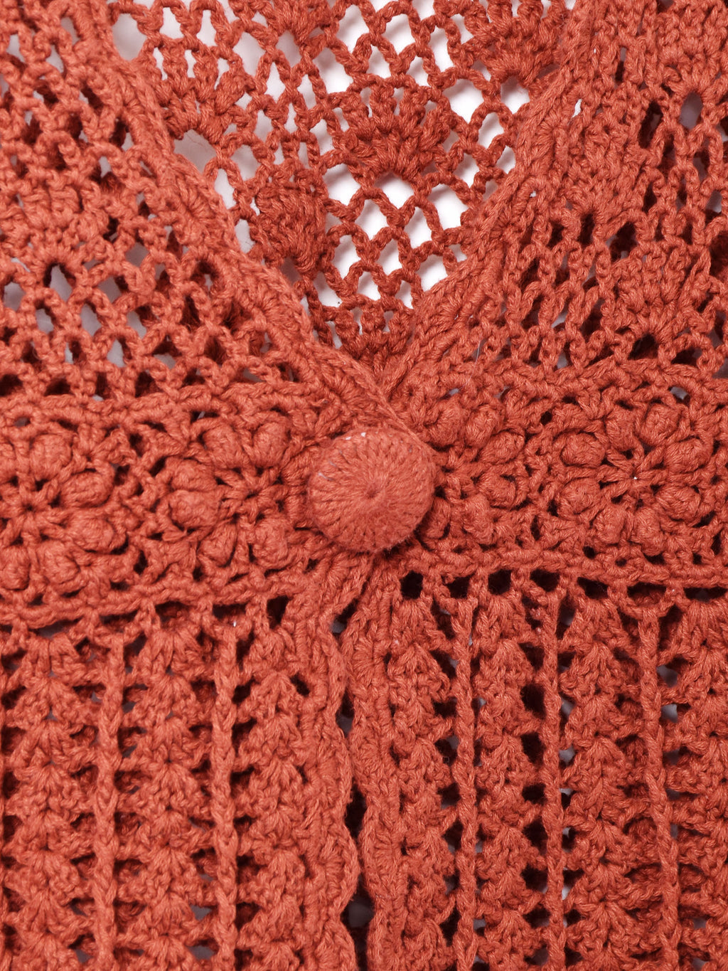 雰囲気のあるテラコッタカラーと大きめのボタンがポイントのクロシェトップス。柔らかく、肌触りのよいオールコットン生地です。