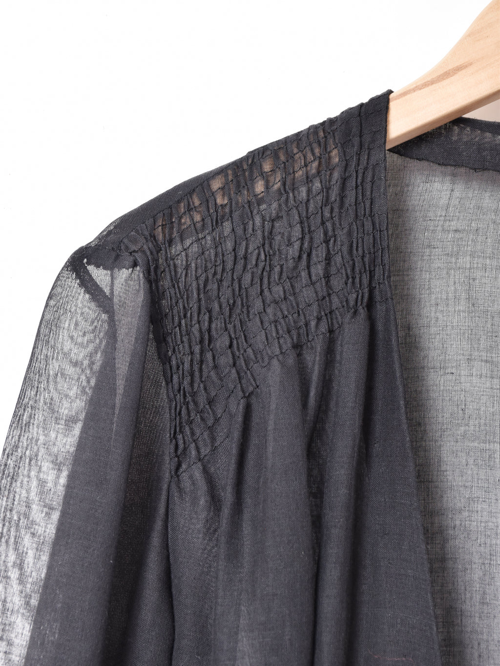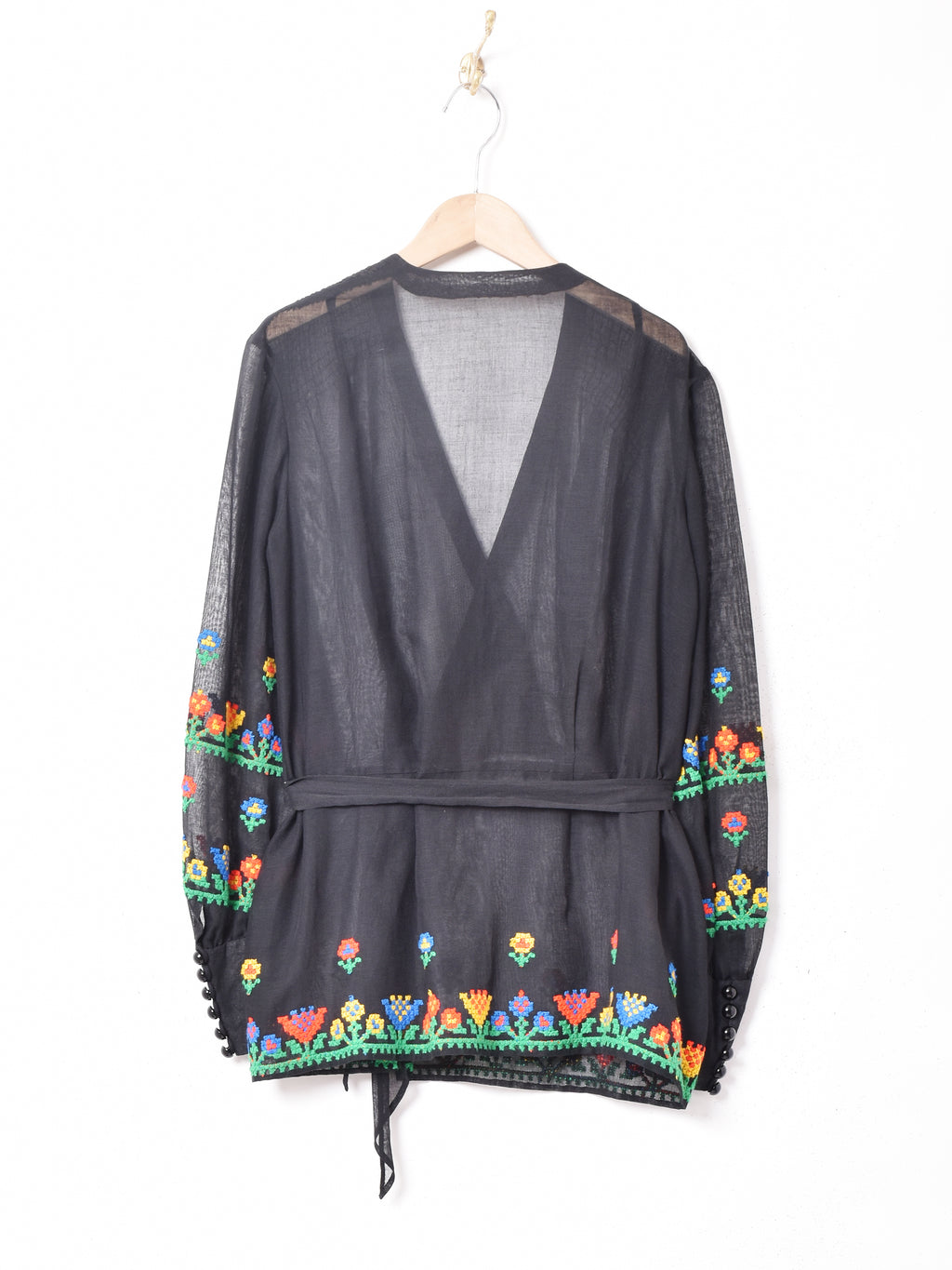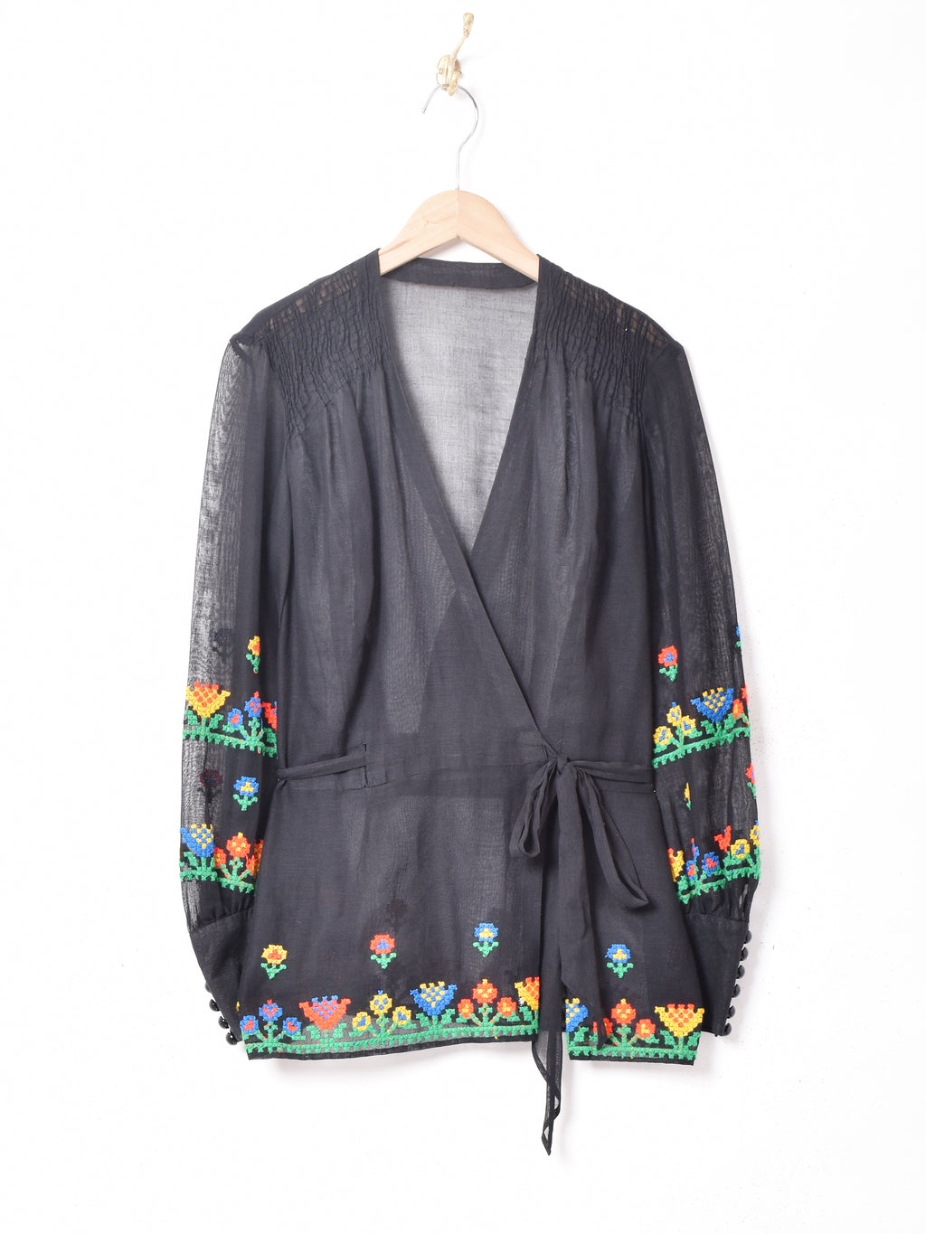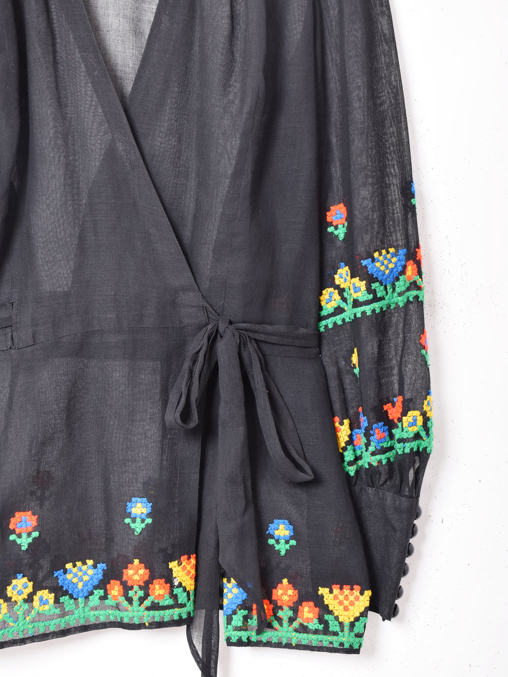 ブラックベースにカラフルな刺繍がよく映えるカシュクールトップス。おそらくコットン素材で、透け感のある柔らかい生地です。