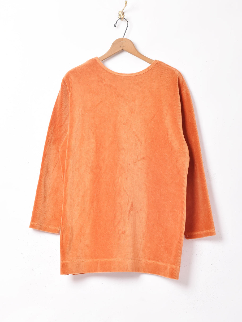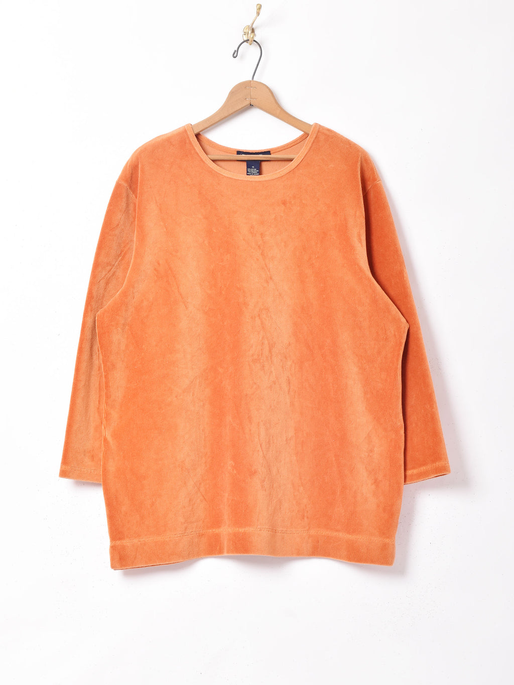 元気なオレンジが目を惹く長袖トップス。程よい厚みと大きめのシルエットで、レイヤードを楽しみやすそうな一着です。