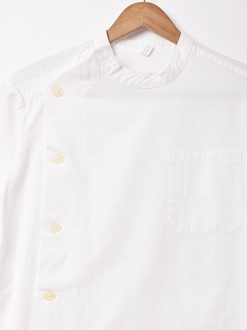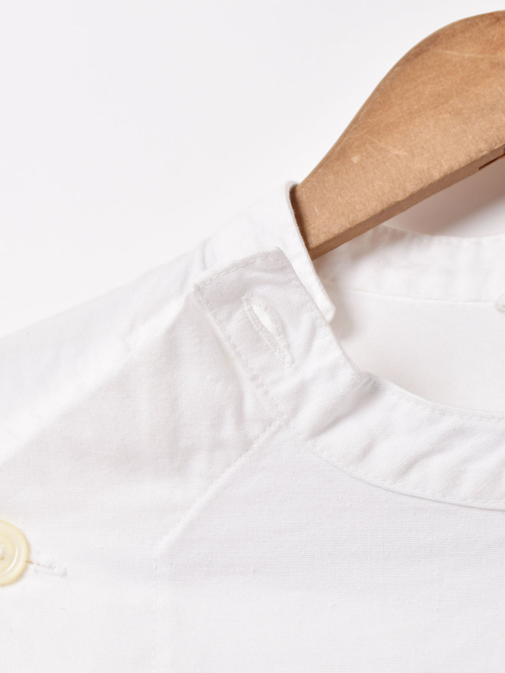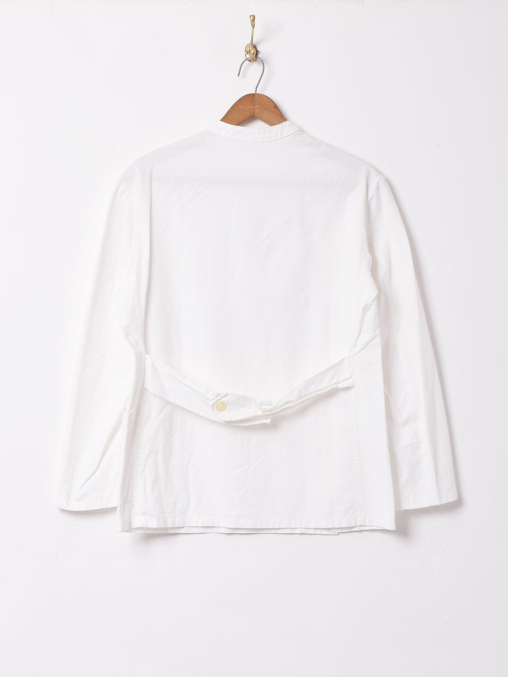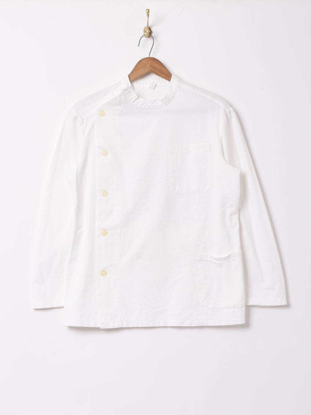 特徴的なデザインでファッションアイテムとしても注目したいコックコート。ハリのあるタフなコットン素材です。