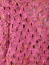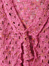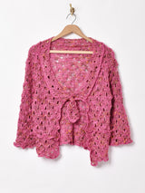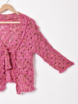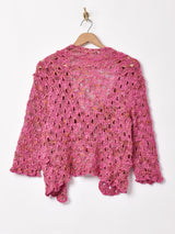 フリフリと波打つデザインに心躍るカギ編みカーディガン。鮮やかなカラーが目を惹きます。おそらくアクリル素材の柔らかな生地感です。
