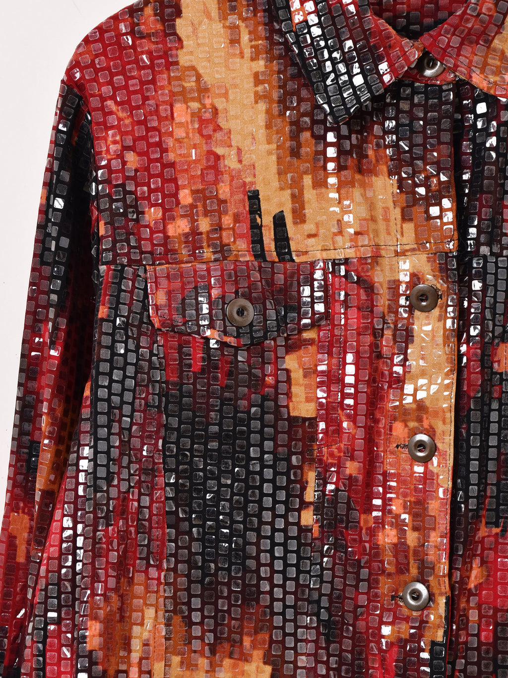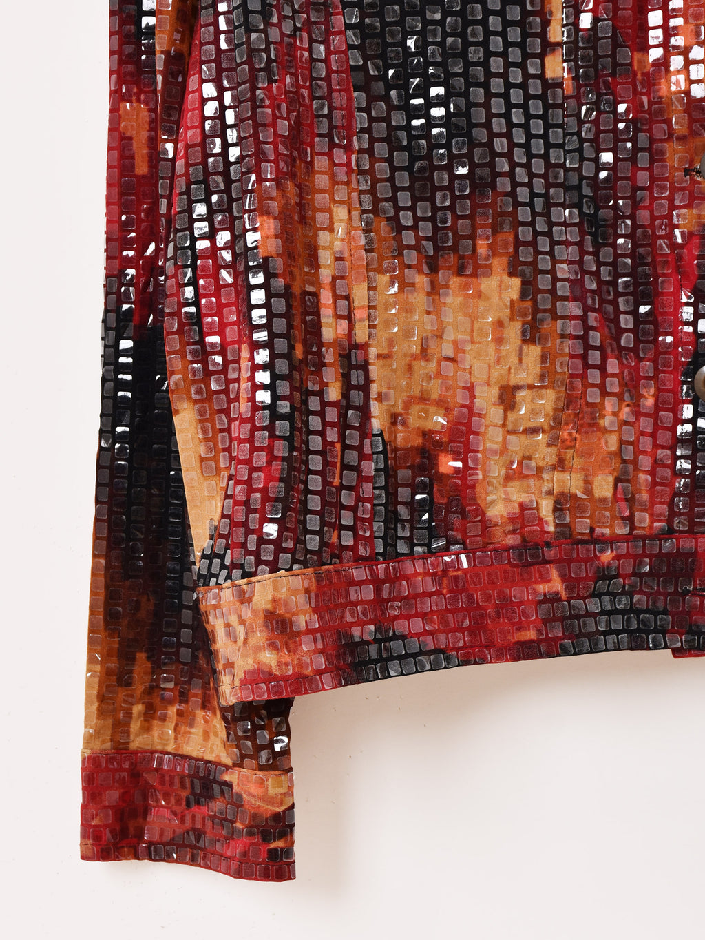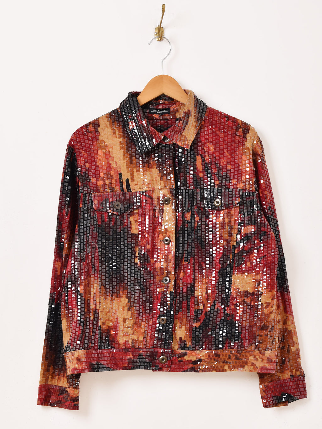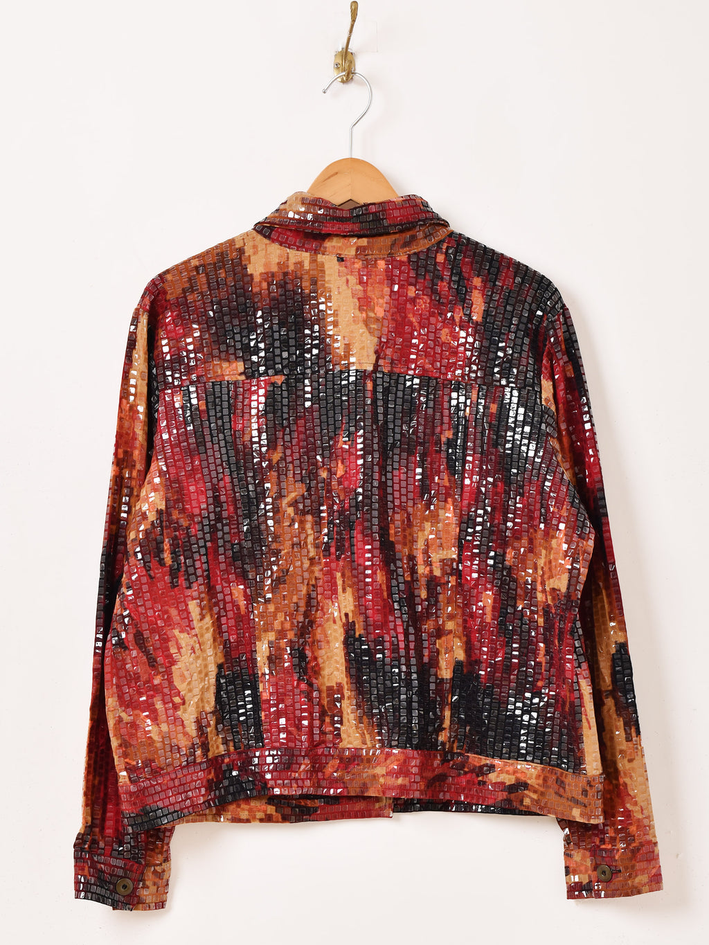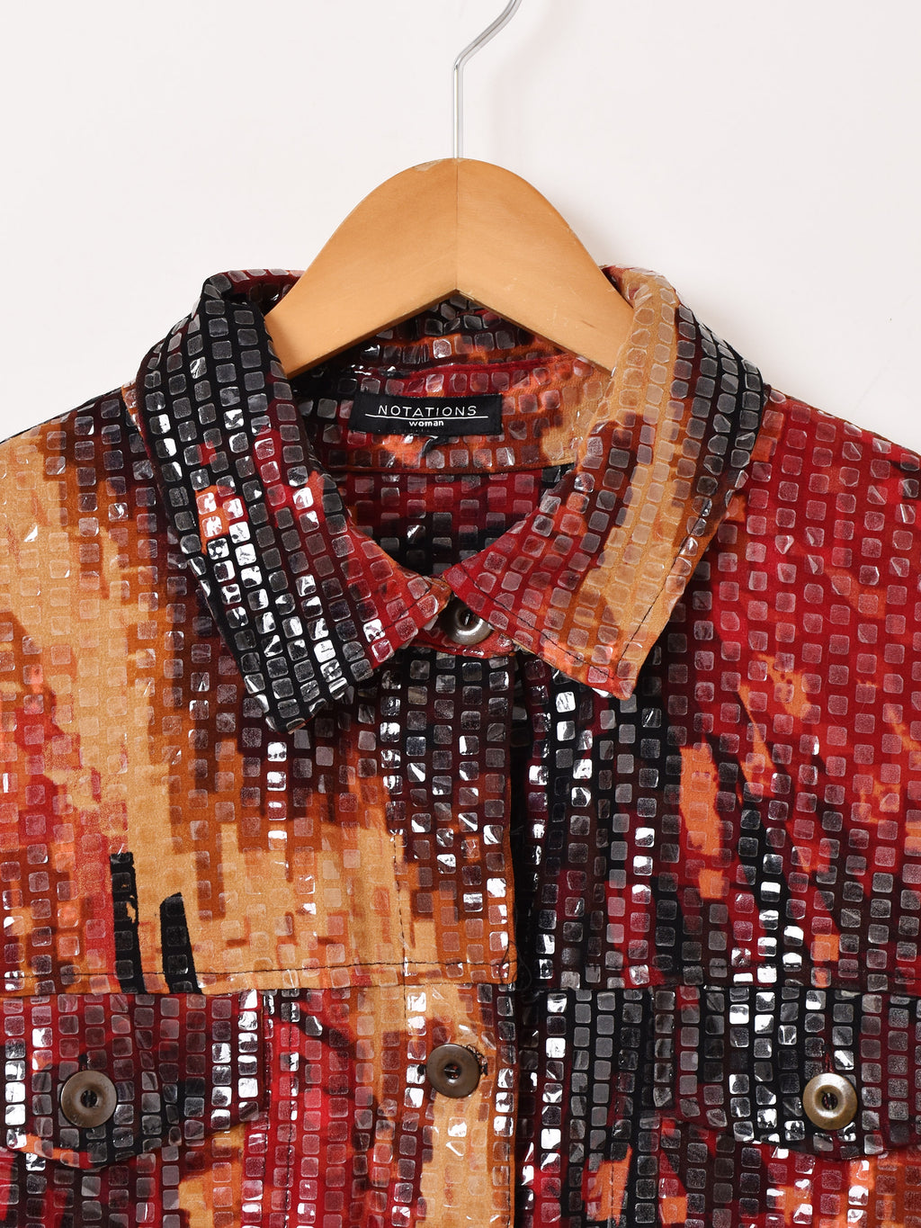 レッドカラーのマーブル模様にギラっと光る装飾をあしらった、エッジの効いたジャケット。伸縮性のあるライトオンスな生地感で、シャツ感覚でも羽織れる一着です。コーディネートの主役におすすめ。