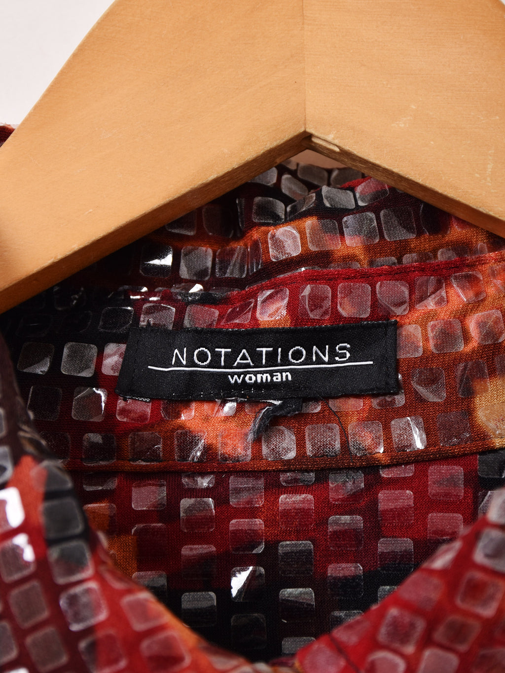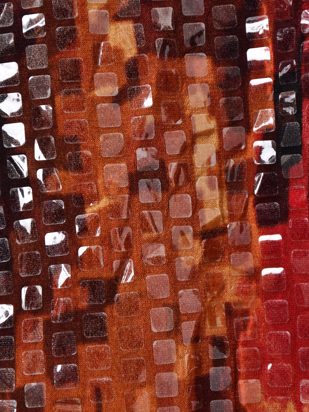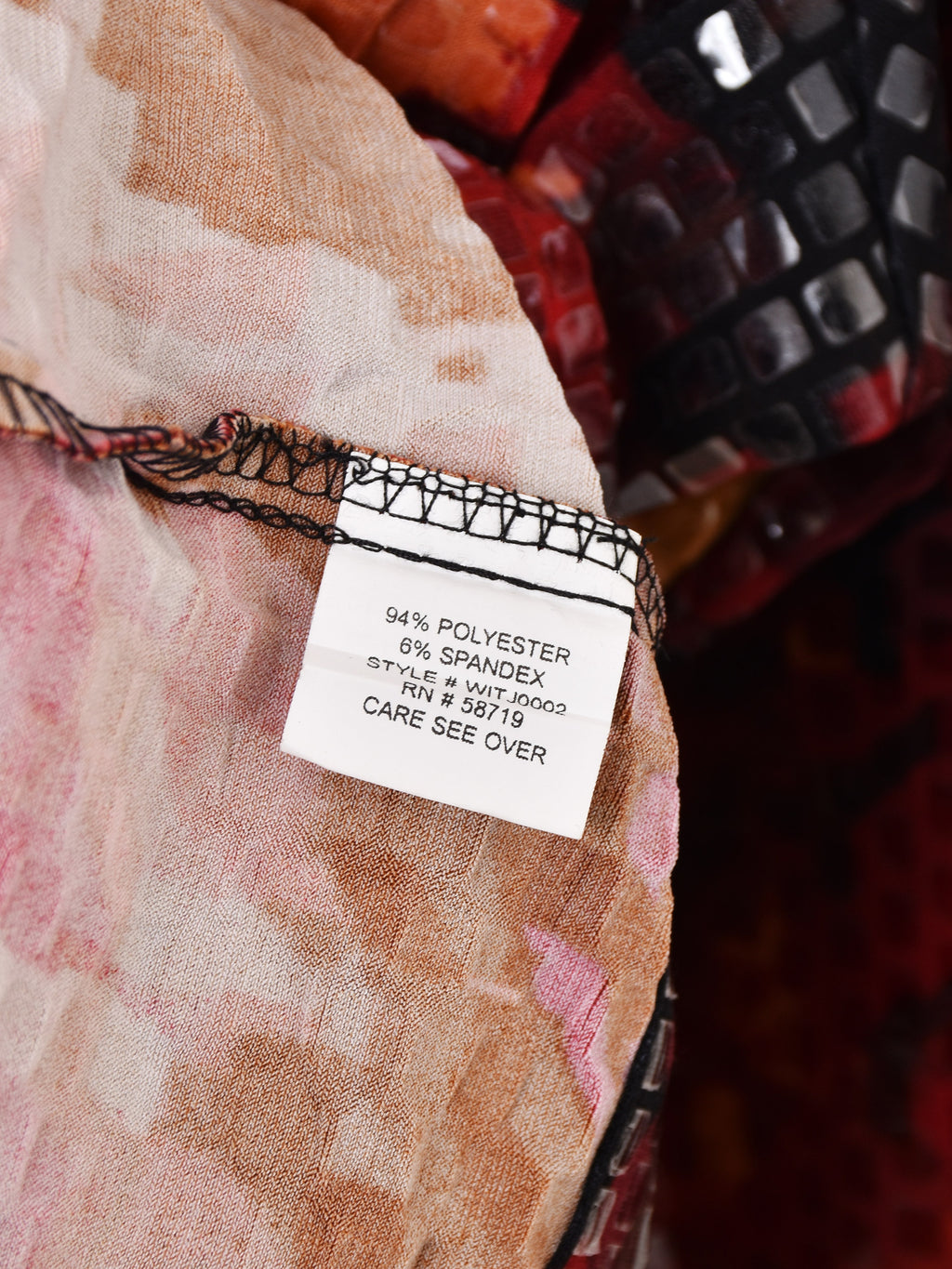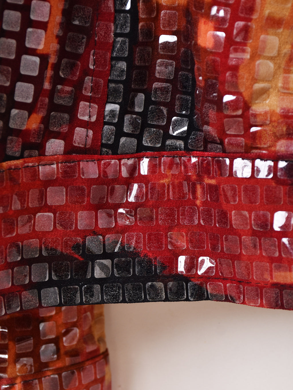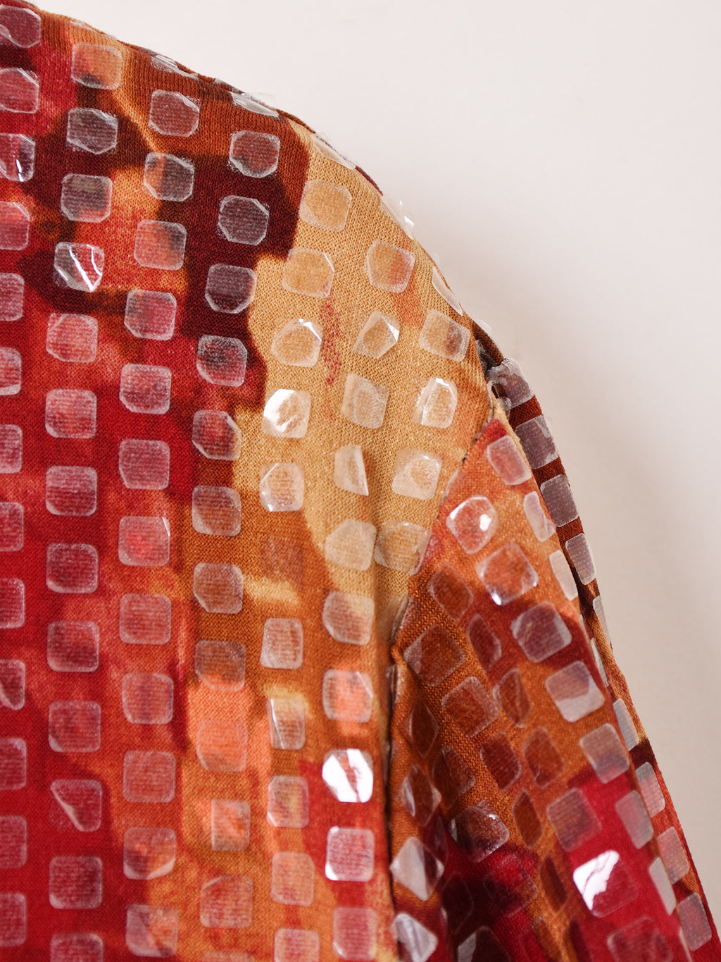 レッドカラーのマーブル模様にギラっと光る装飾をあしらった、エッジの効いたジャケット。伸縮性のあるライトオンスな生地感で、シャツ感覚でも羽織れる一着です。コーディネートの主役におすすめ。