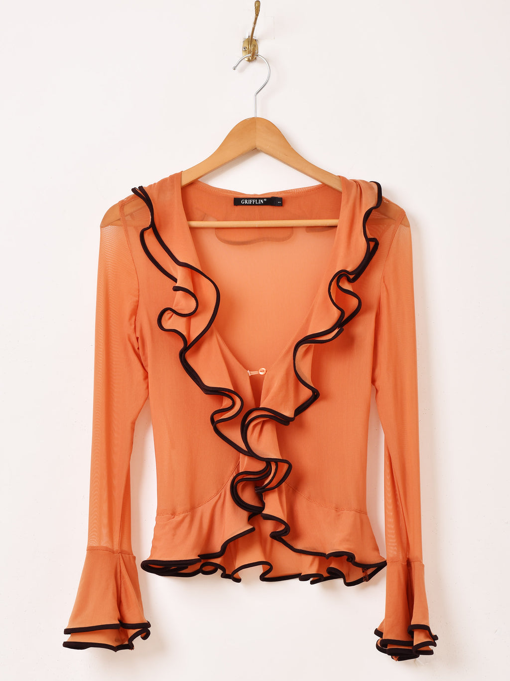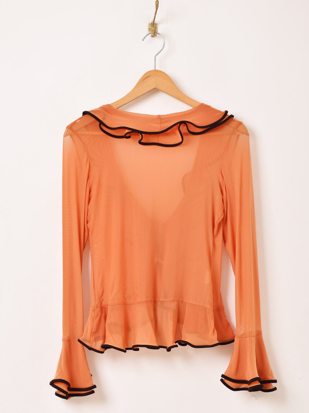 襟元や袖口にあしらったフリルデザインが可愛いブラウス。ブラウンのパイピングデザインもポイント。程よい透け感があり、レイヤードして着こなすのにもおすすめです。