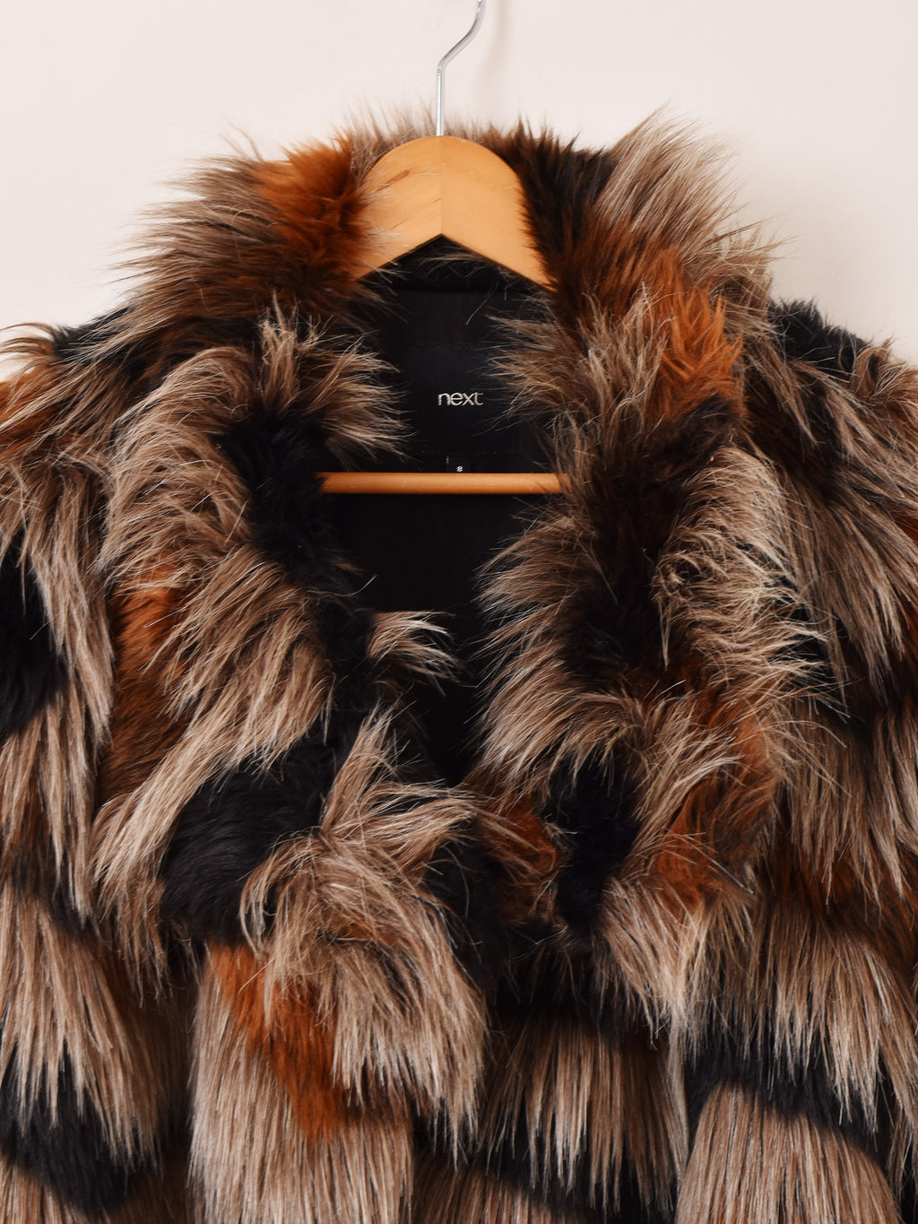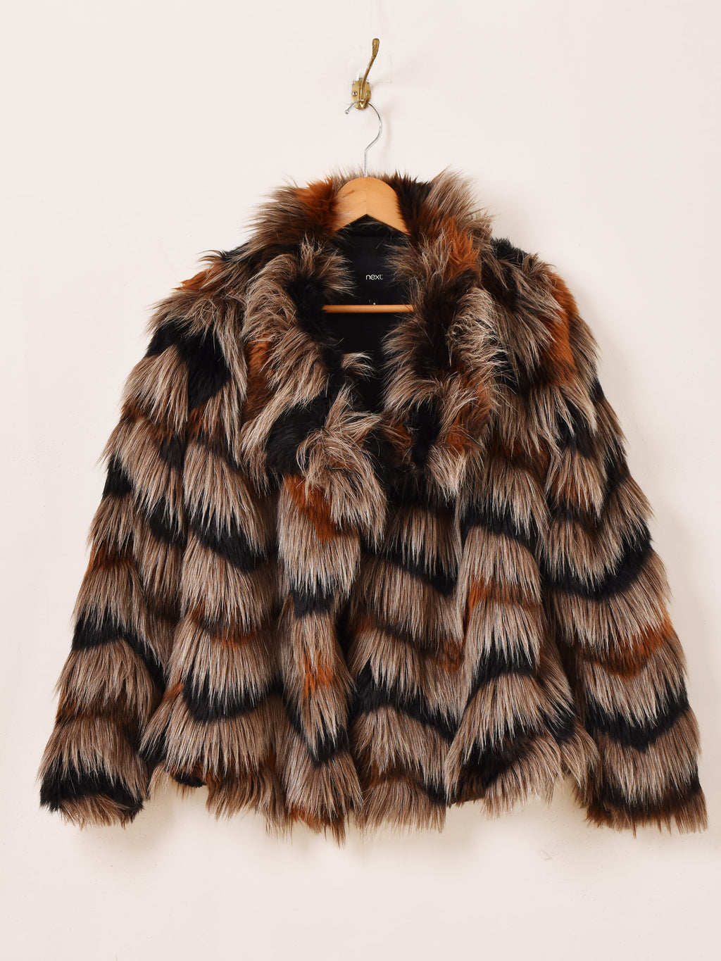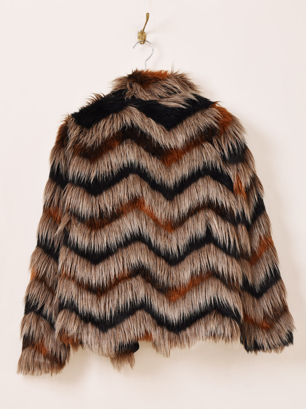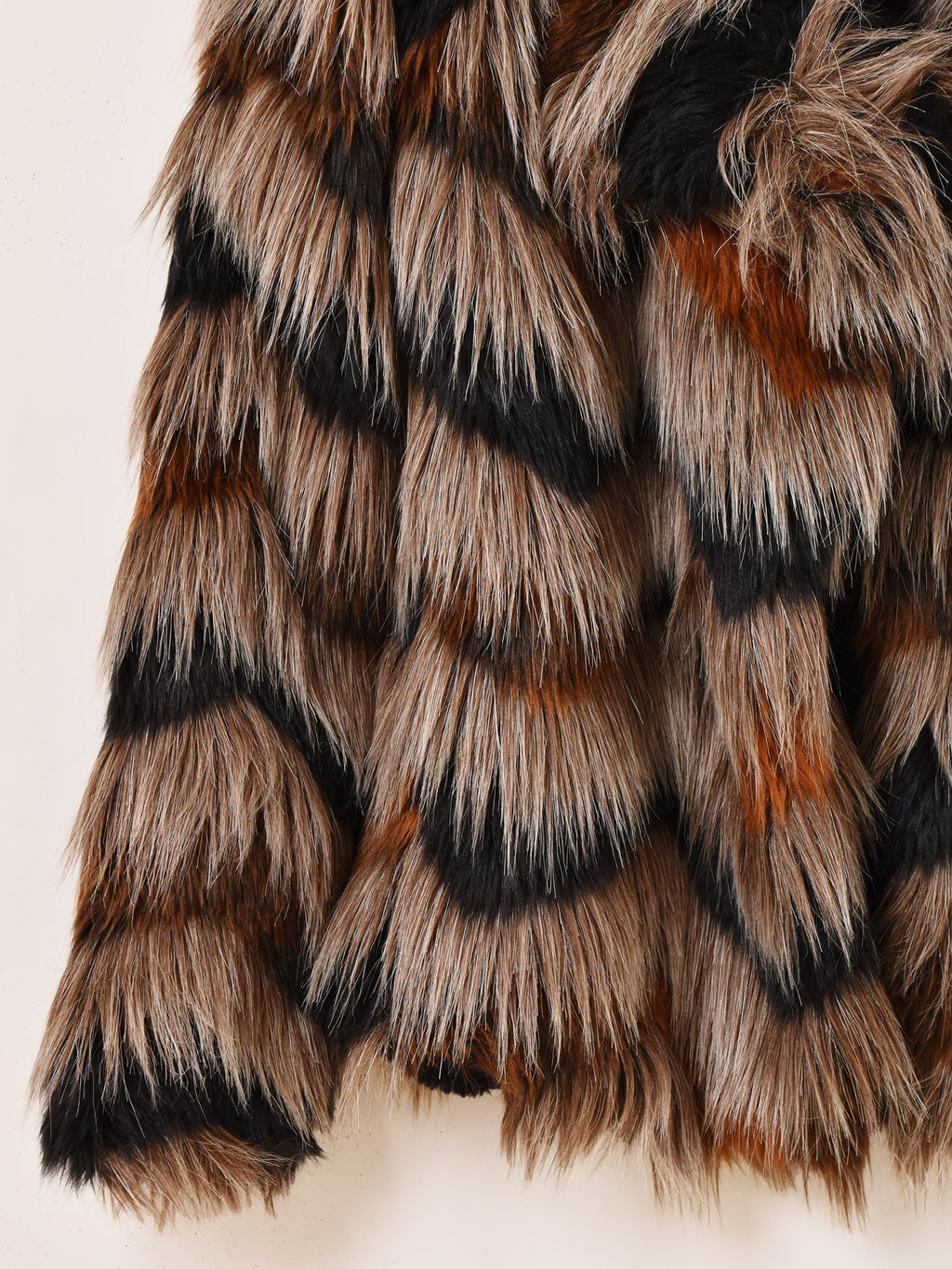 ミックスカラーのフェイクファージャケット。ボリュームのあるシルエットで、存在感を発揮してくれる一着です。