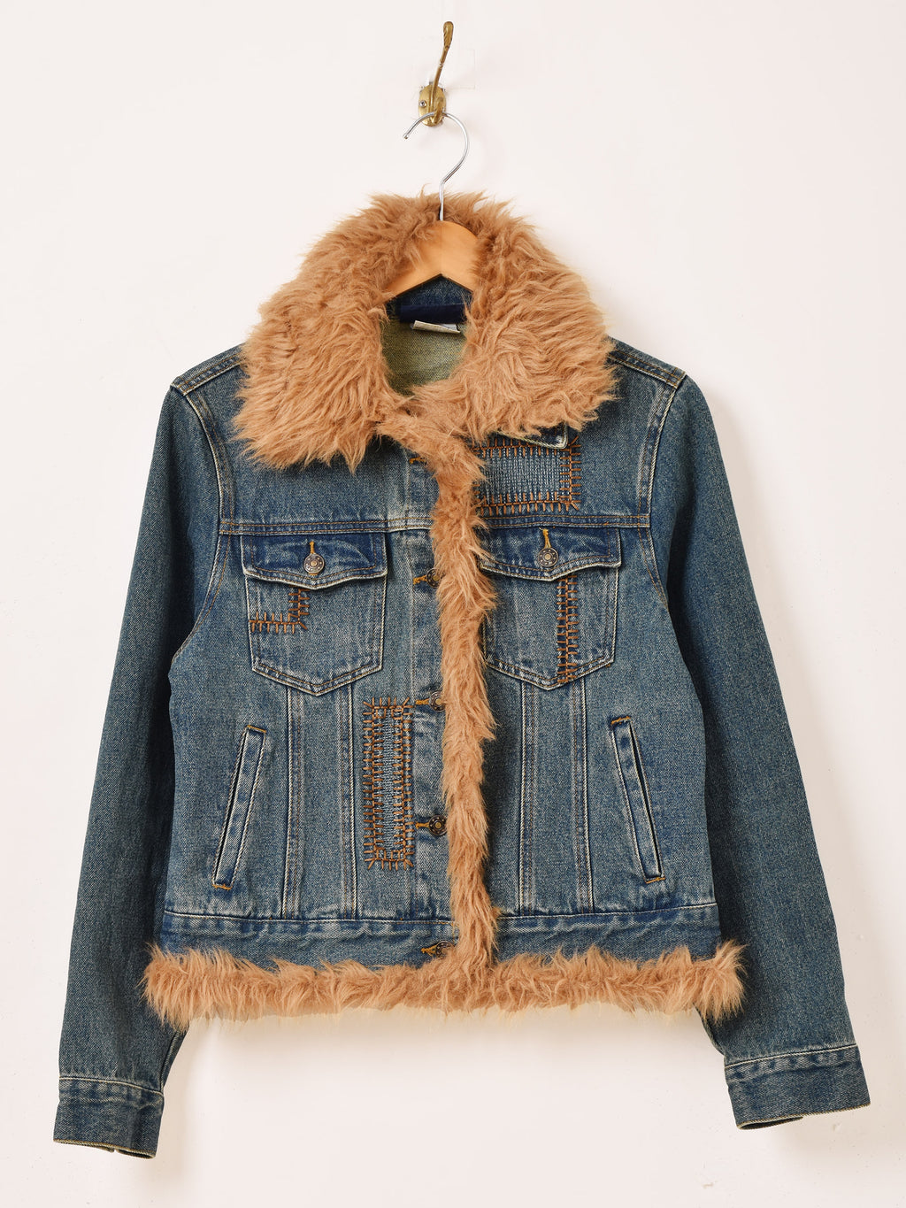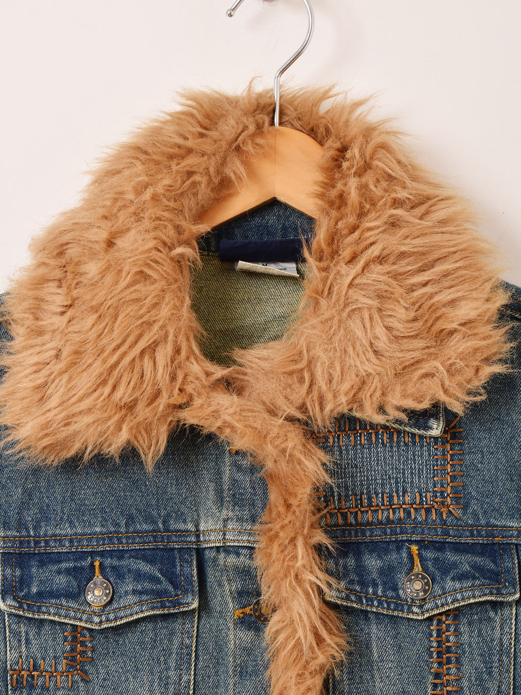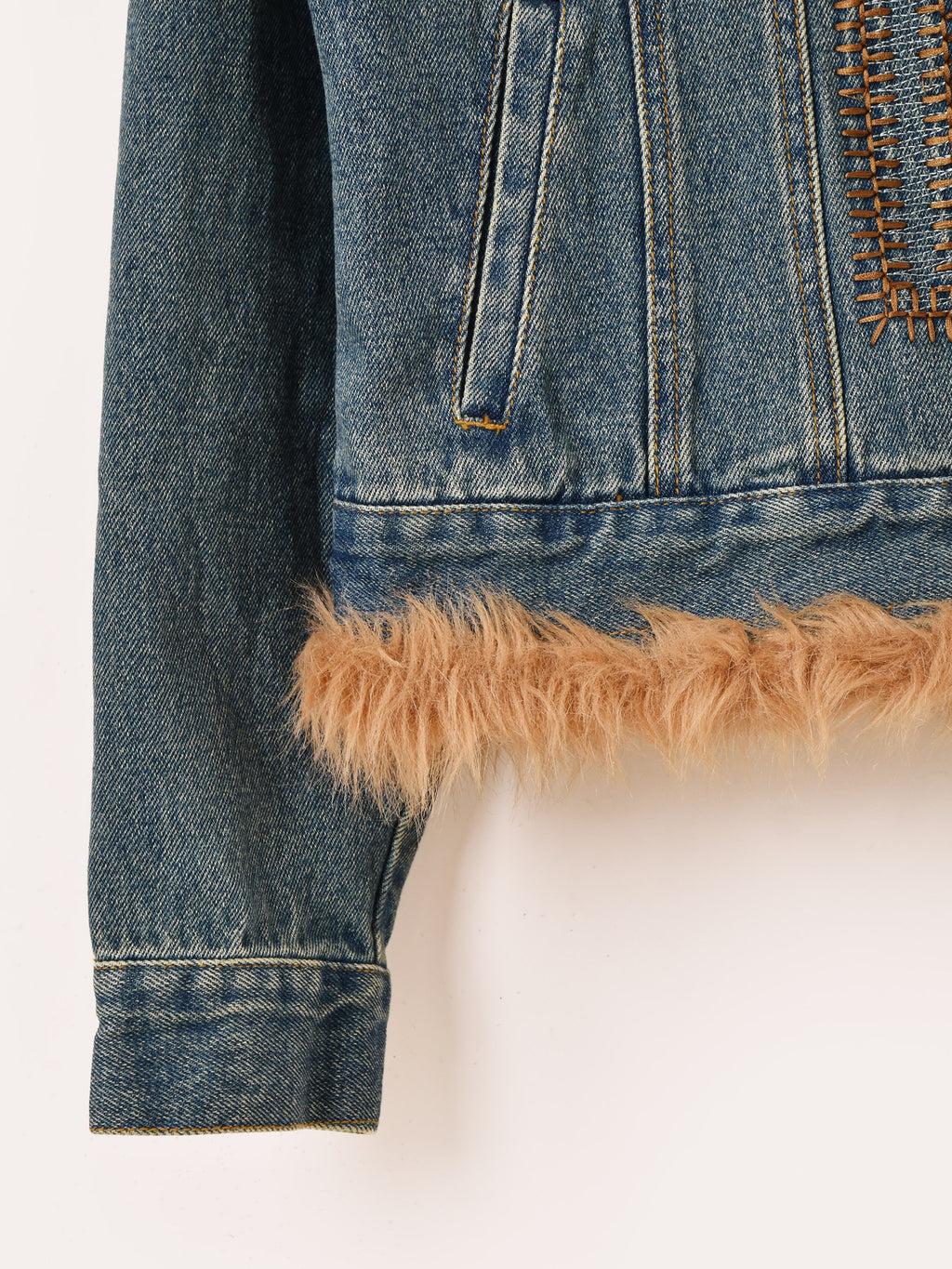 襟や袖にファーをあしらった、ゴージャスなデニムジャケット。リペアのようなつぎはぎデザインもポイント。Y2Kファッションにもおすすめの一着です。