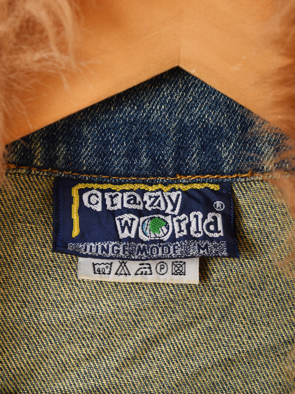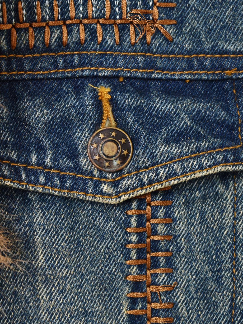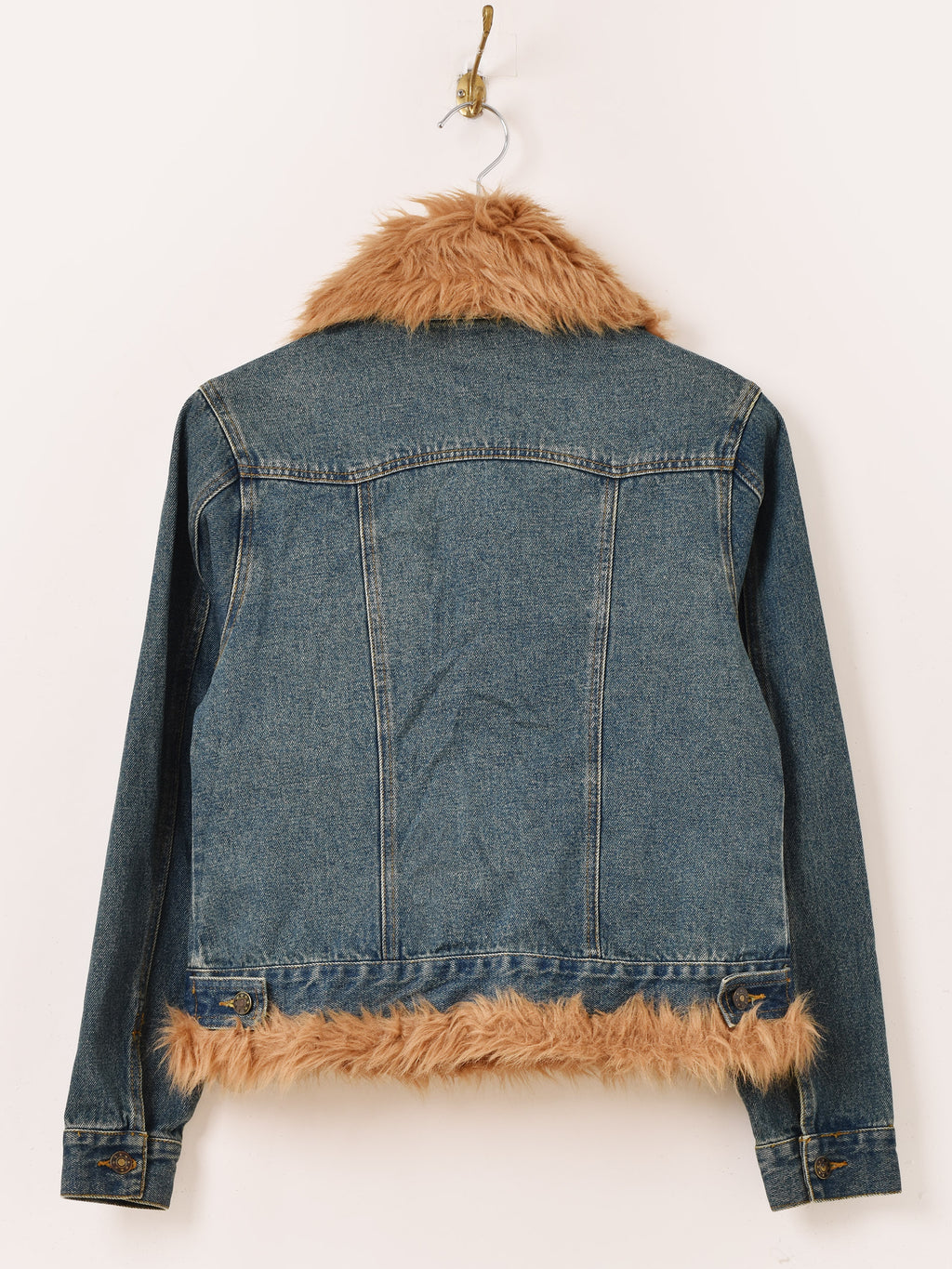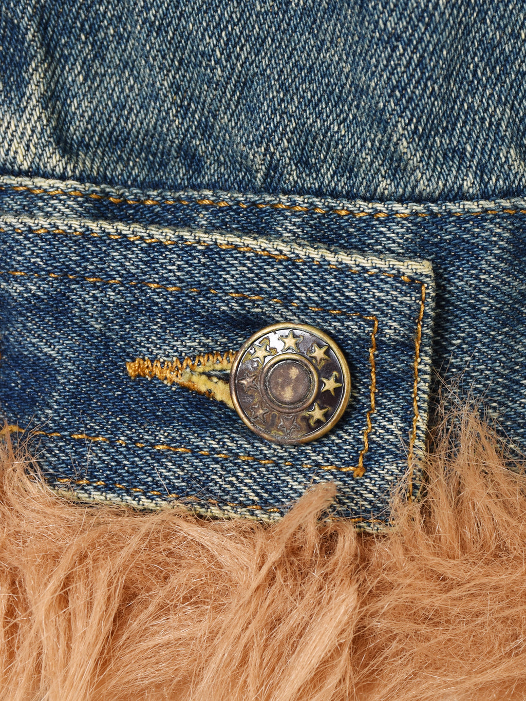 襟や袖にファーをあしらった、ゴージャスなデニムジャケット。リペアのようなつぎはぎデザインもポイント。Y2Kファッションにもおすすめの一着です。