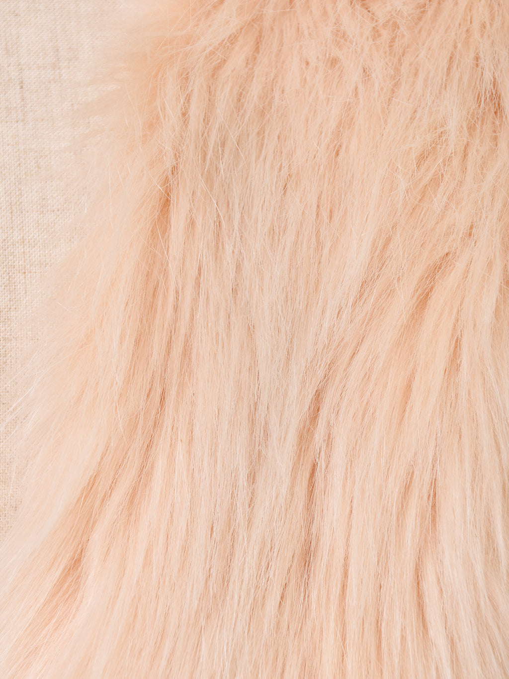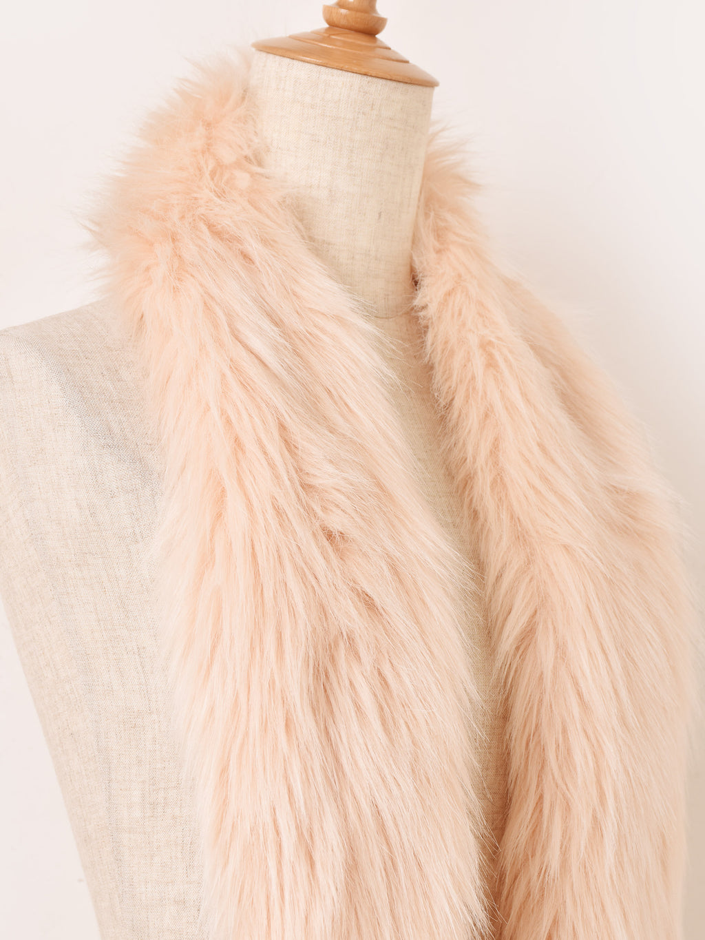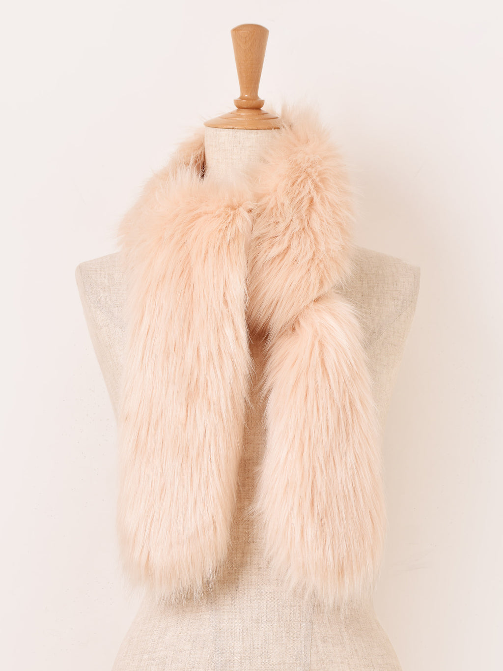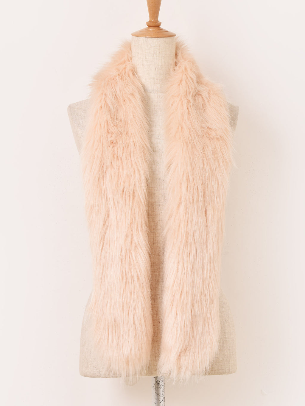 淡いピンクカラーのファーマフラー。首周りが華やかになります。腰に巻くなど、アレンジの幅も広がる一点です。