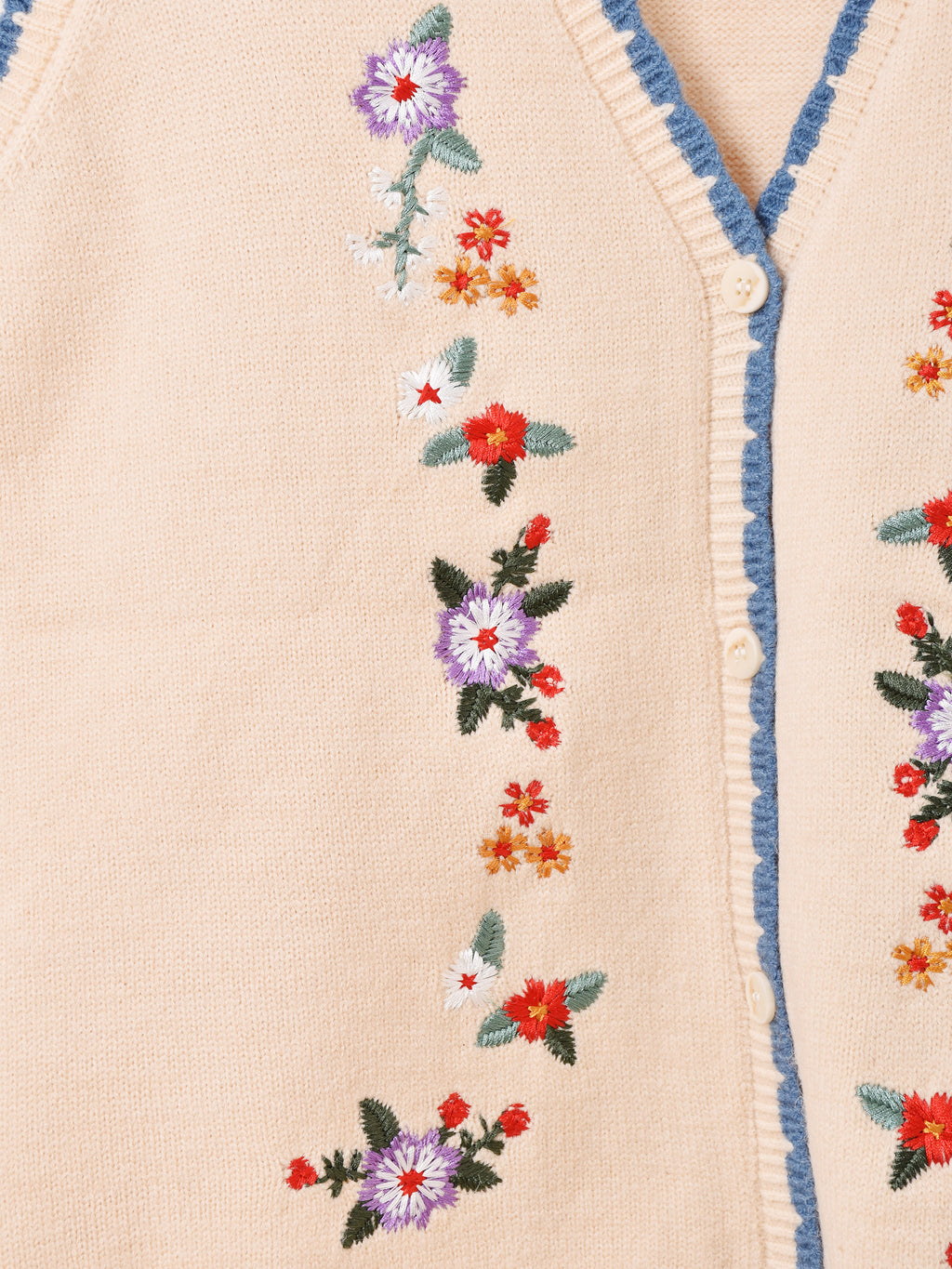花の刺繍があしらわれた前開きのニットベスト。程よい厚みの、柔らかな生地感です。
