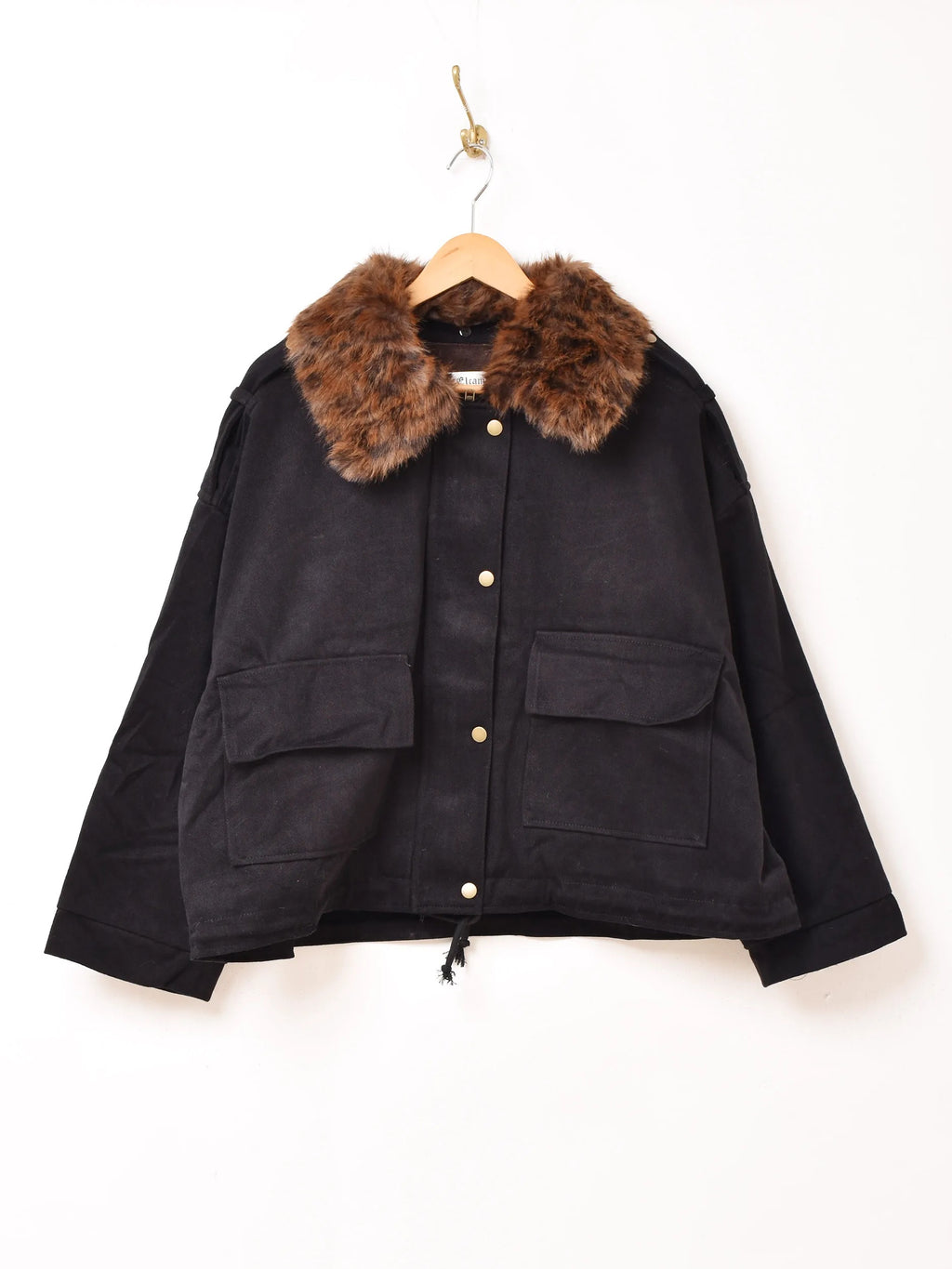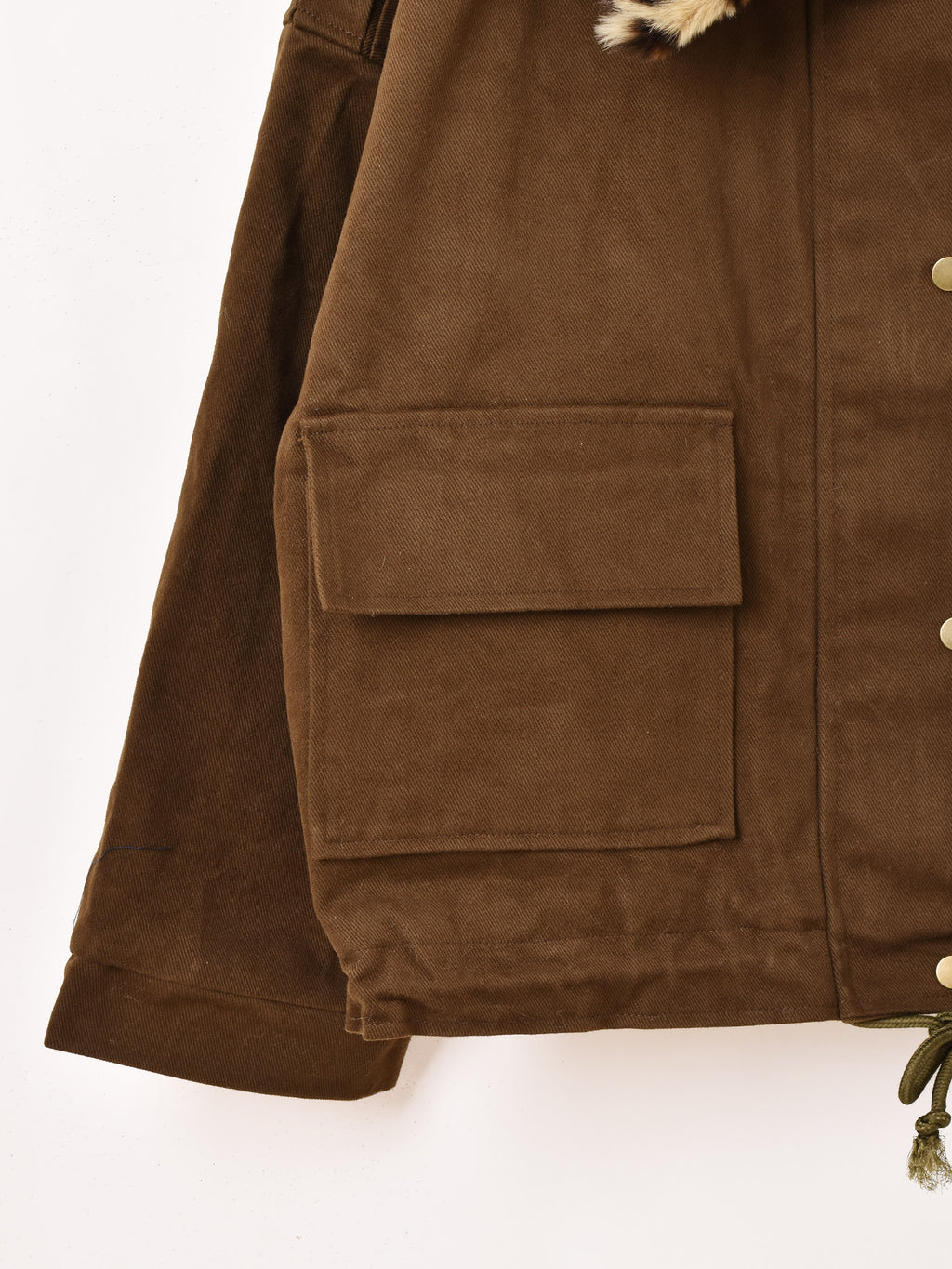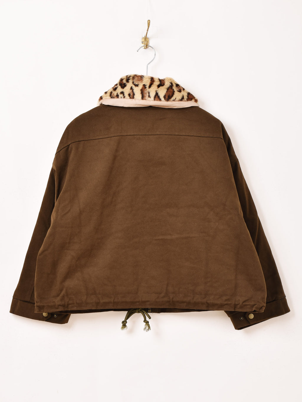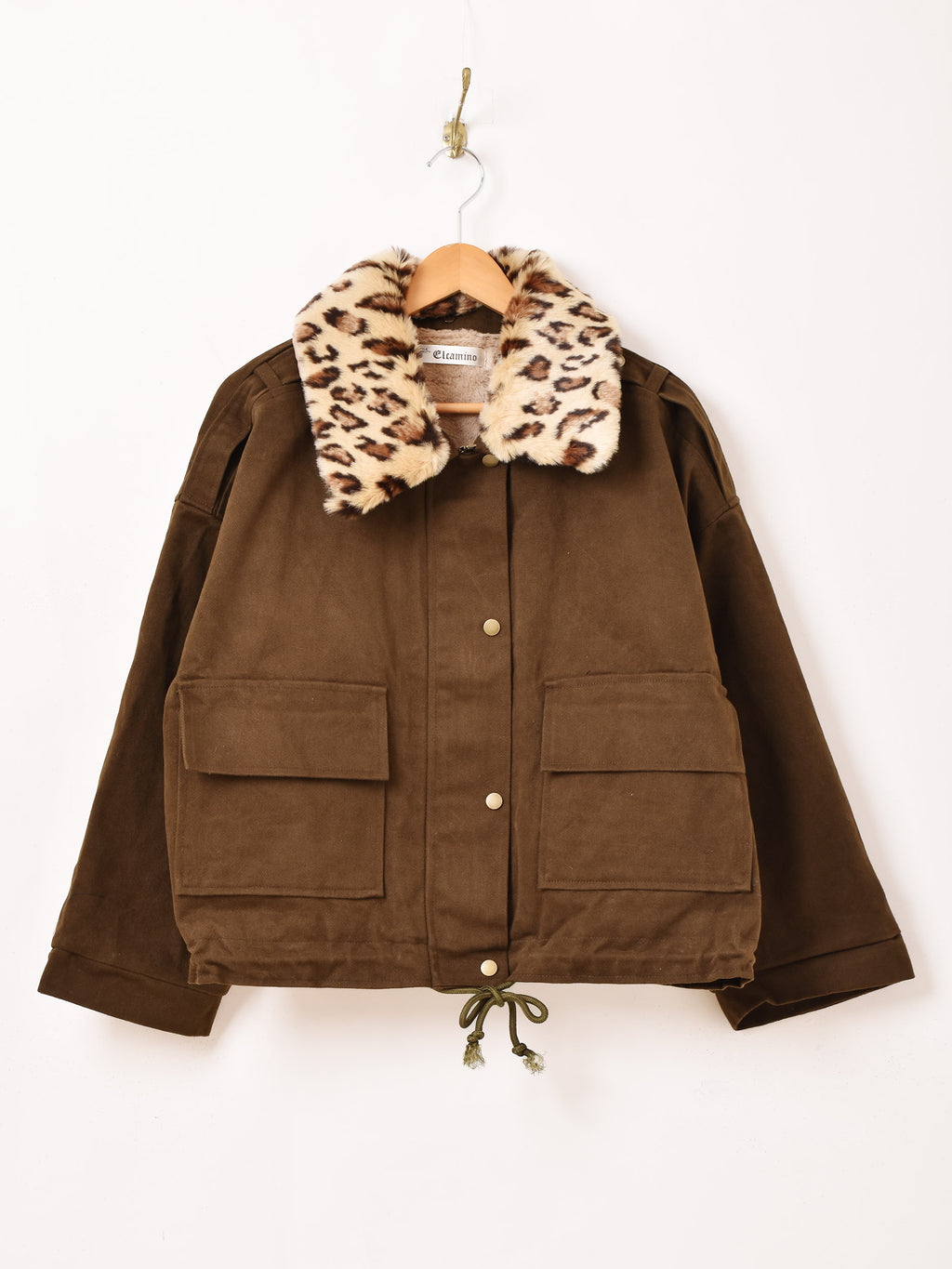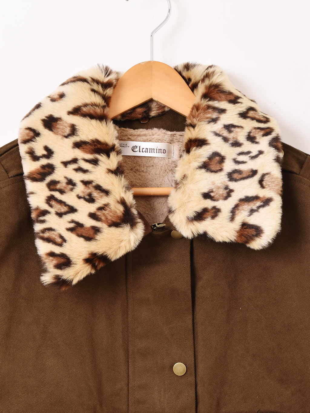 ヒョウ柄の襟と内側に施された肌触りのよいフワフワのフェイクファーが、見た目からして暖かく魅力的なジャケット。裾はドローコード付き、ファーは取り外しが可能。コンパクトなクロップド丈が様々なスタイルに合わせやすいカジュアルなデザインです。