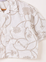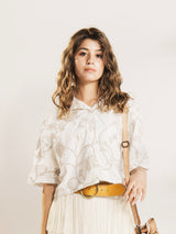 花模様に刺繍が施された開襟シャツ。ショート丈で細見え効果も期待できる一着です。