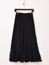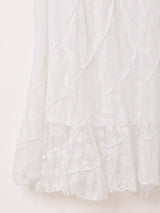 花柄とドット柄のレース生地がドッキングされたロングスカート。レース生地はスパイラル状に配されており、裾はヒラヒラとした動きのあるシルエットです。足元はレースの程よい透け感で、綺麗に見せてくれます。