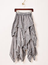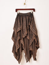 インド製のレーヨン刺繍生地で仕立てたロングスカート。刺繍のモチーフや表面のウォッシュ加工など、エスニックなデザインが魅力的な一着です。ランダムな形のフリルデザインになっており、動きのあるボリューミーなシルエットがポイントです。