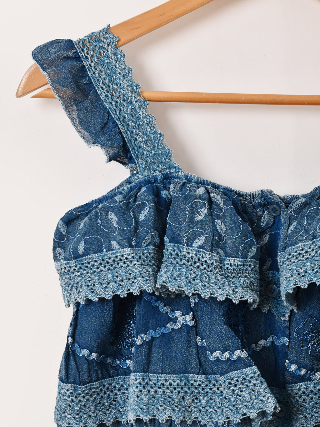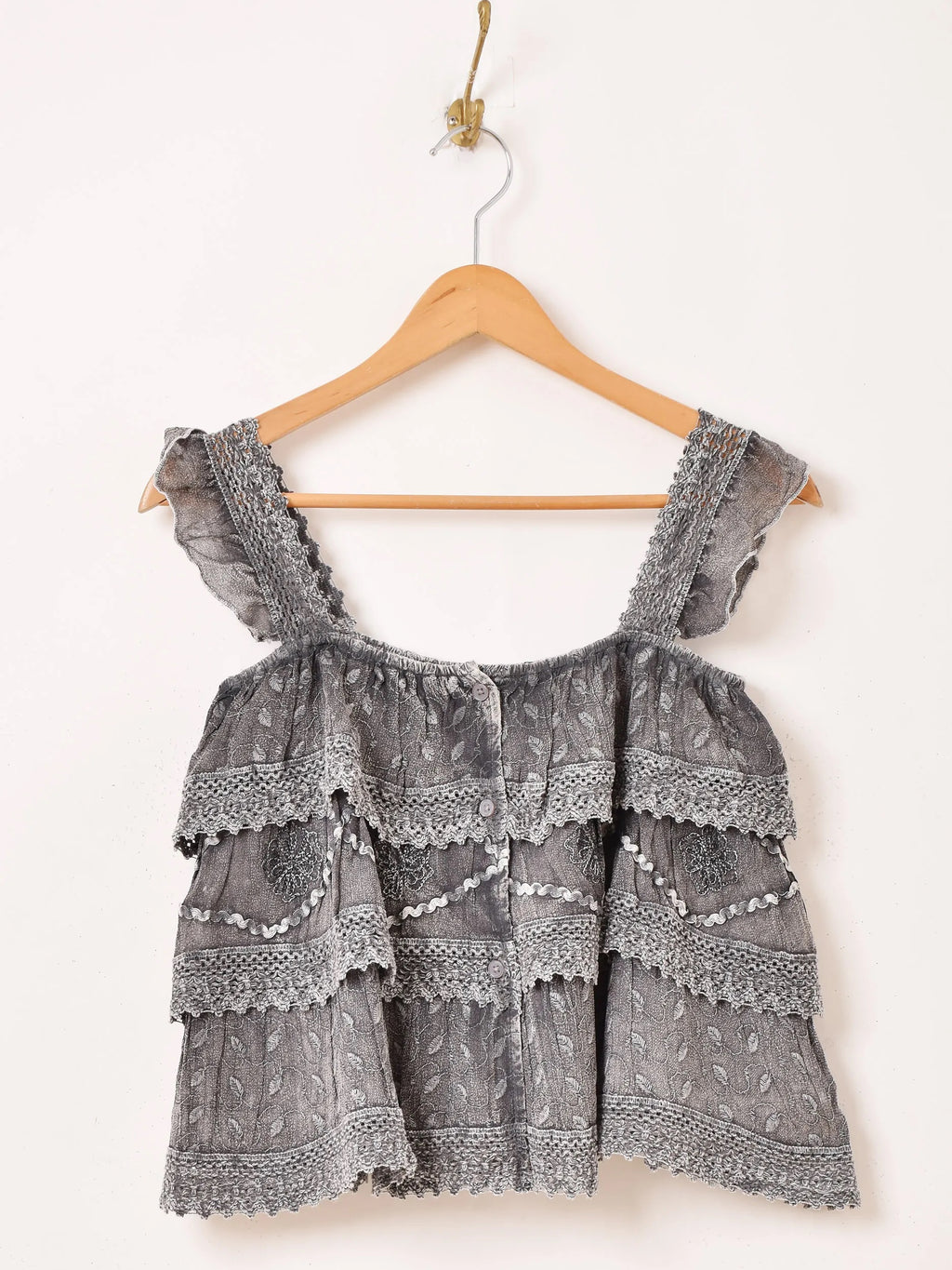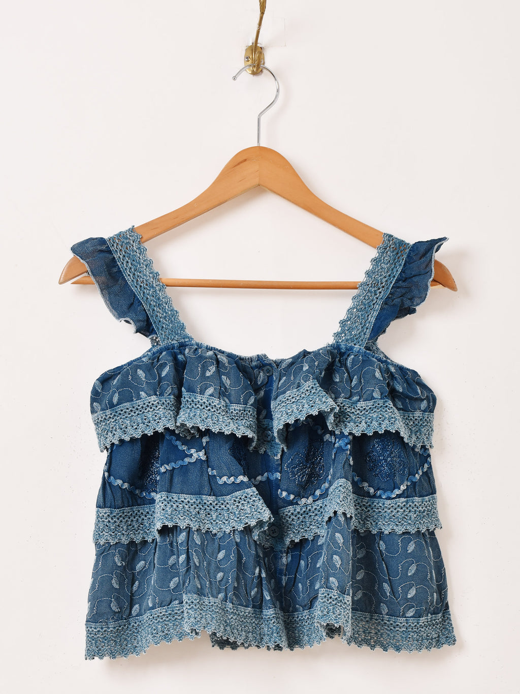 インド製のレーヨン刺繍生地で仕立てたキャミソールトップス。細かな刺繍モチーフや表面のウォッシュ加工など、エスニックなデザインが魅力的な一着です。3段のラッフルデザインになっており、ヒラヒラと動きのあるシルエットがコーデのアクセントになります。