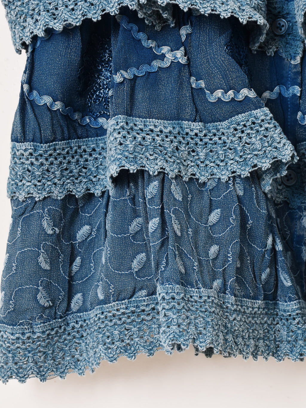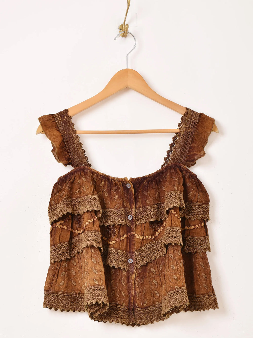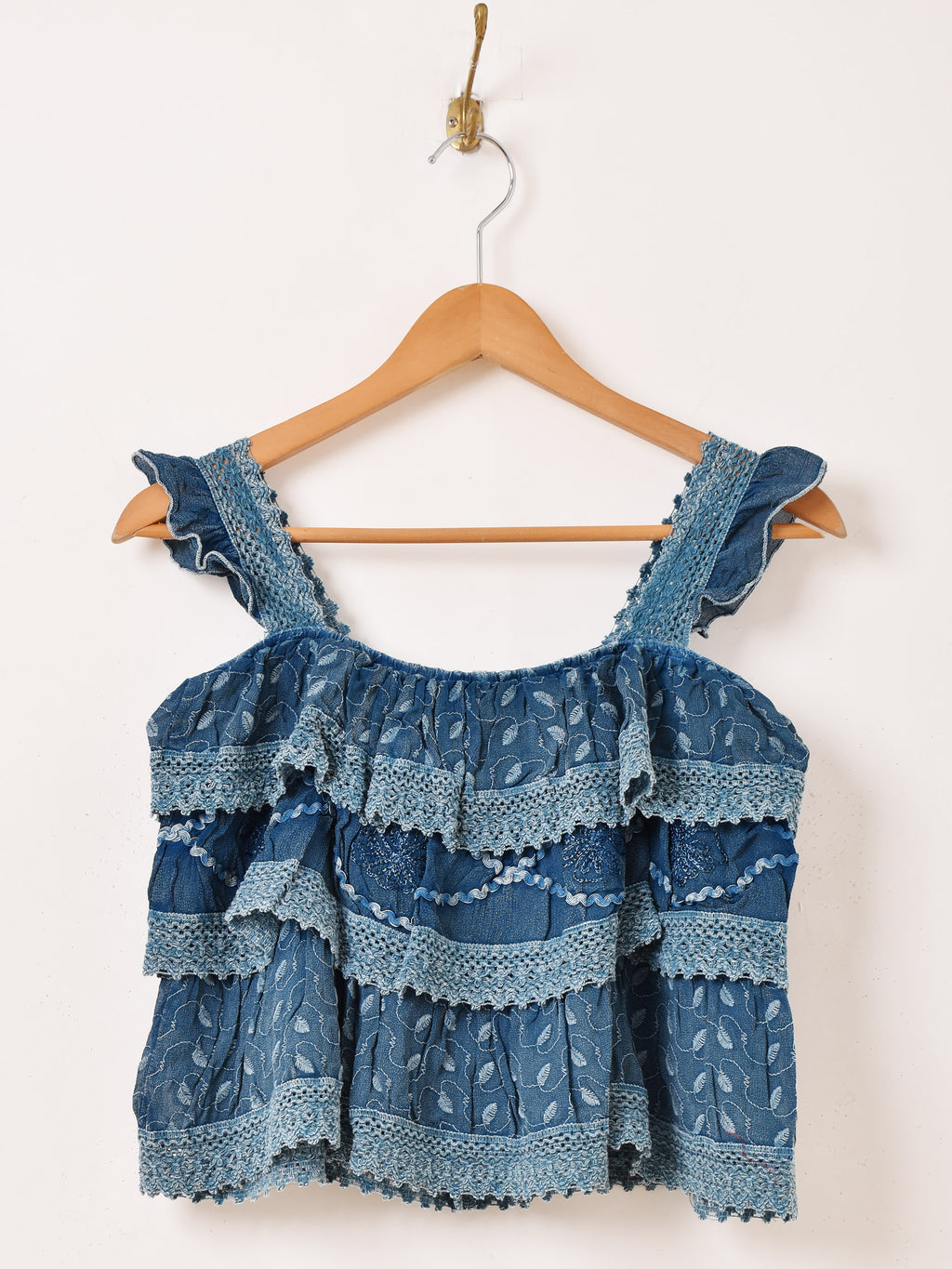 インド製のレーヨン刺繍生地で仕立てたキャミソールトップス。細かな刺繍モチーフや表面のウォッシュ加工など、エスニックなデザインが魅力的な一着です。3段のラッフルデザインになっており、ヒラヒラと動きのあるシルエットがコーデのアクセントになります。