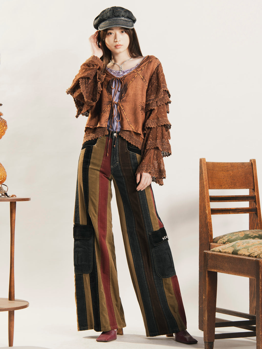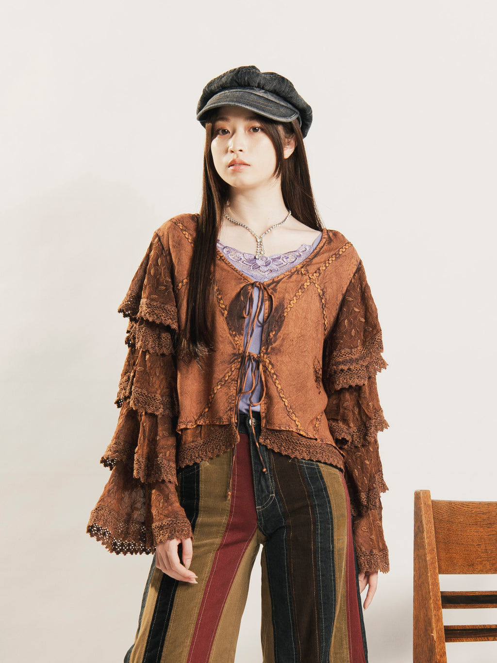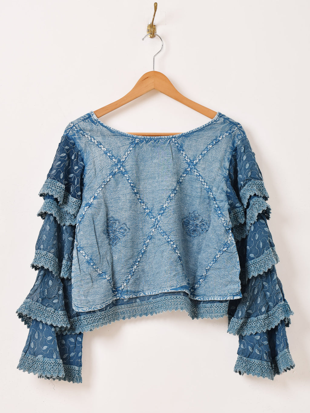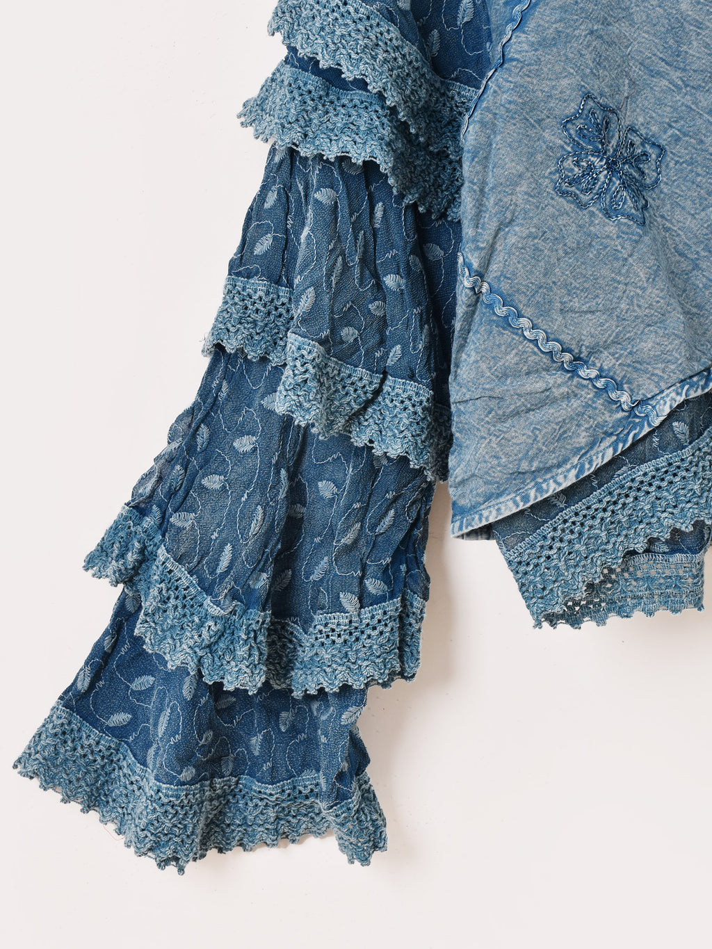 インド製のレーヨン刺繍生地で仕立てたブラウス。細かな刺繍モチーフや表面のウォッシュ加工など、エスニックなデザインが魅力的な一着です。袖のラッフルデザインがポイント。ショート丈でスタイルアップしつつ、コーデに華やかさを添えてくれます。