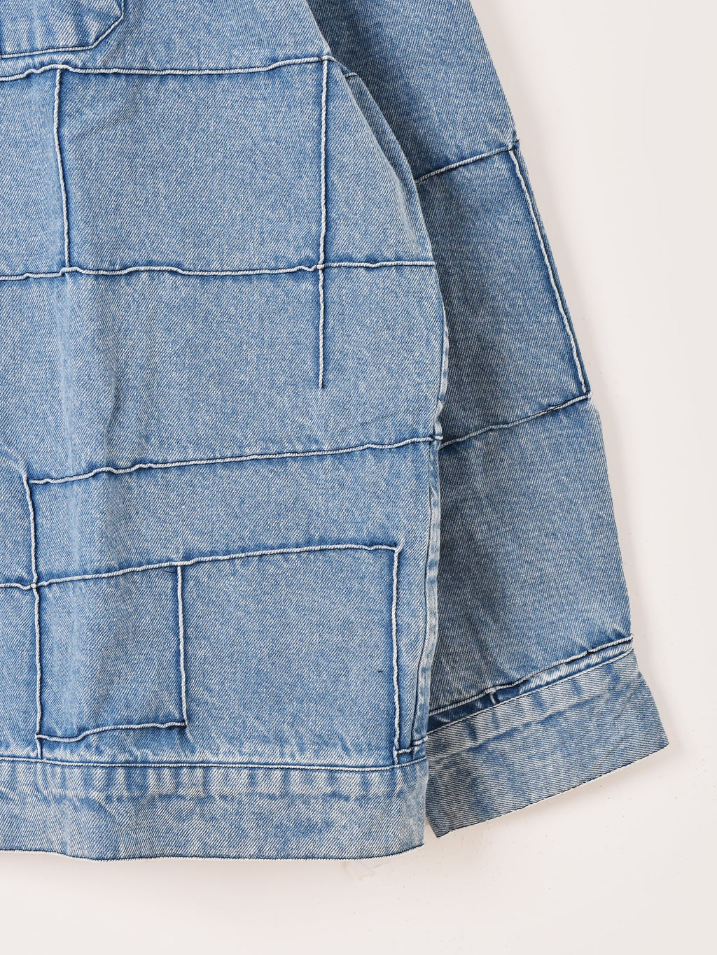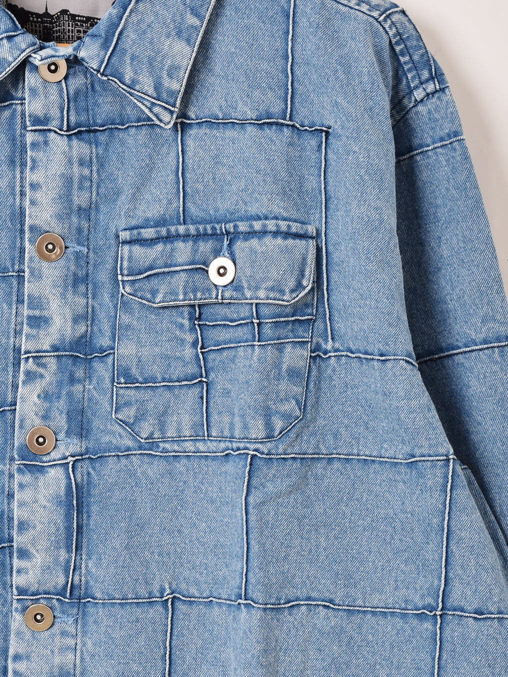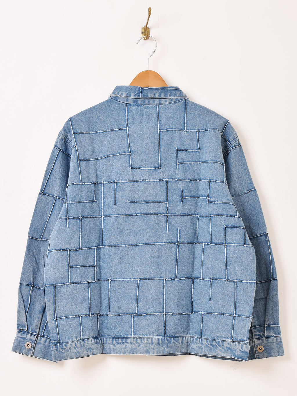 パッチワーク風に織り上げられたデニム生地のジャケット。エッジの効いたデザインに、ゆとりを持たせたオーバーなサイズ感でこなれた雰囲気に仕上げてくれます。ユニセックスでも着用できる一着です。