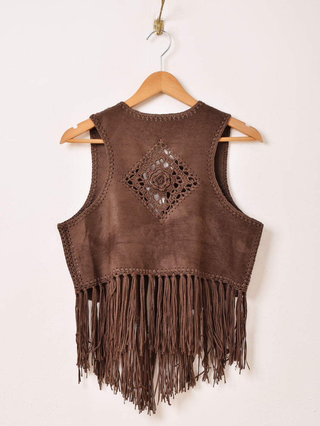 フェイクスエードとかぎ編みのドッキングデザインが可愛いフリンジベスト。古着のようなクラフト感のあるテイストが魅力的。レイヤードコーデのアクセントに重宝する一着です。