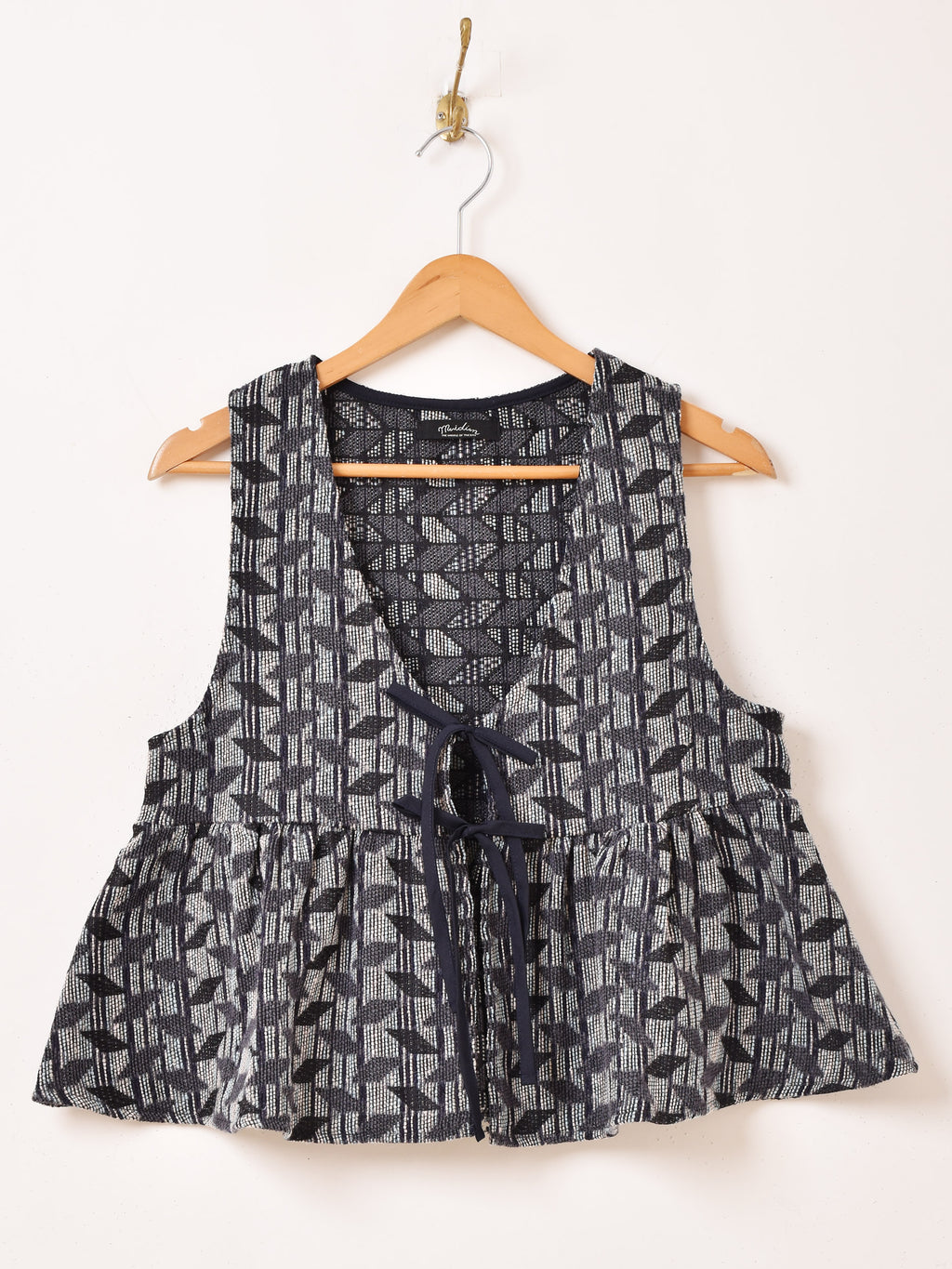 ジオメトリックパターンのタペストリー生地で仕立てたベスト。ふんわりペプラムシルエットで体型カバーしつつ、Y2Kスタイルなどのレイヤードアレンジが楽しめます。