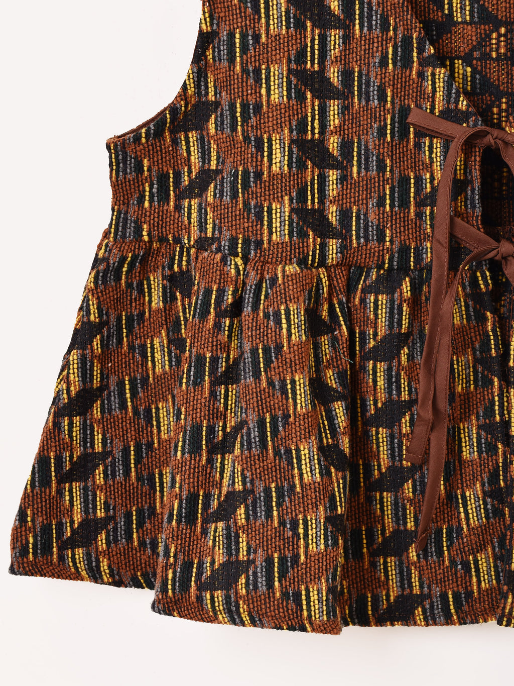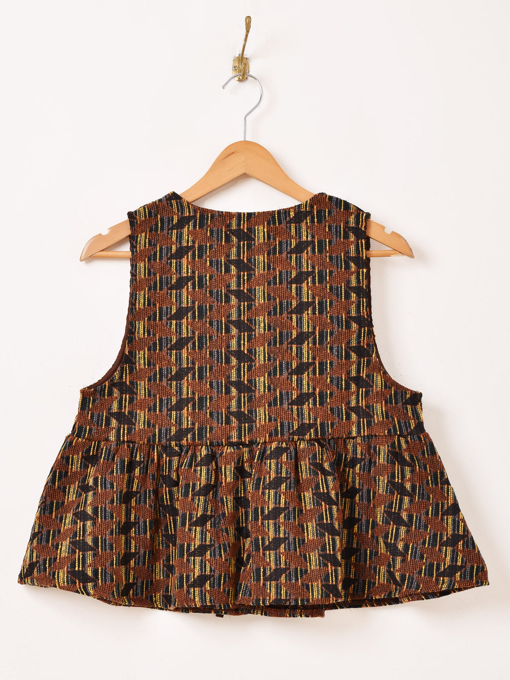 ジオメトリックパターンのタペストリー生地で仕立てたベスト。ふんわりペプラムシルエットで体型カバーしつつ、Y2Kスタイルなどのレイヤードアレンジが楽しめます。