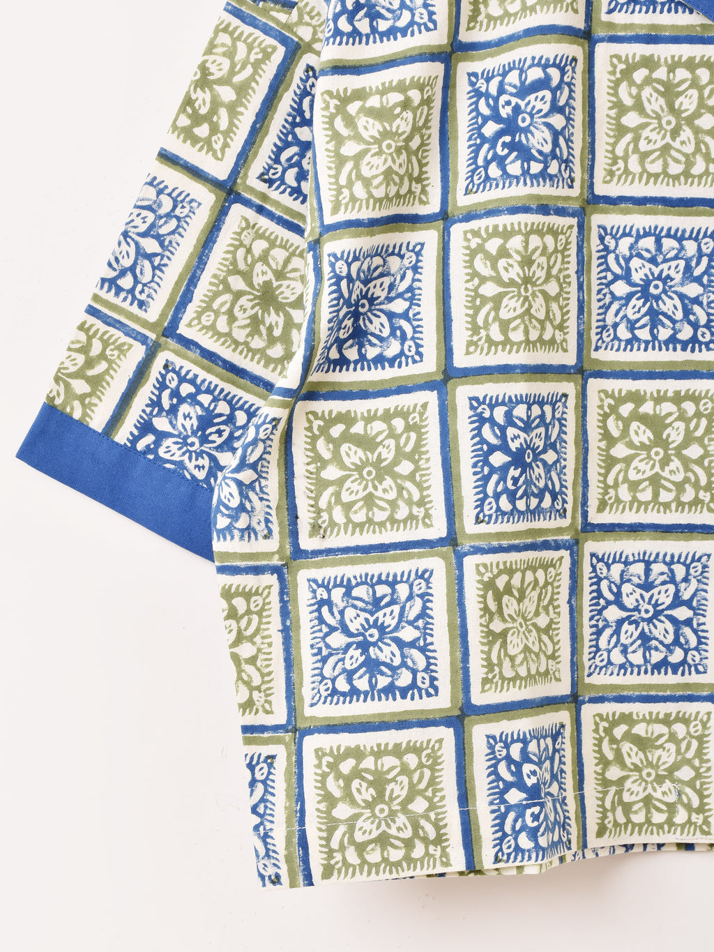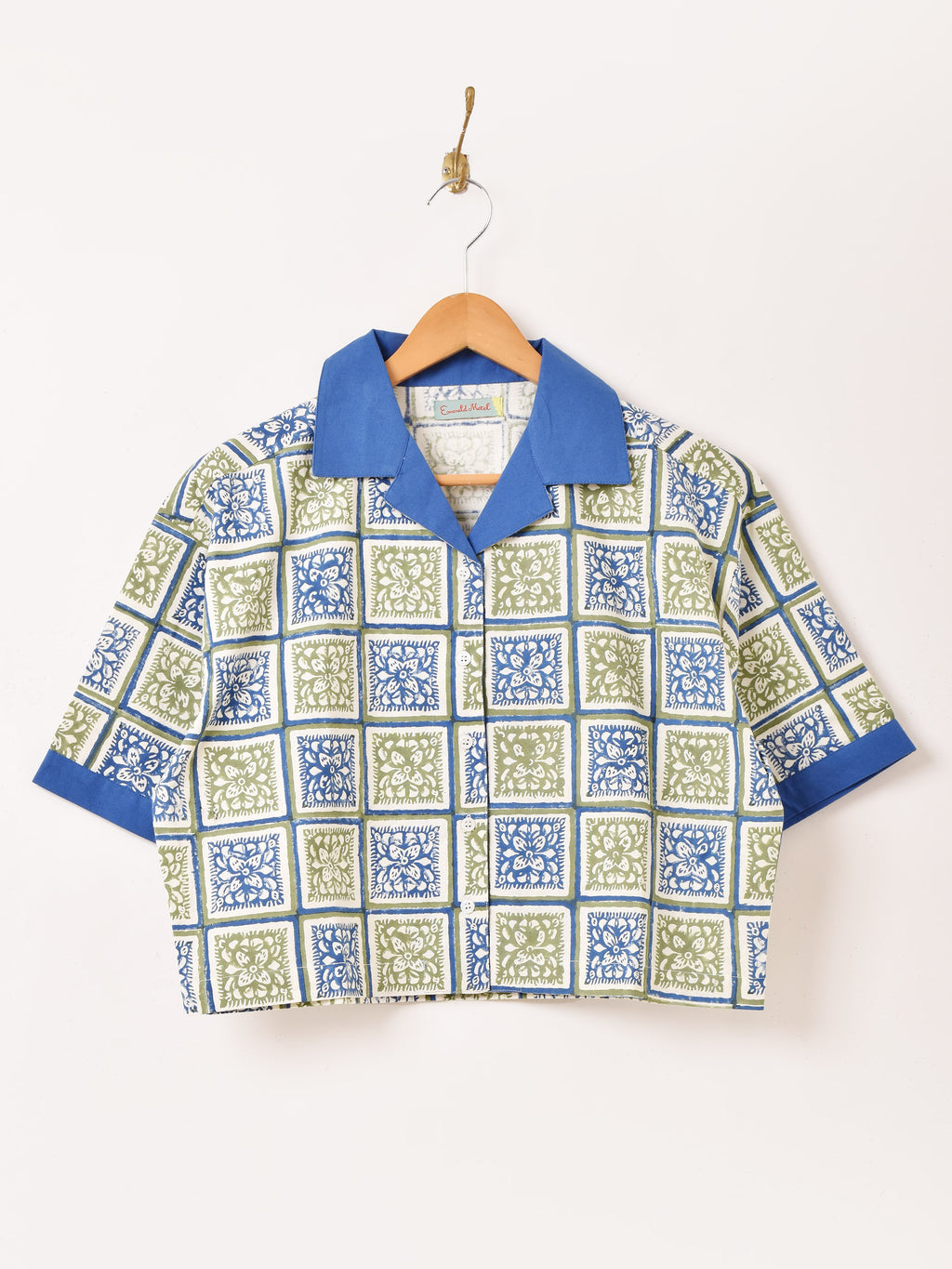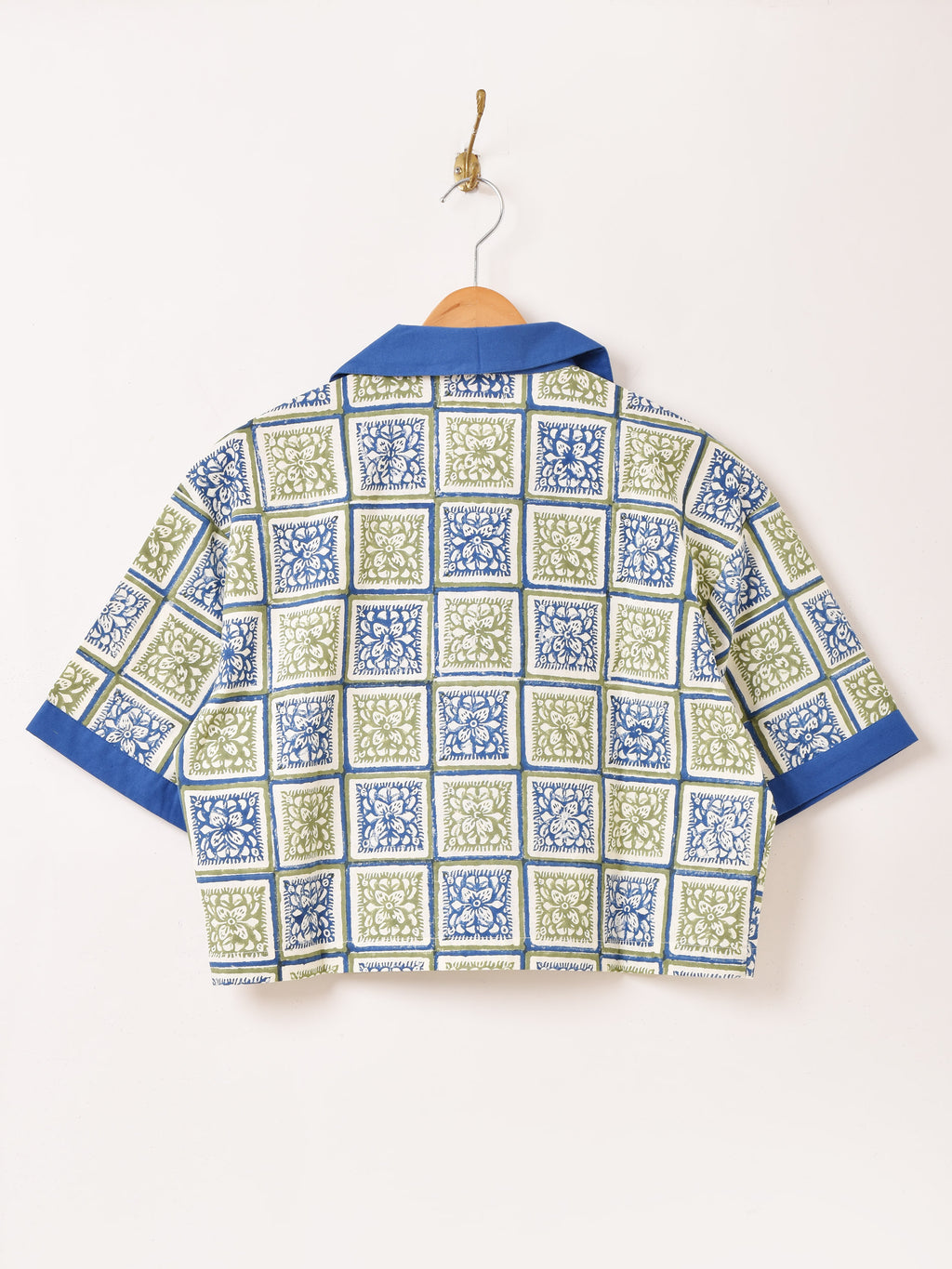インドの伝統的な染色方法「ブロックプリント」を用い手作業で柄を施した生地で仕立てた半袖シャツ。エスニックなデザインと風合いの良いコットン生地が魅力的な一着。クロップド丈なのでスタイル良くヘルシーな印象に着こなせます。