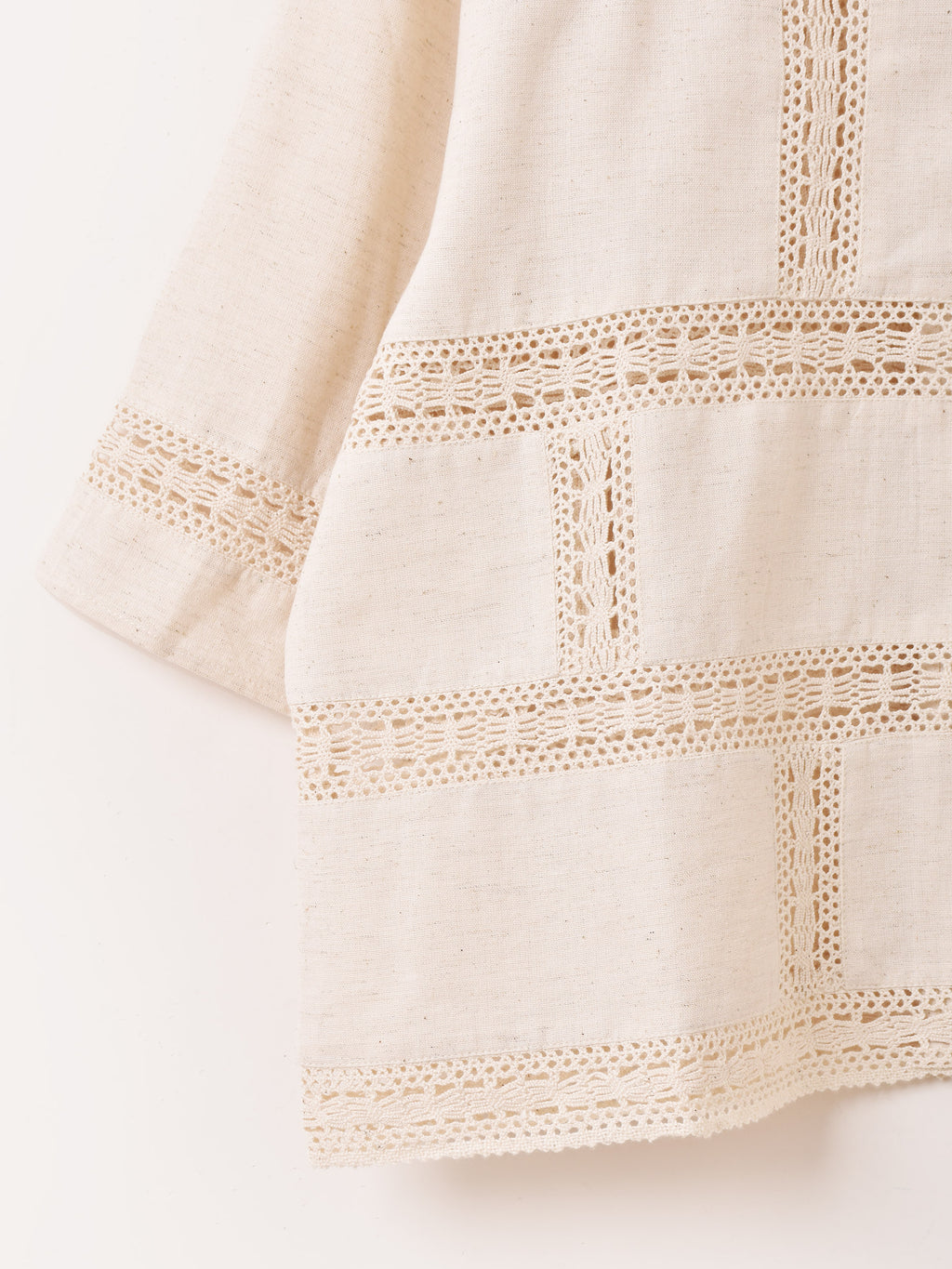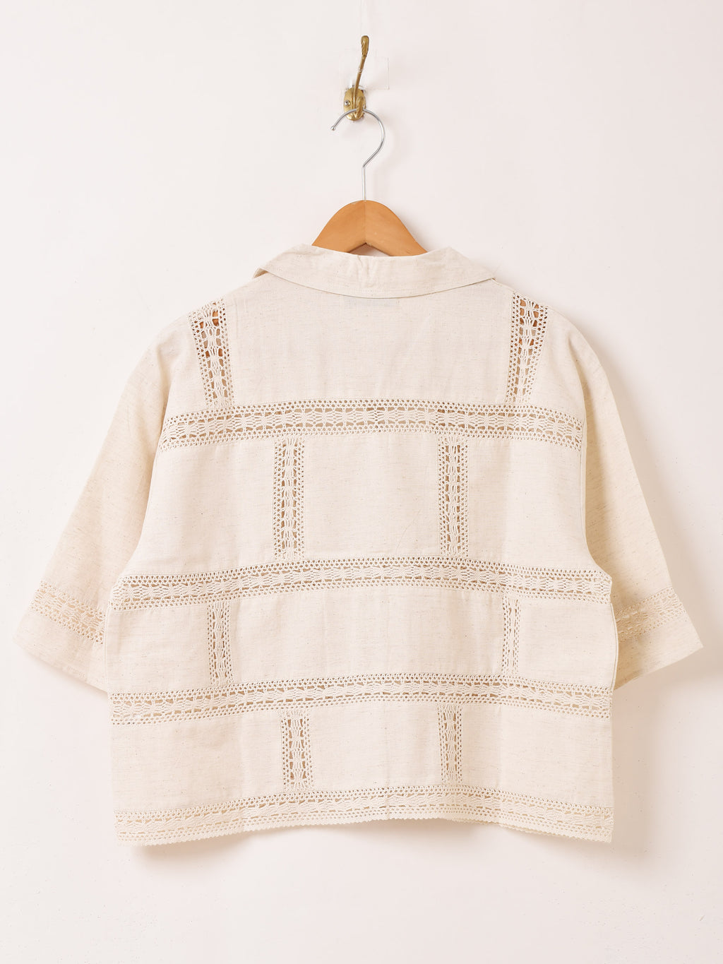 透かし編みのカギ編みレースがアクセントになった半袖シャツ。コットンリネンの風合いが良い一着。ゆったりとしたサイズ感で、インナー次第で様々な印象を楽しめます。