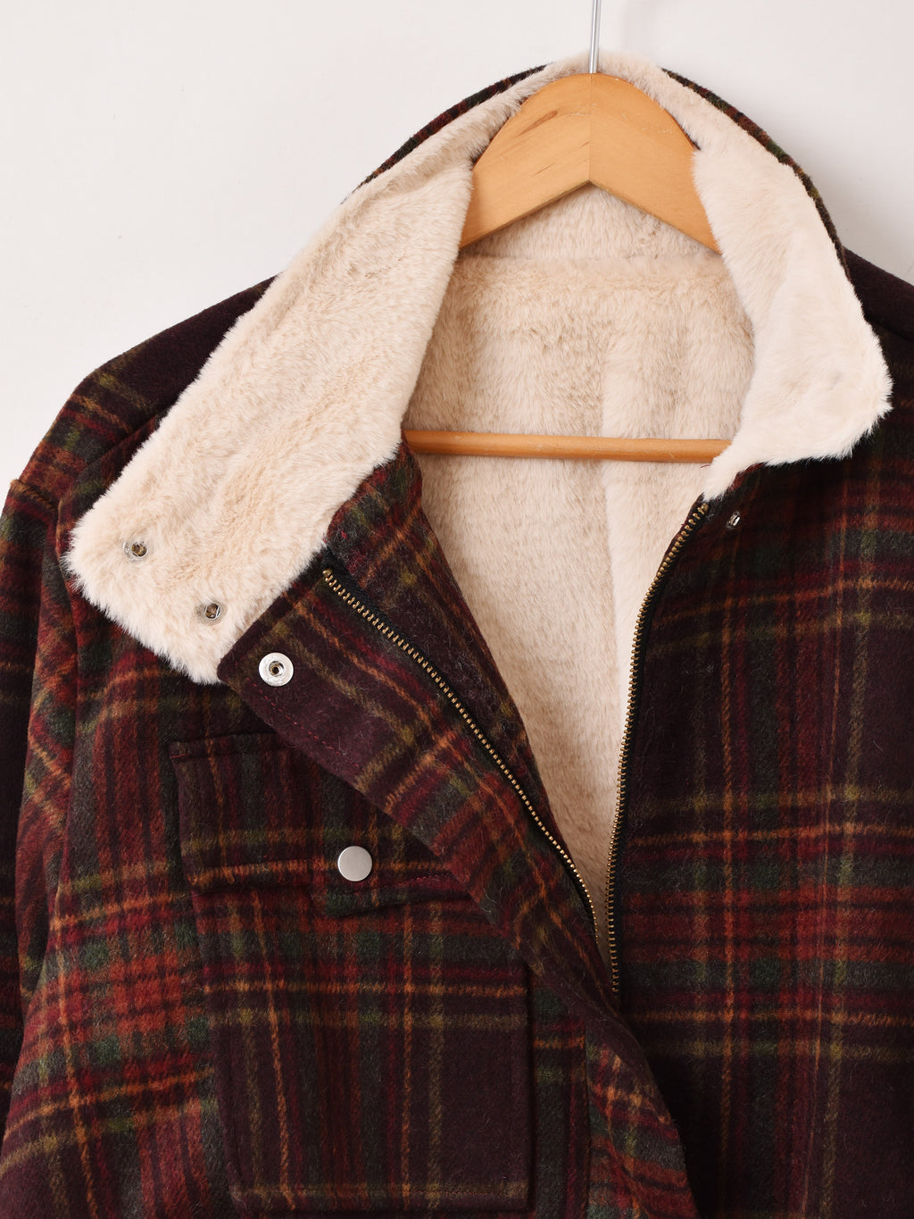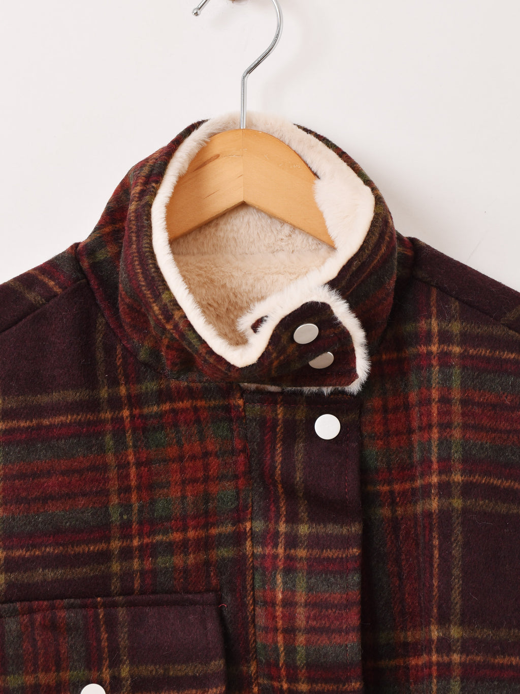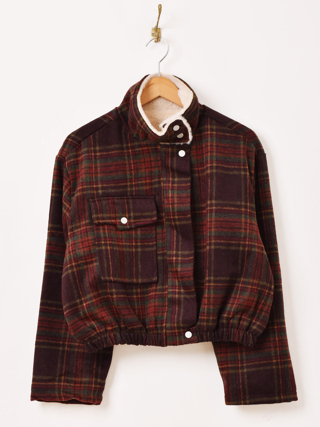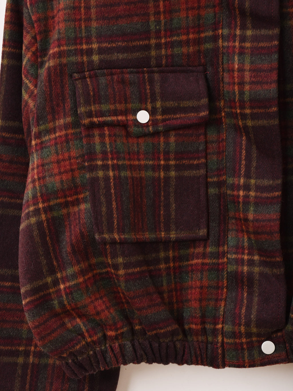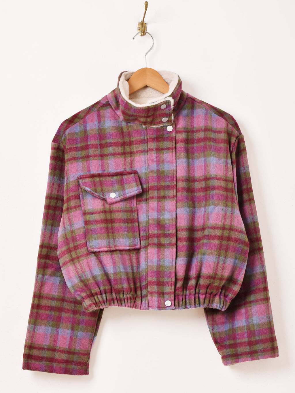 カラフルなチェック柄のブルゾンジャケット。ライニングは肌触りの良いファー仕様になっており、防寒もバッチリ。裾にゴムが効いたショート丈で、ボリューム感たっぷりのシルエットながらもいろいろなボトムスとも相性良く着こなせます。