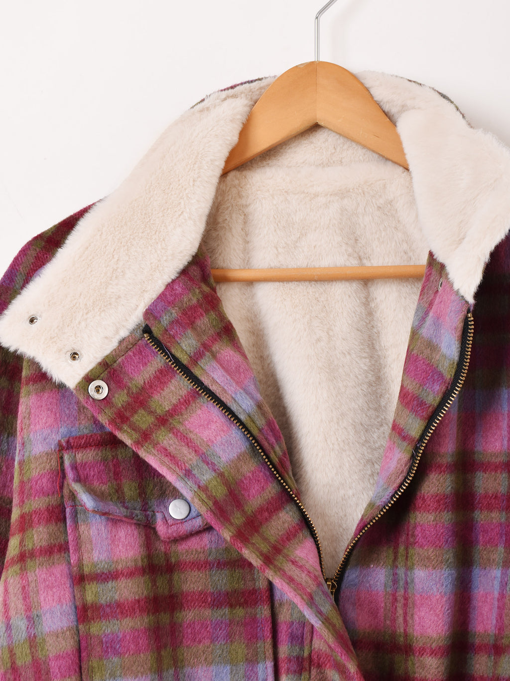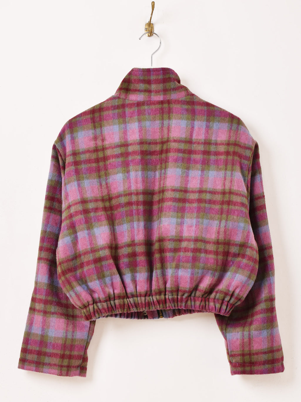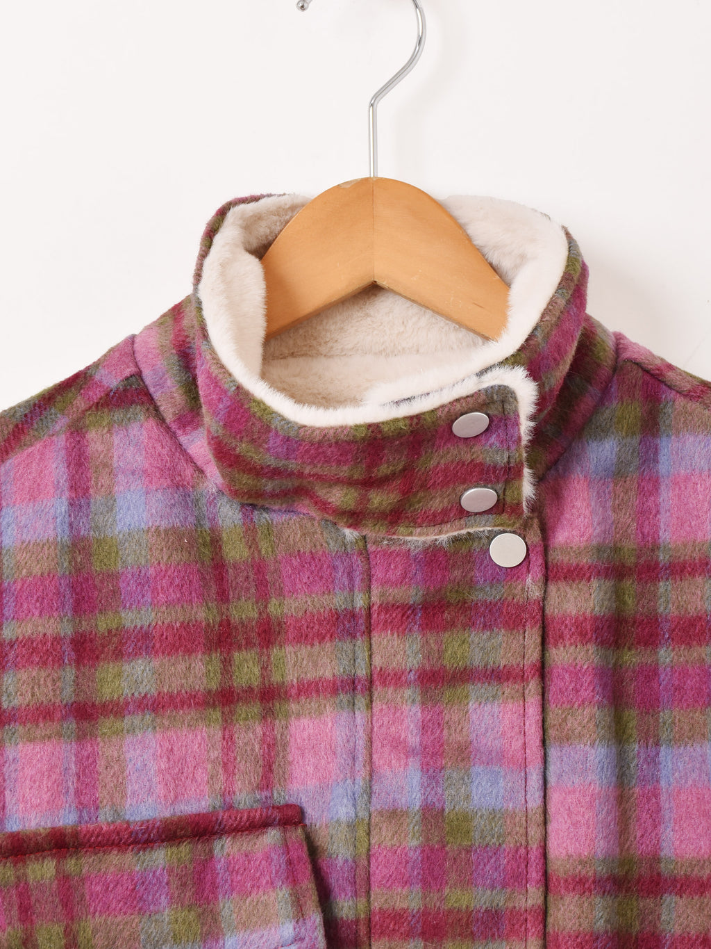 カラフルなチェック柄のブルゾンジャケット。ライニングは肌触りの良いファー仕様になっており、防寒もバッチリ。裾にゴムが効いたショート丈で、ボリューム感たっぷりのシルエットながらもいろいろなボトムスとも相性良く着こなせます。