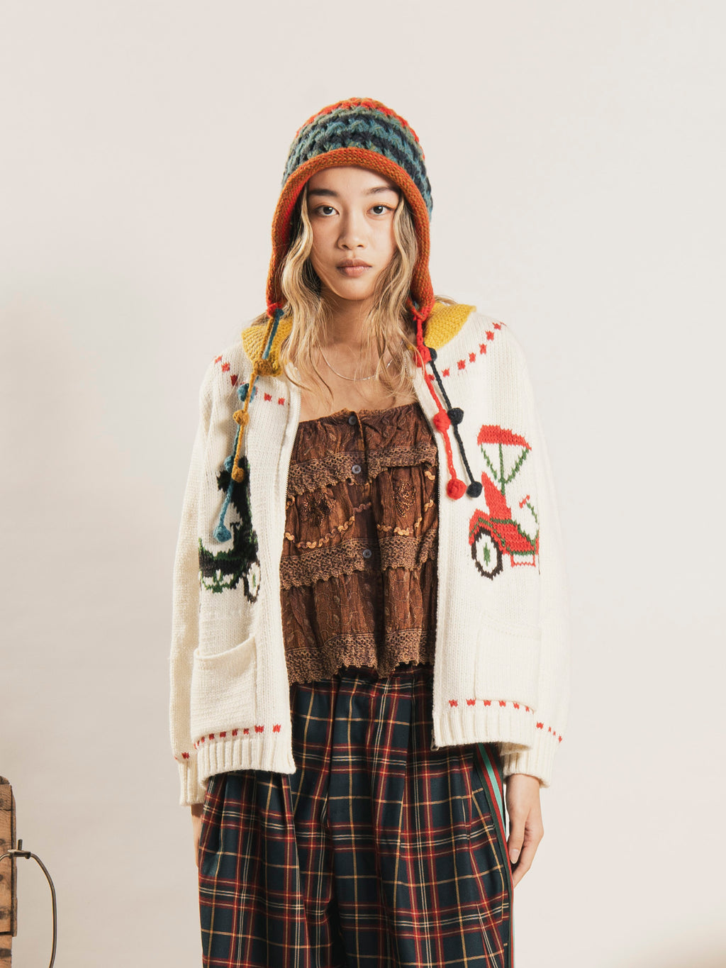 クラシックな車のモチーフが編まれた、古着っぽいデザインが魅力的なカウチンセーター。着るだけで季節感のあるコーディネートに仕上げてくれます。しっかりと厚みのあるアクリルウールで仕立てた、あたたかみのある一着です。
